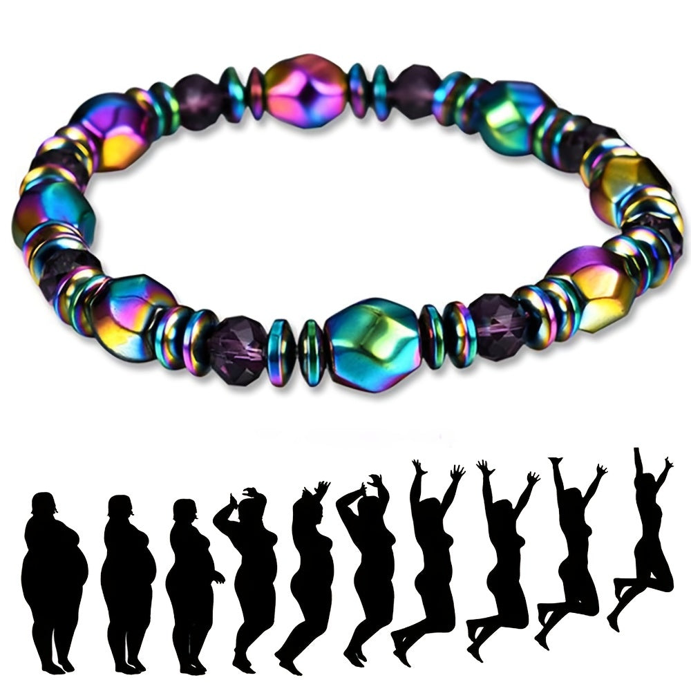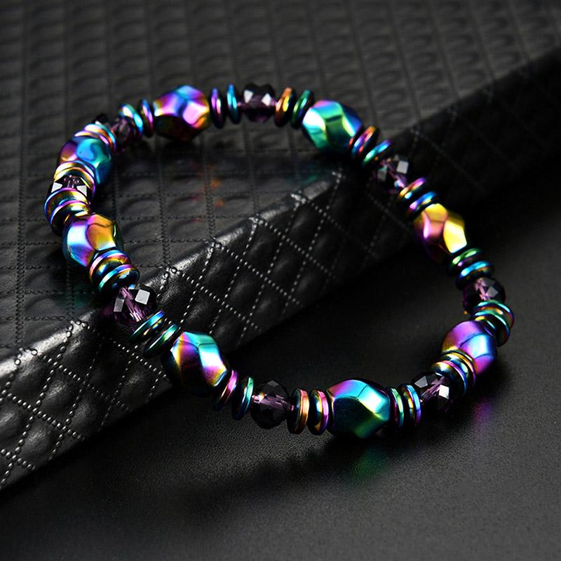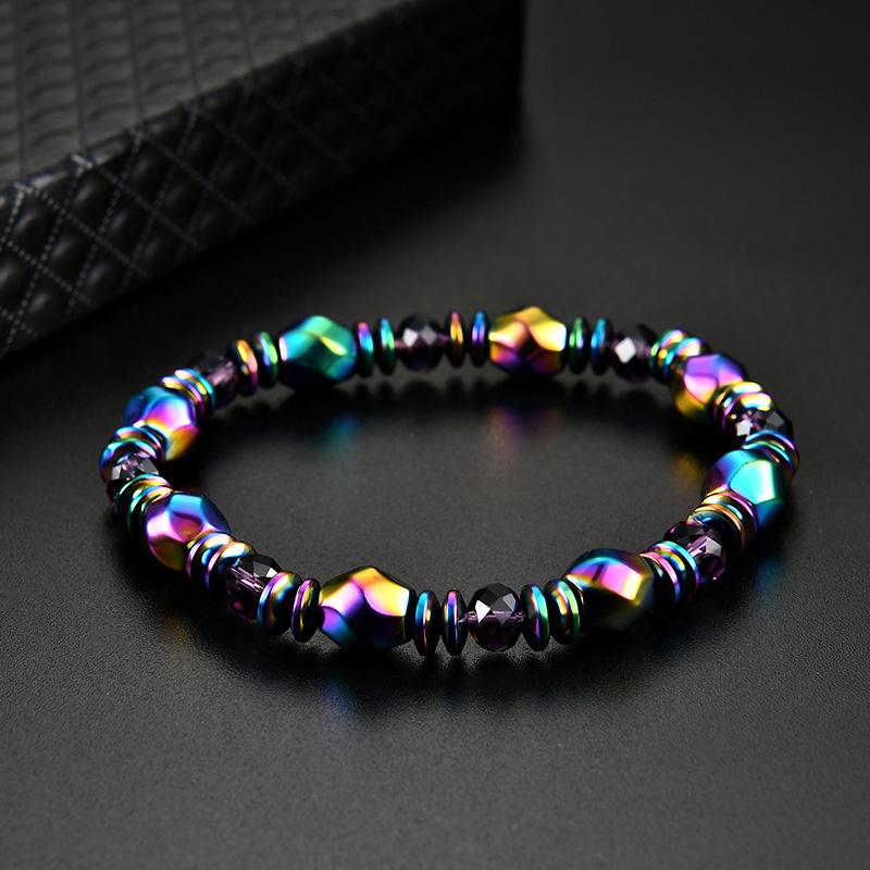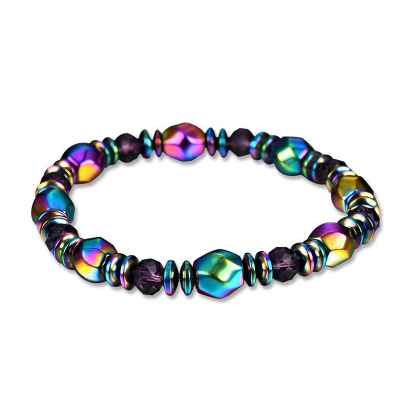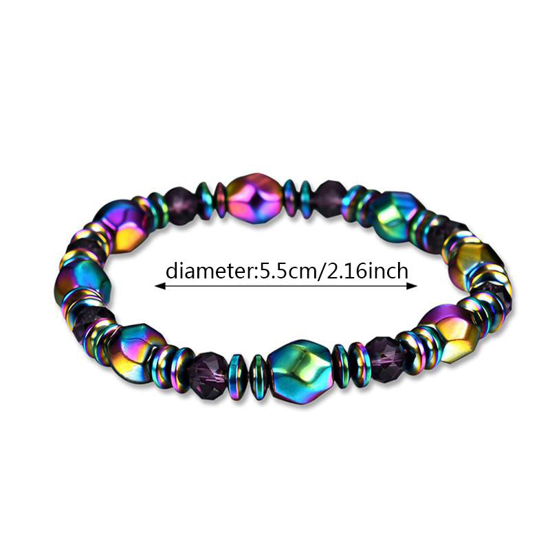 This unisex bracelet is made of natural stone beads with hematite, offering a colorful and stretchable design.