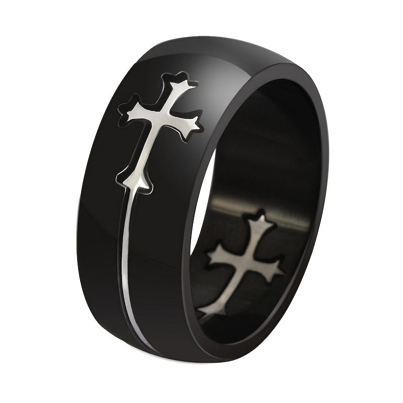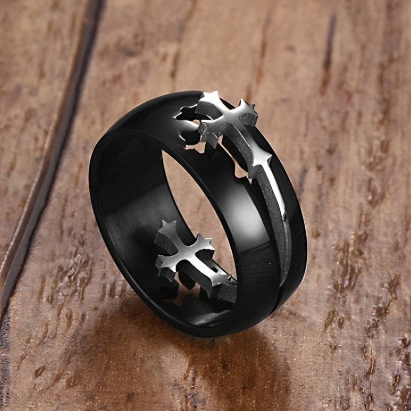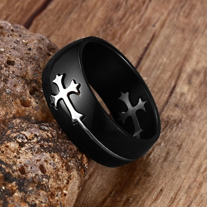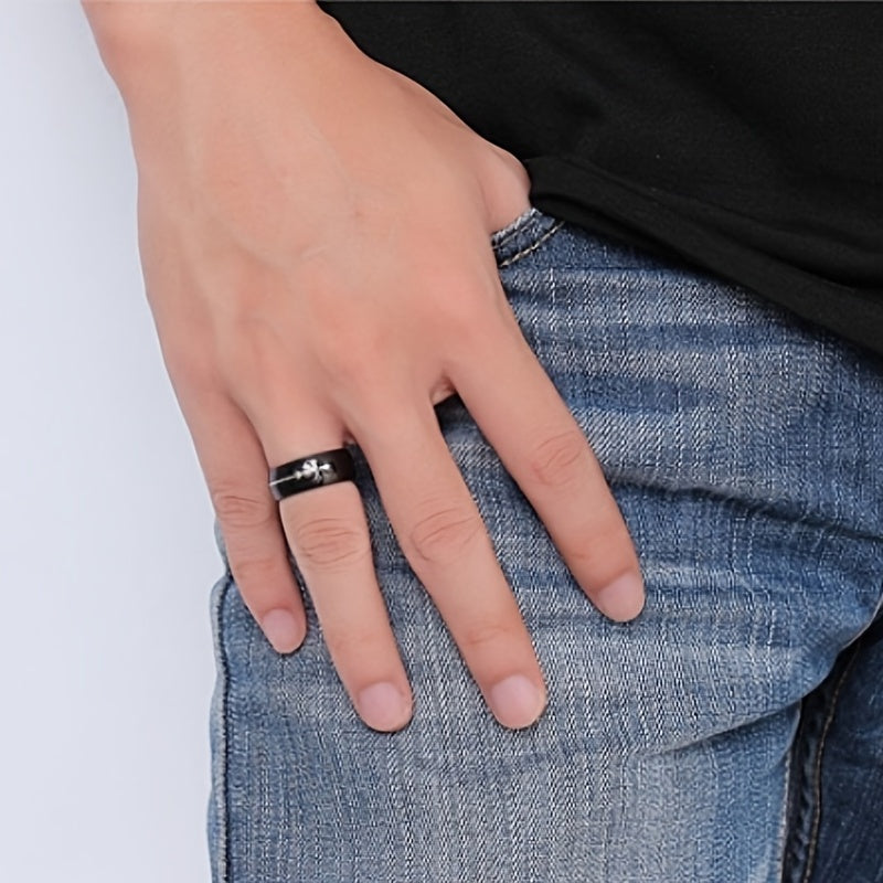 This unique stainless steel ring features a creative cross inlaid circle design, making it a charming piece of jewelry for men.