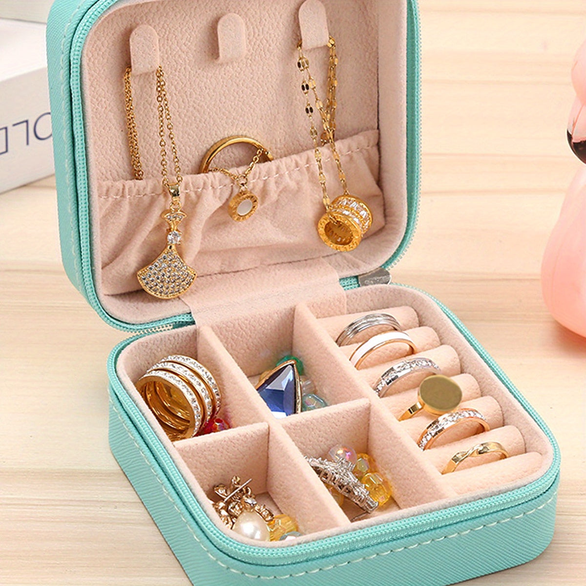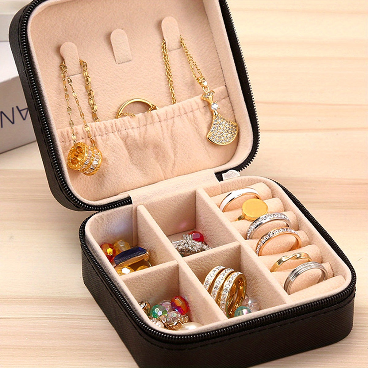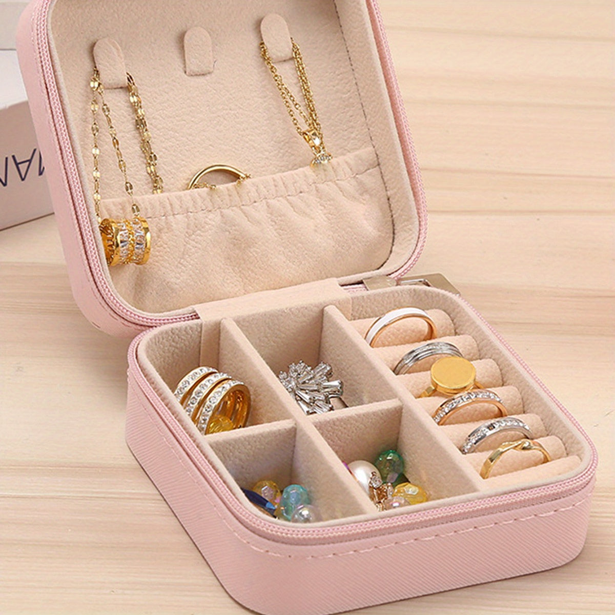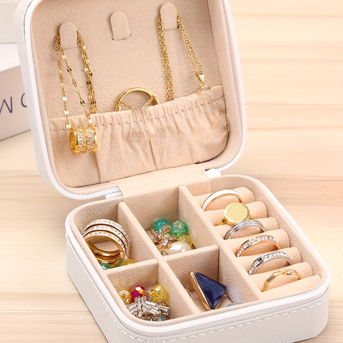 Keep your jewelry organized and secure with this classic square storage box. Perfect for storing earrings, rings, necklaces, and bracelets.