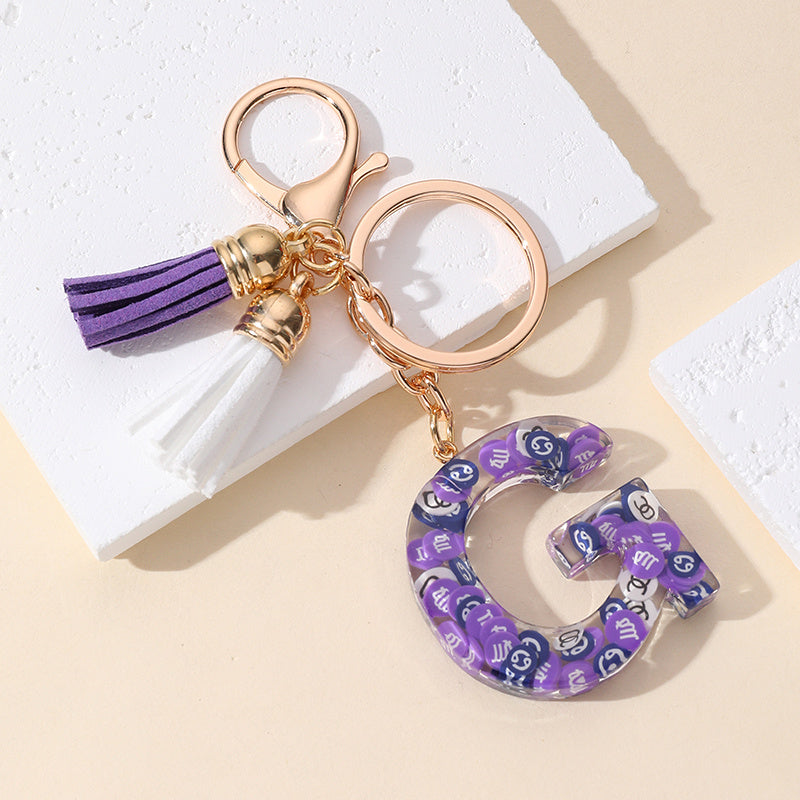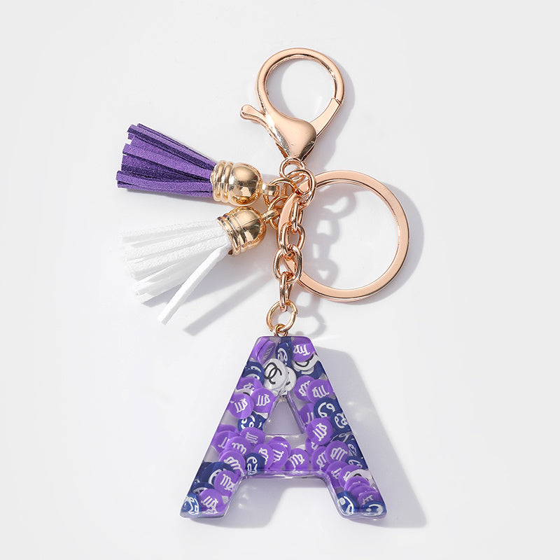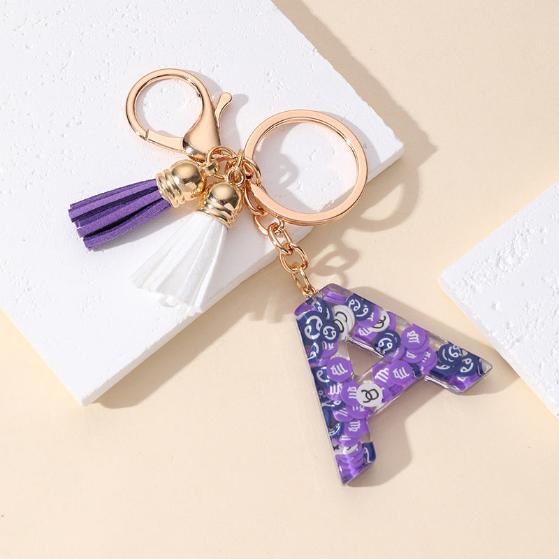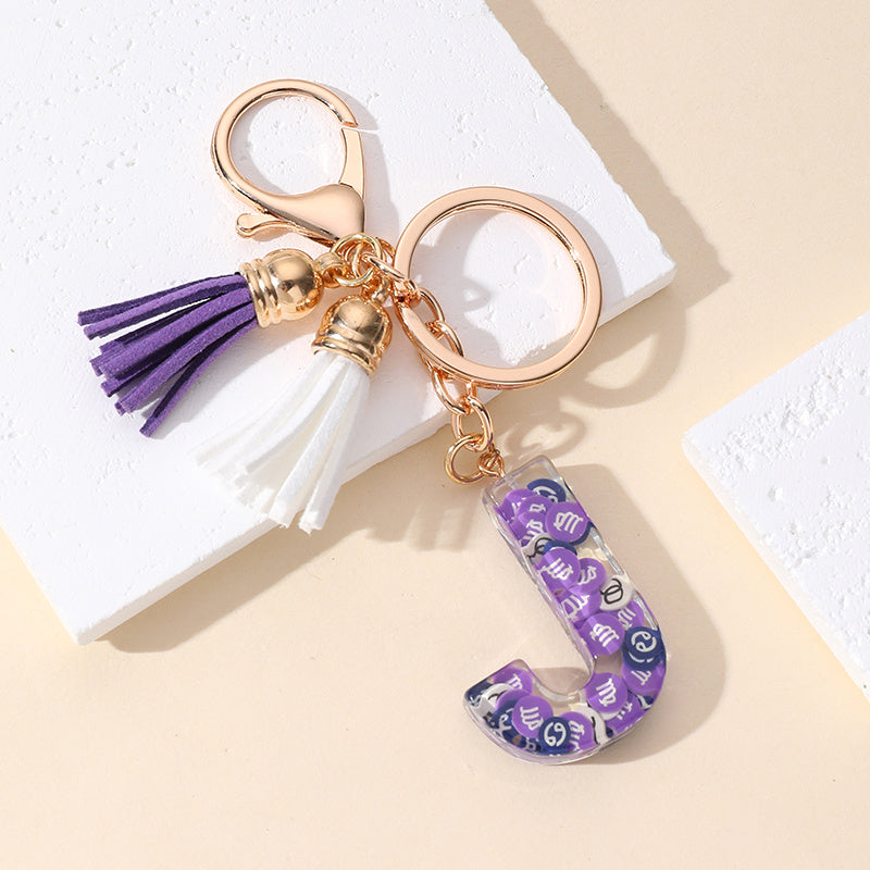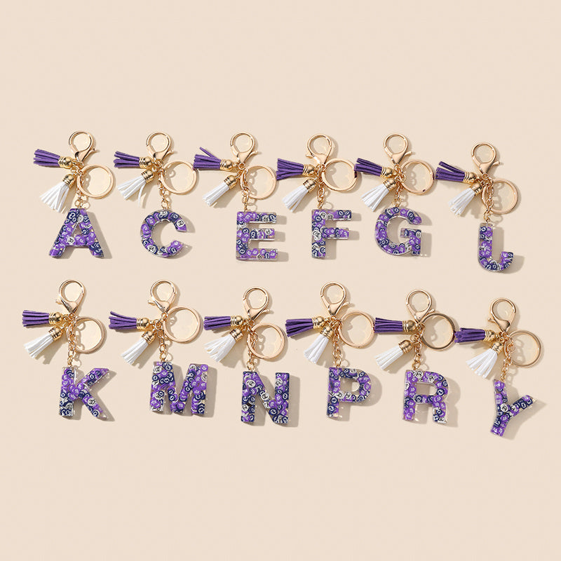 This purple alphabet keychain is a stylish accessory featuring a tassel decoration. Perfect for adding flair to your bag or keys!