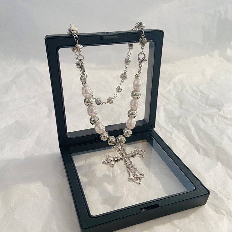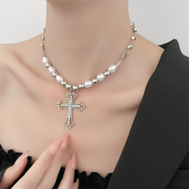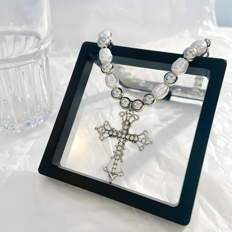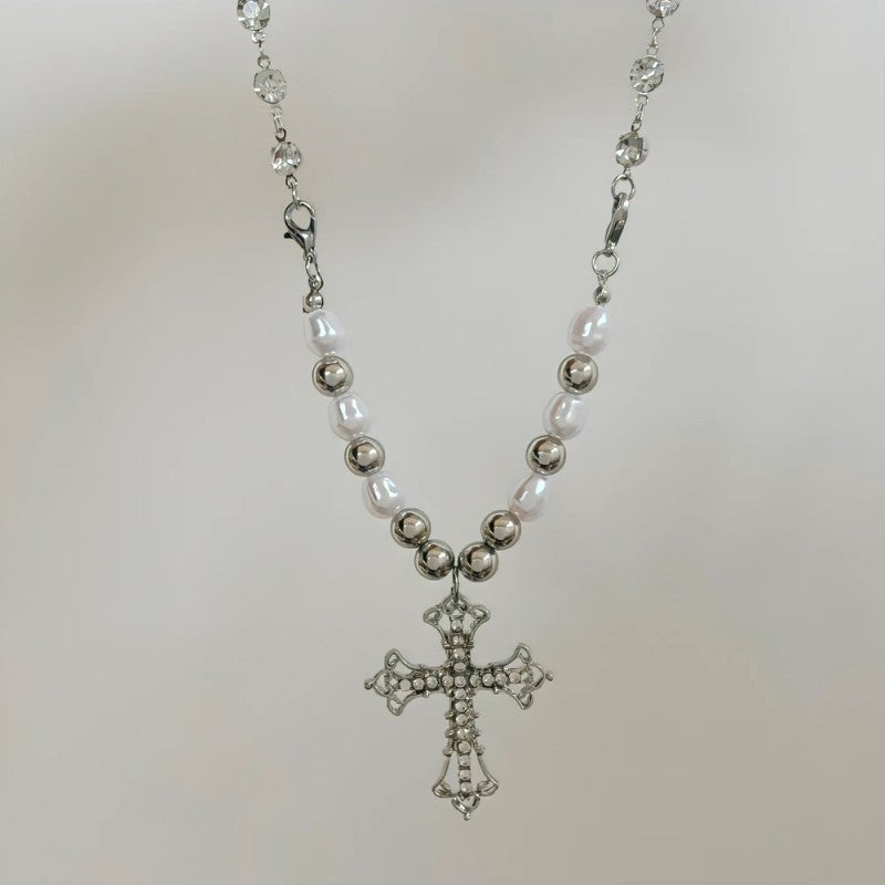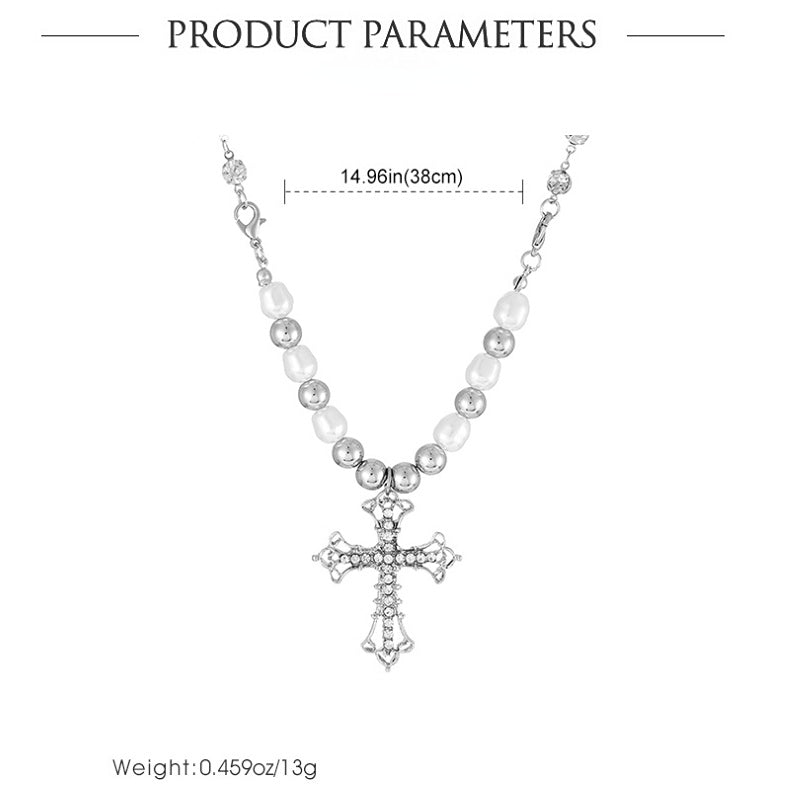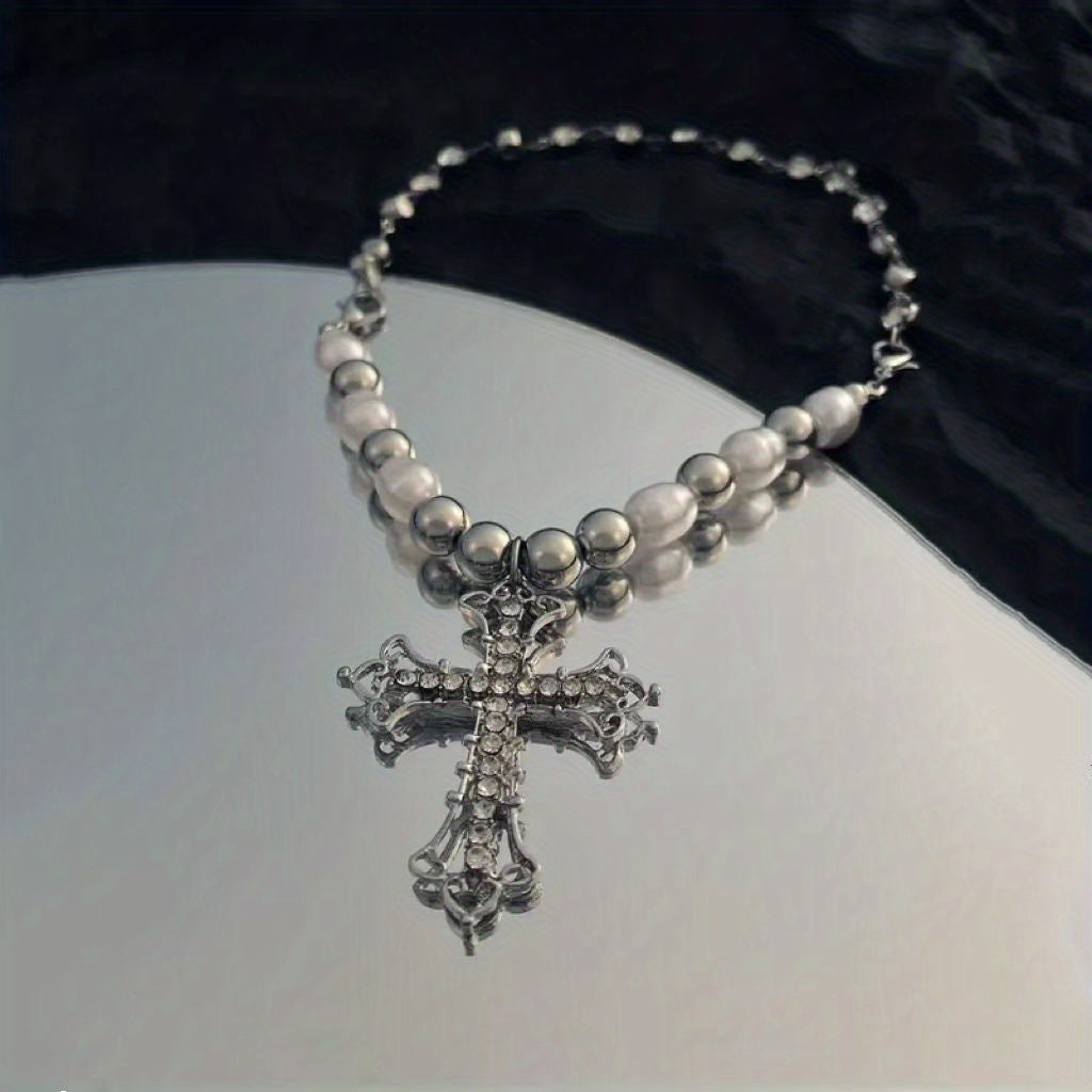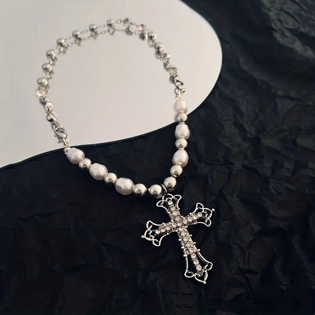 Add a touch of elegance with this pearl necklace featuring a dazzling rhinestone cross pendant. Perfect for any occasion.