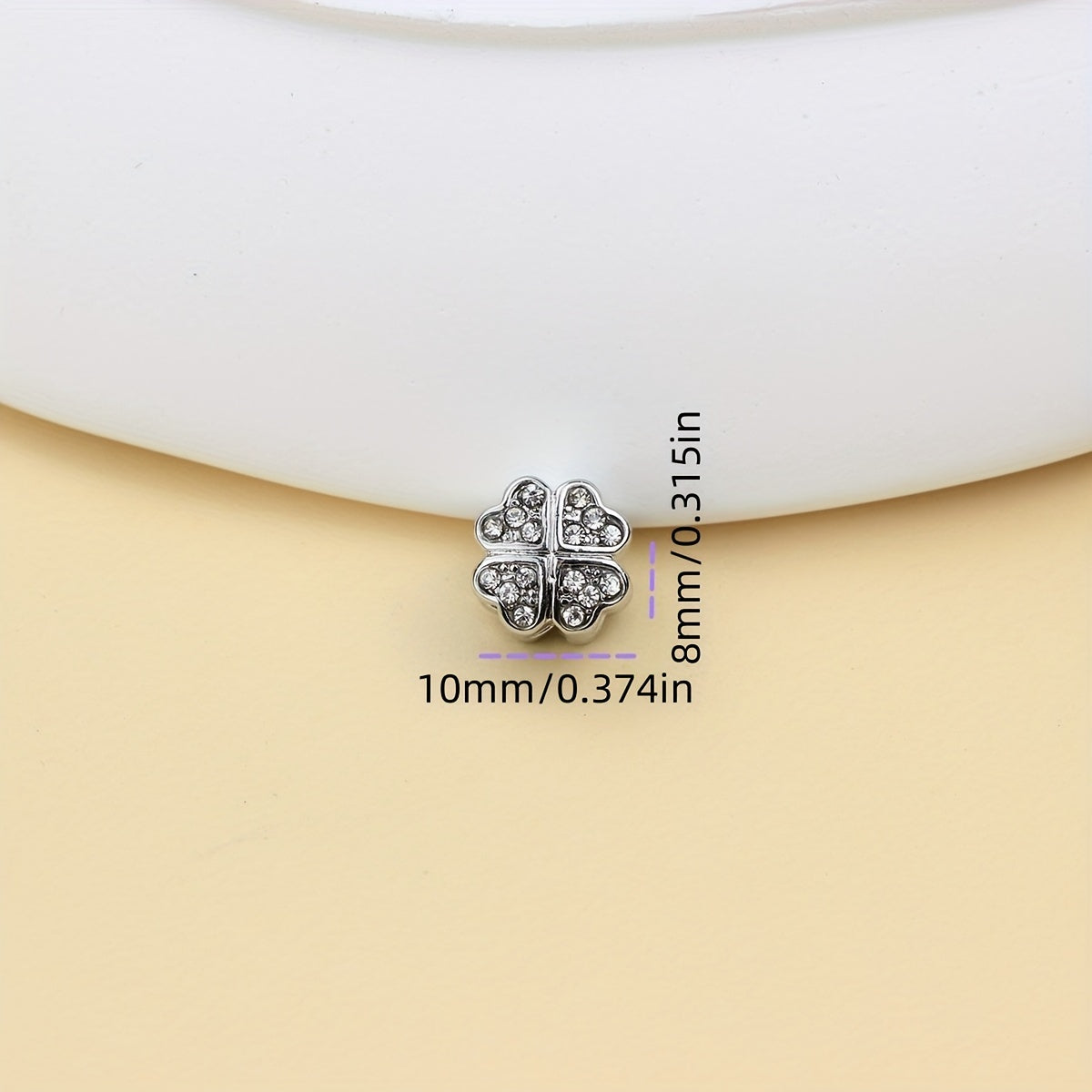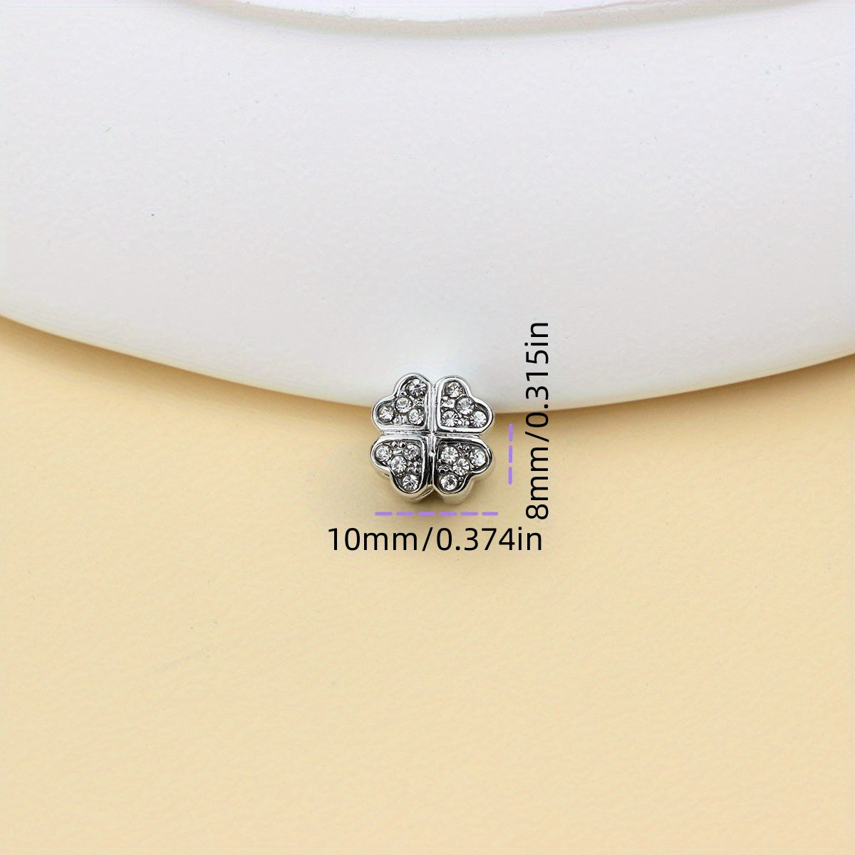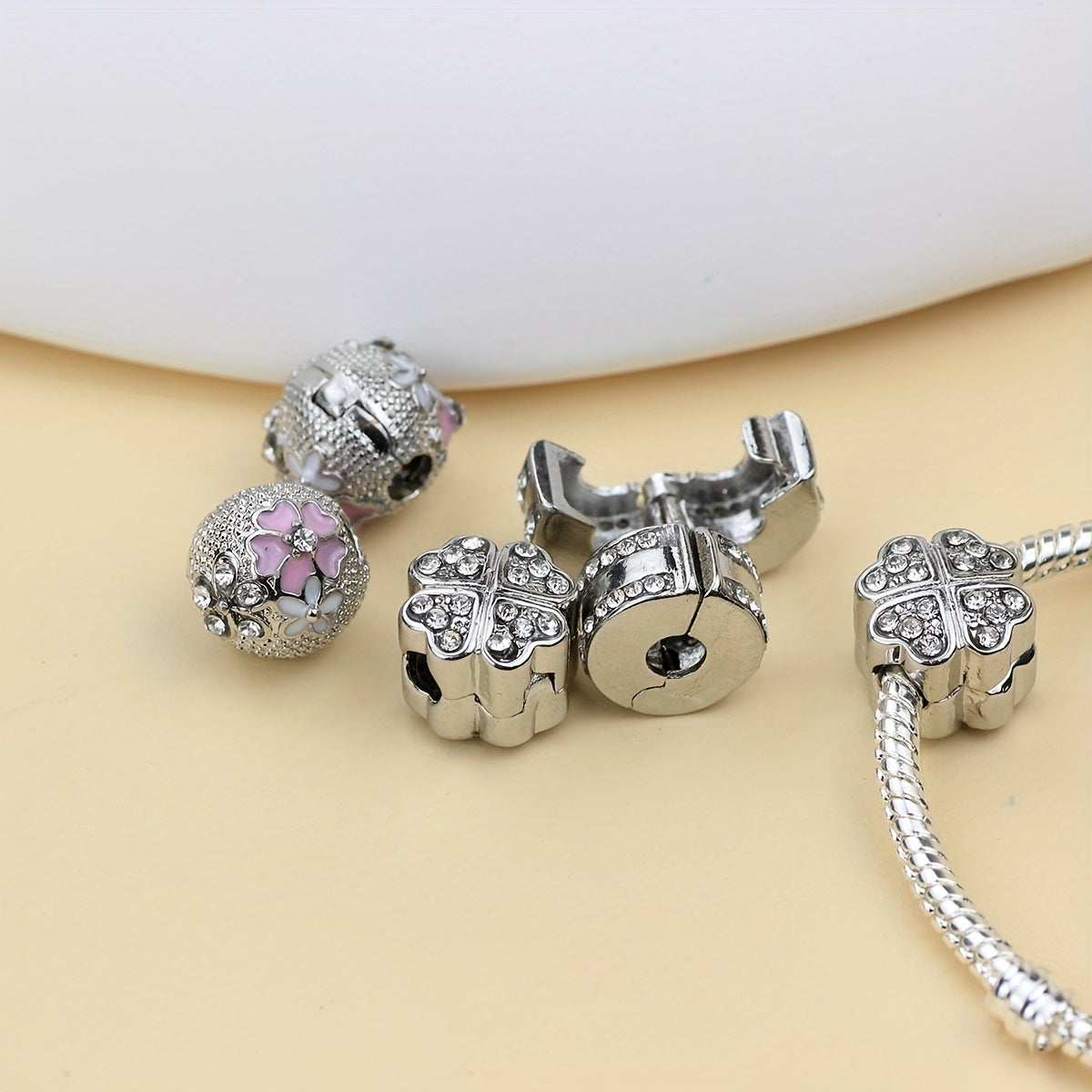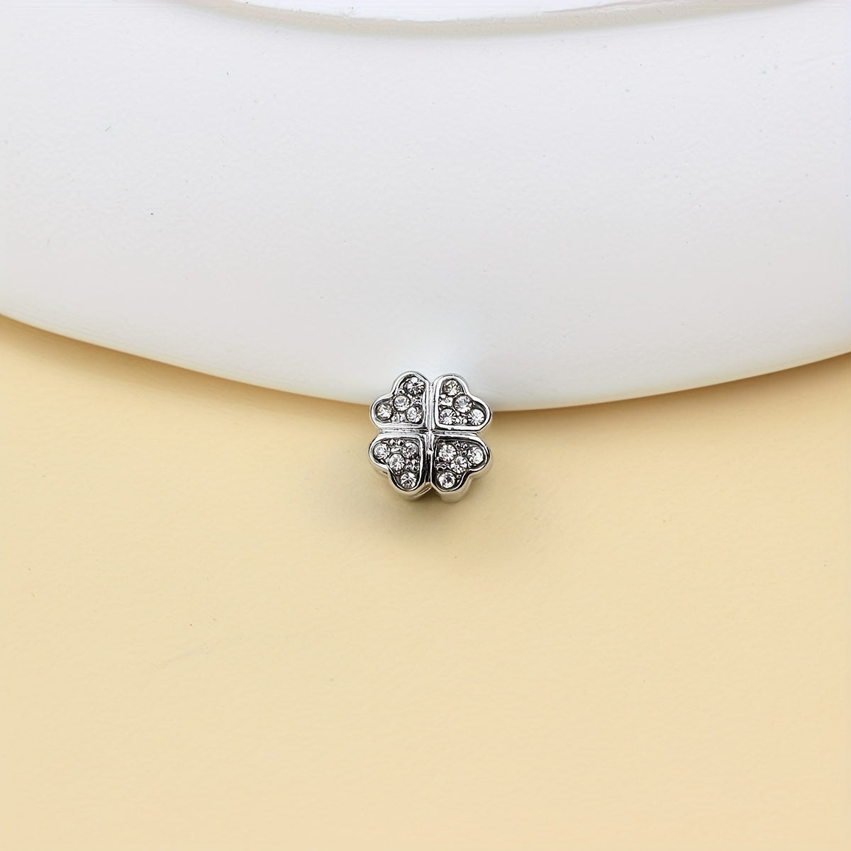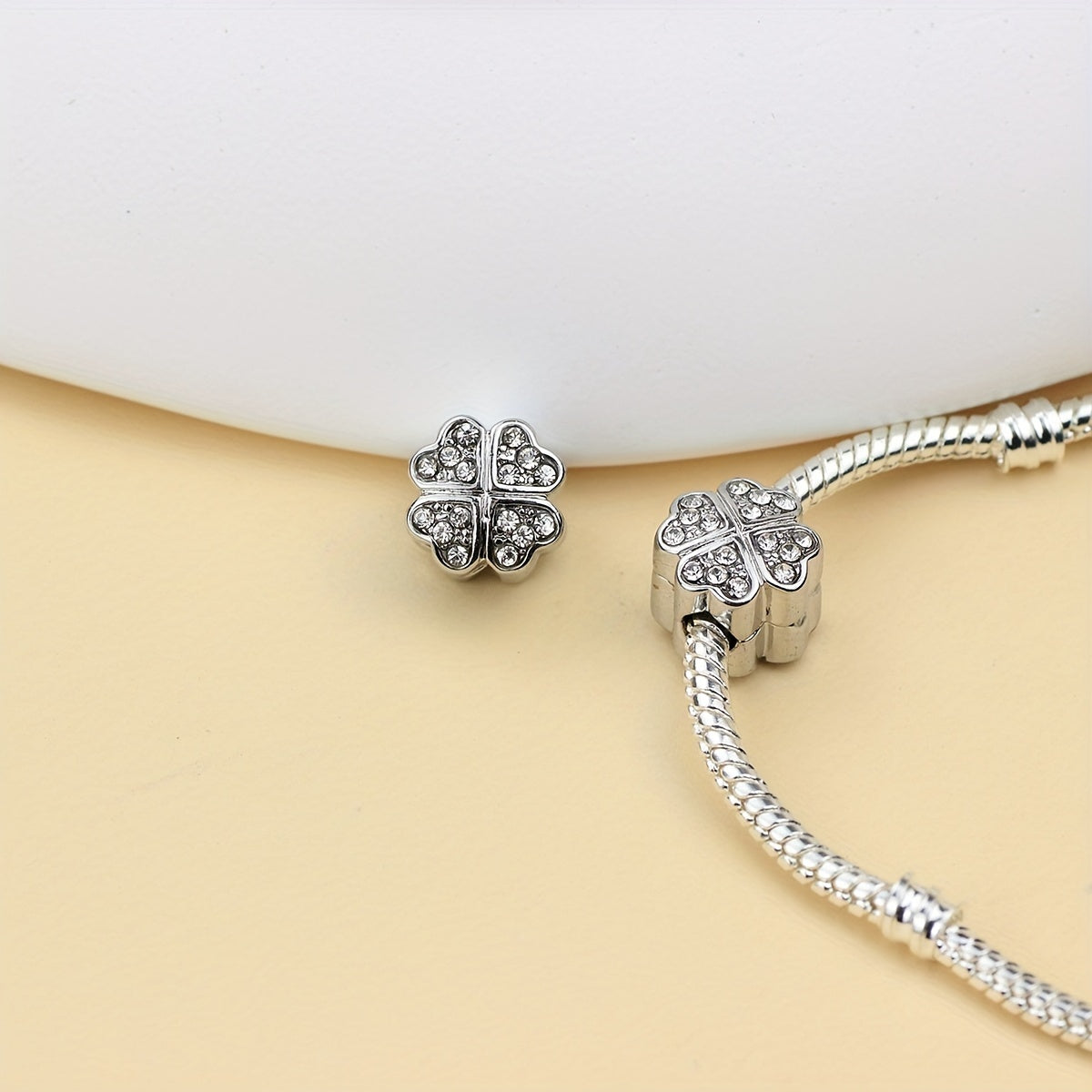 This silver-colored copper stopper crystal clip lock features a charming four-leaf clover design, perfect for DIY charm bracelets.