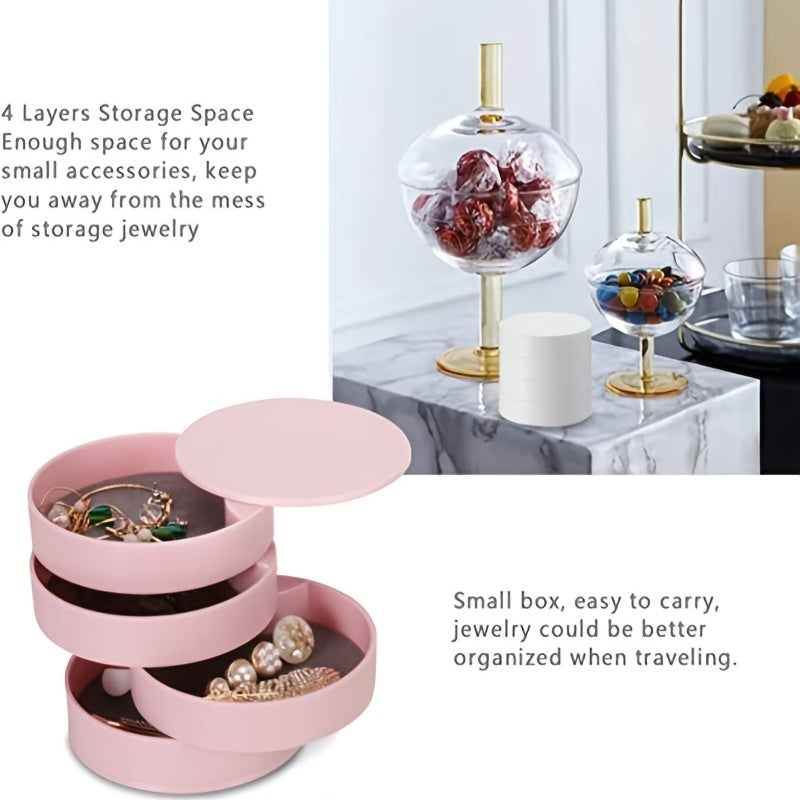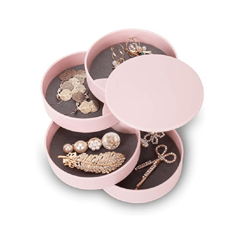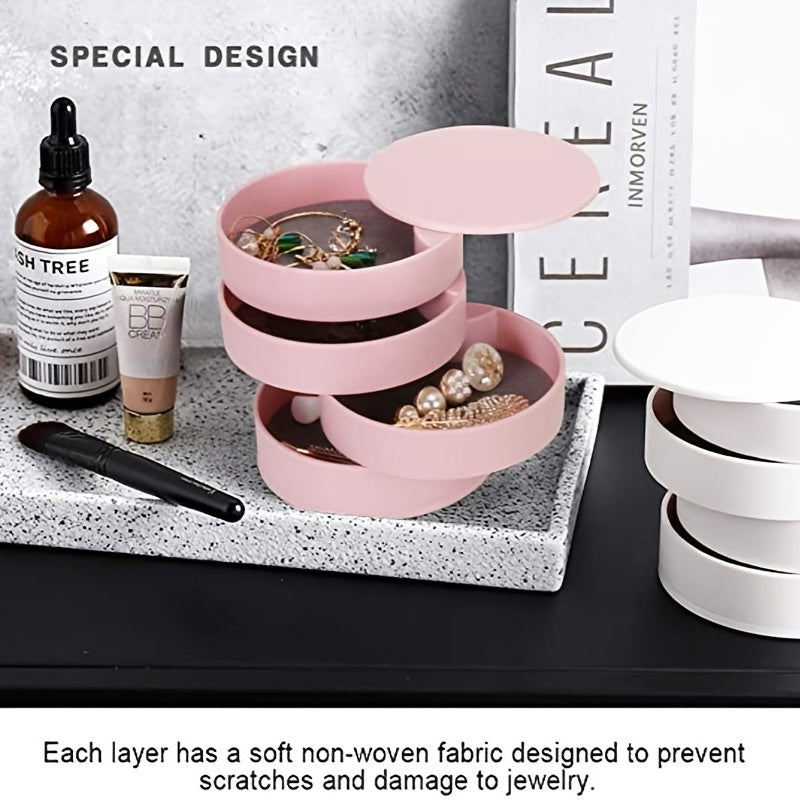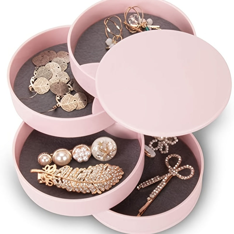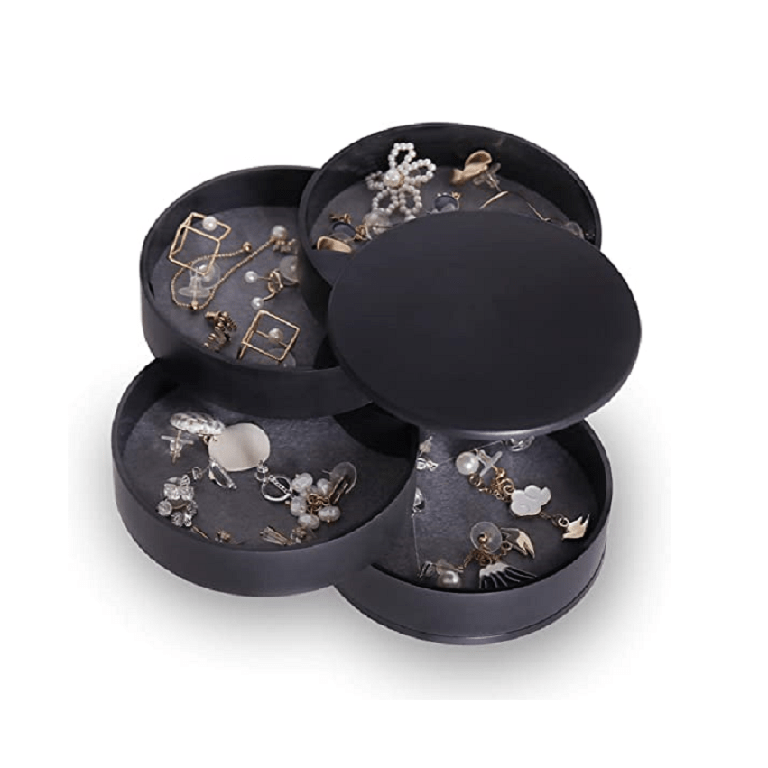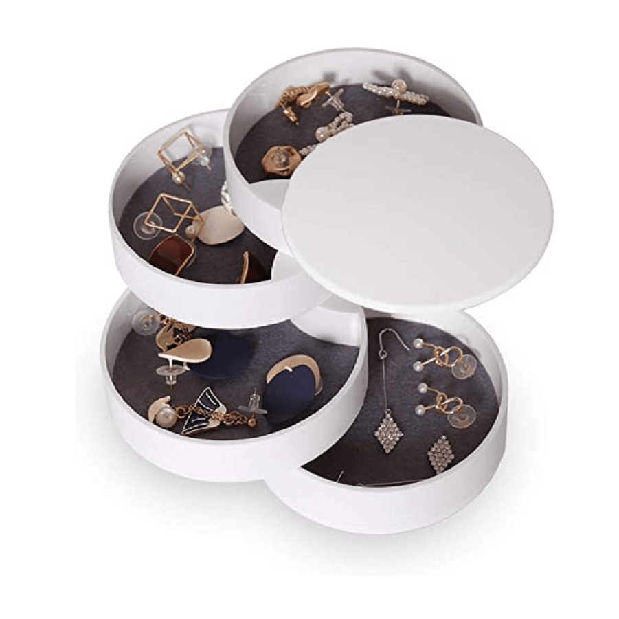 Keep your jewelry organized with this compact 5-tier swivel jewelry organizer. Perfect for travel or home use, this box features a lid to keep your items secure.