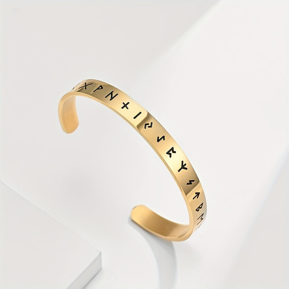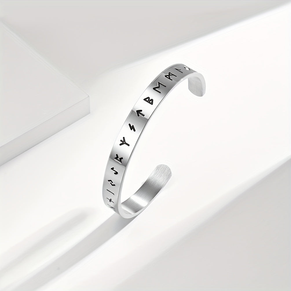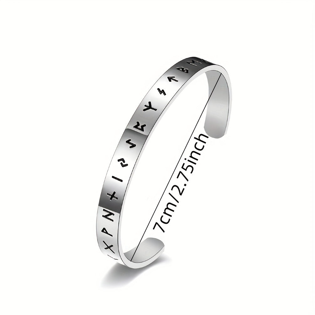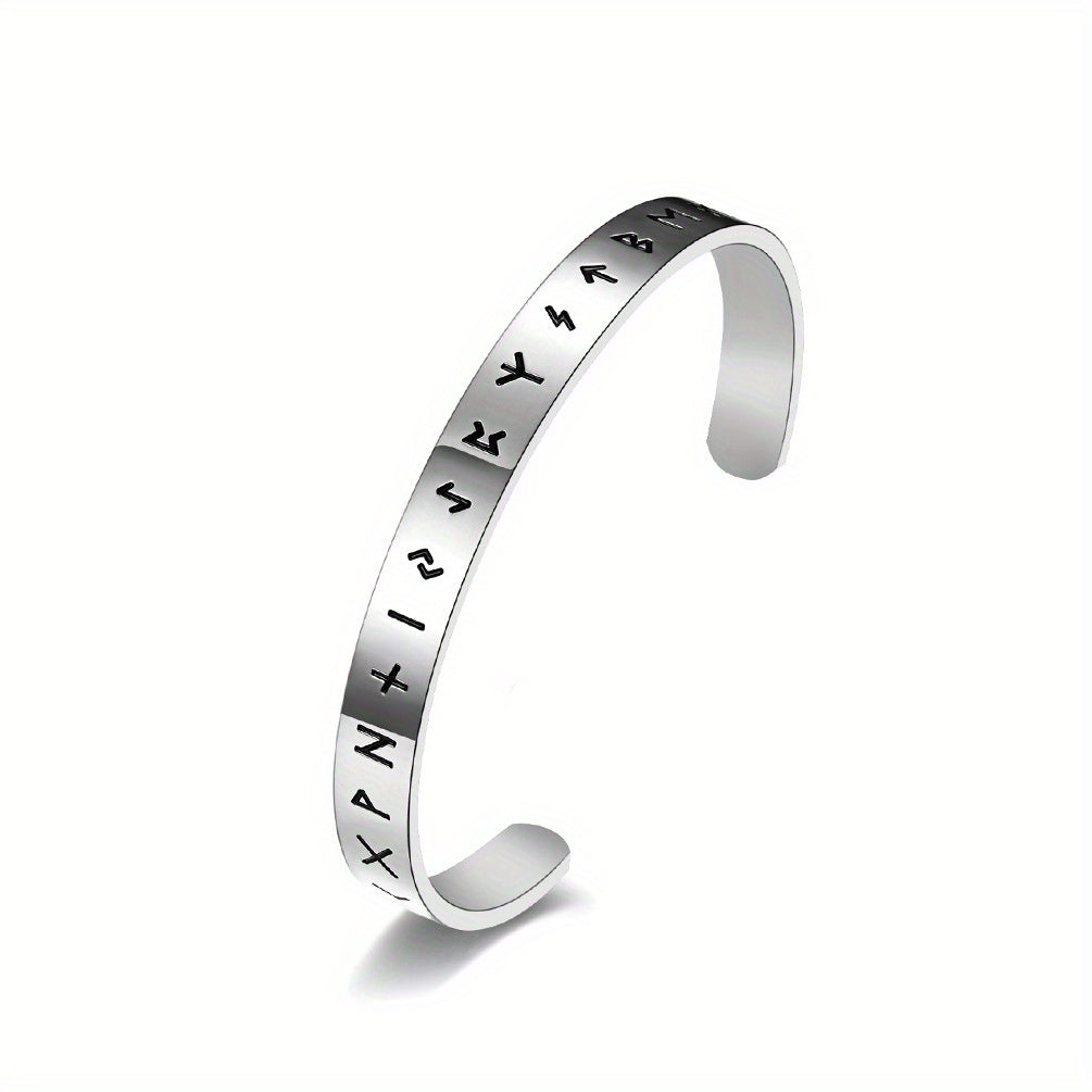 Enhance your style with this stainless steel Viking Rune Alphabet bracelet that is designed for both men and women. The adjustable open cuff makes it a perfect accessory to wear daily.