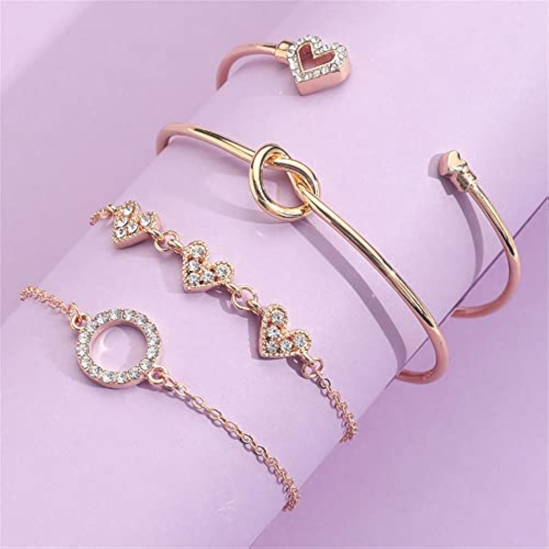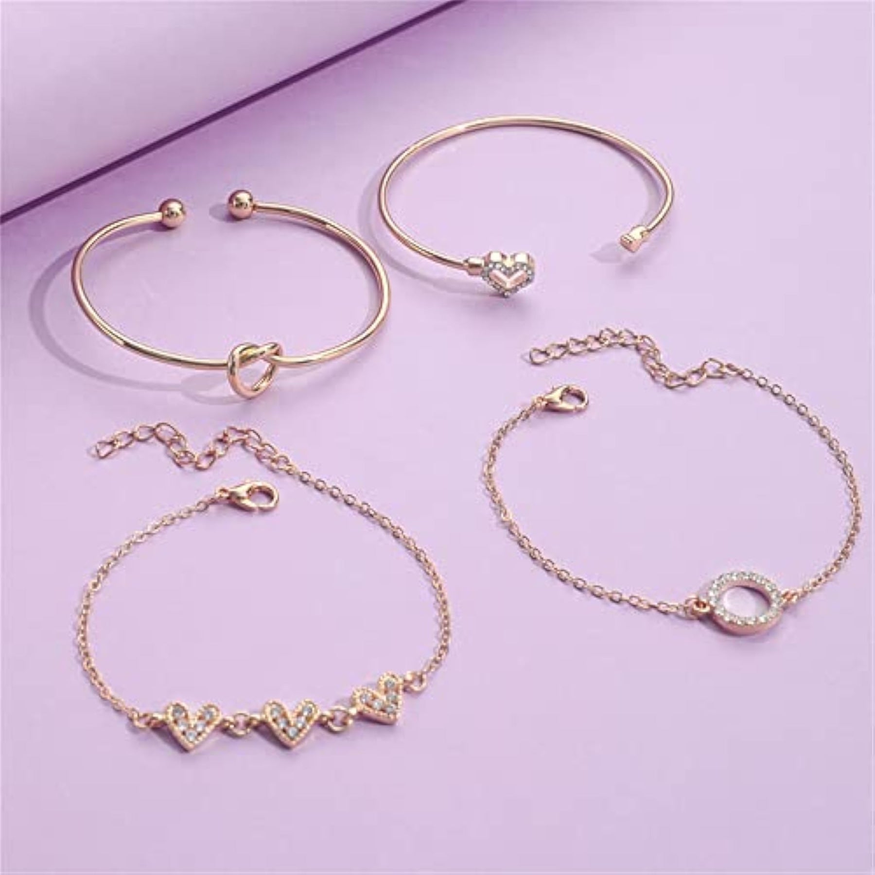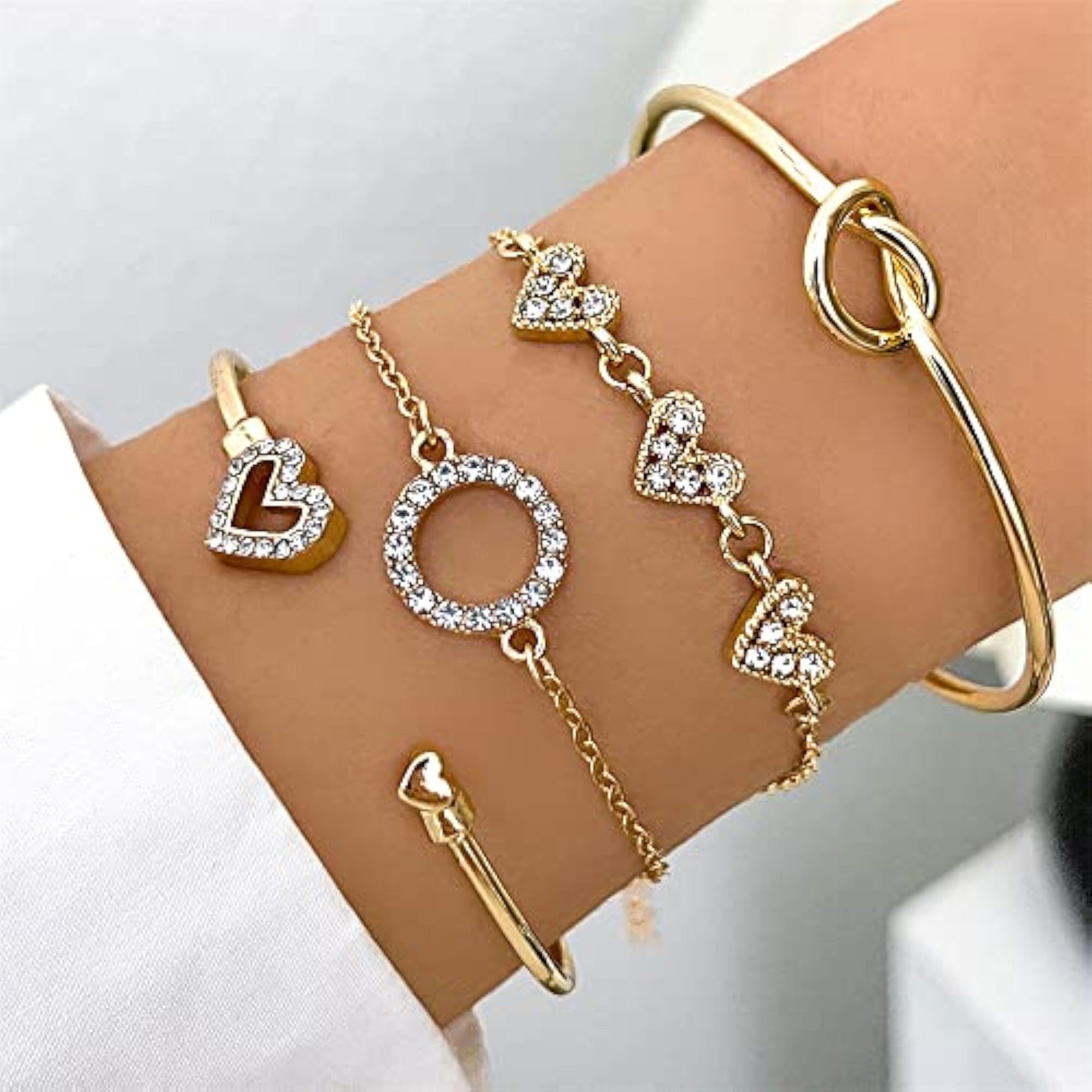 Elevate your style with this 4-piece multilayer crystal bangle bracelet set featuring captivating heart designs. Perfect for any occasion.