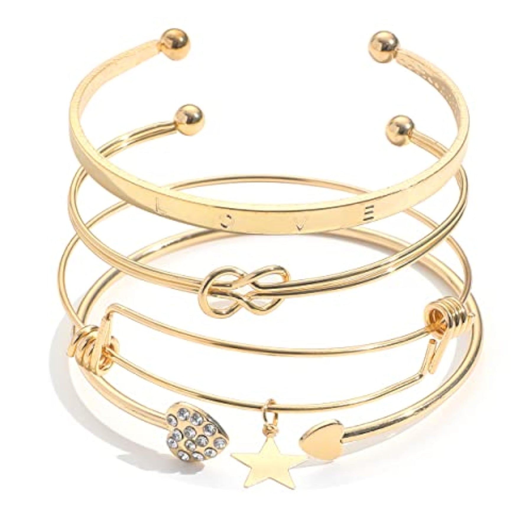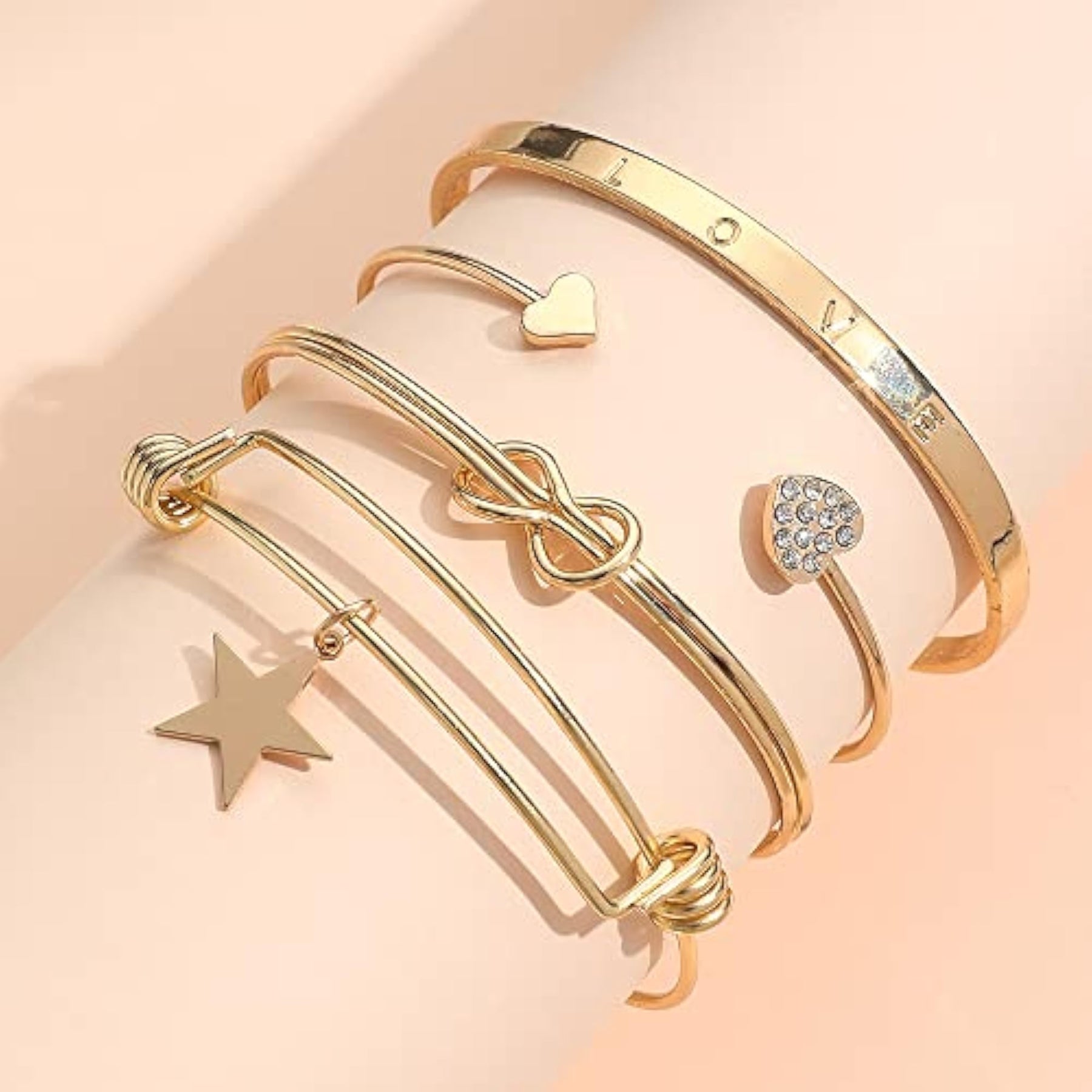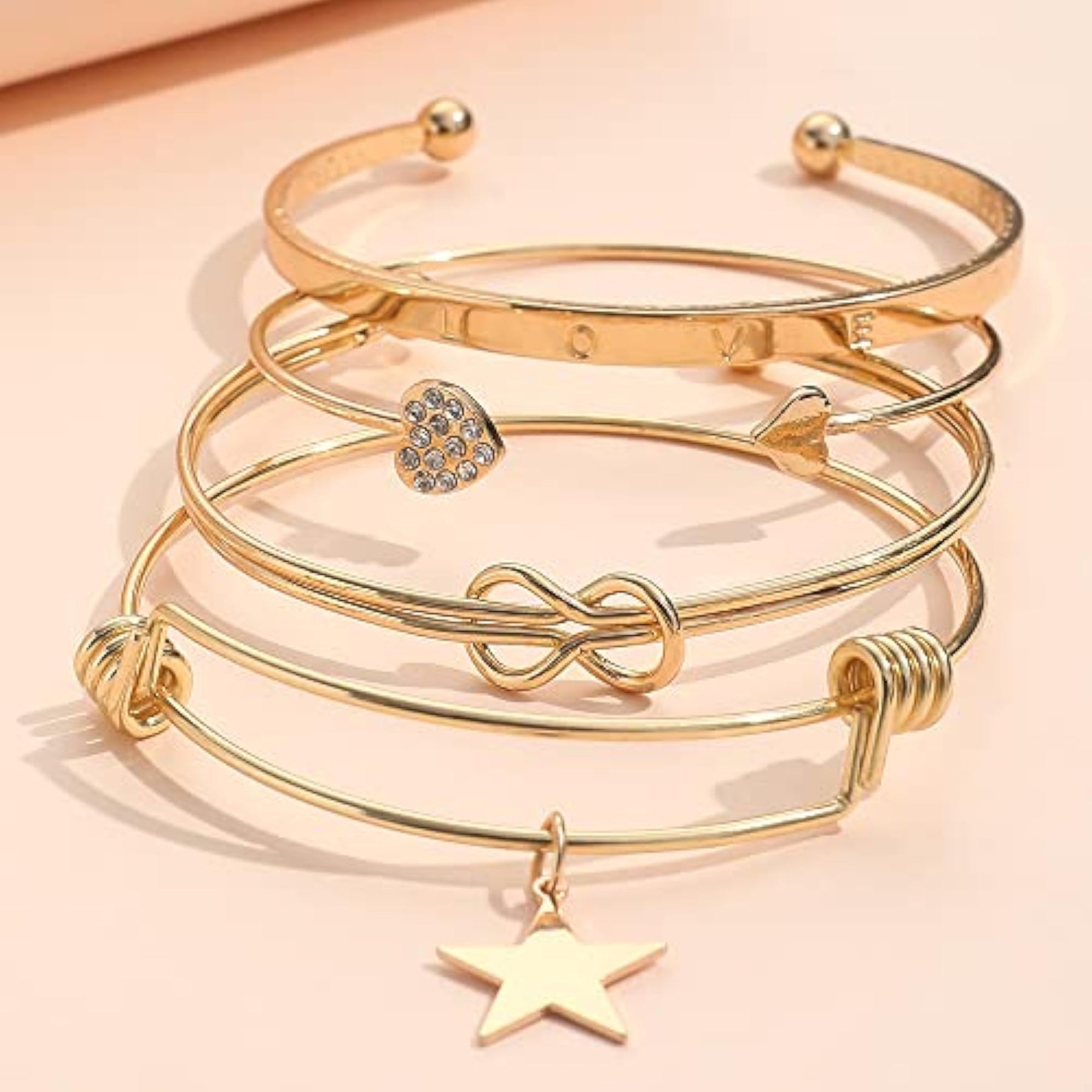 Enhance your look with this fashionable 4-piece multilayer bangle bracelet set featuring crystal heart charms. Perfect for any occasion.