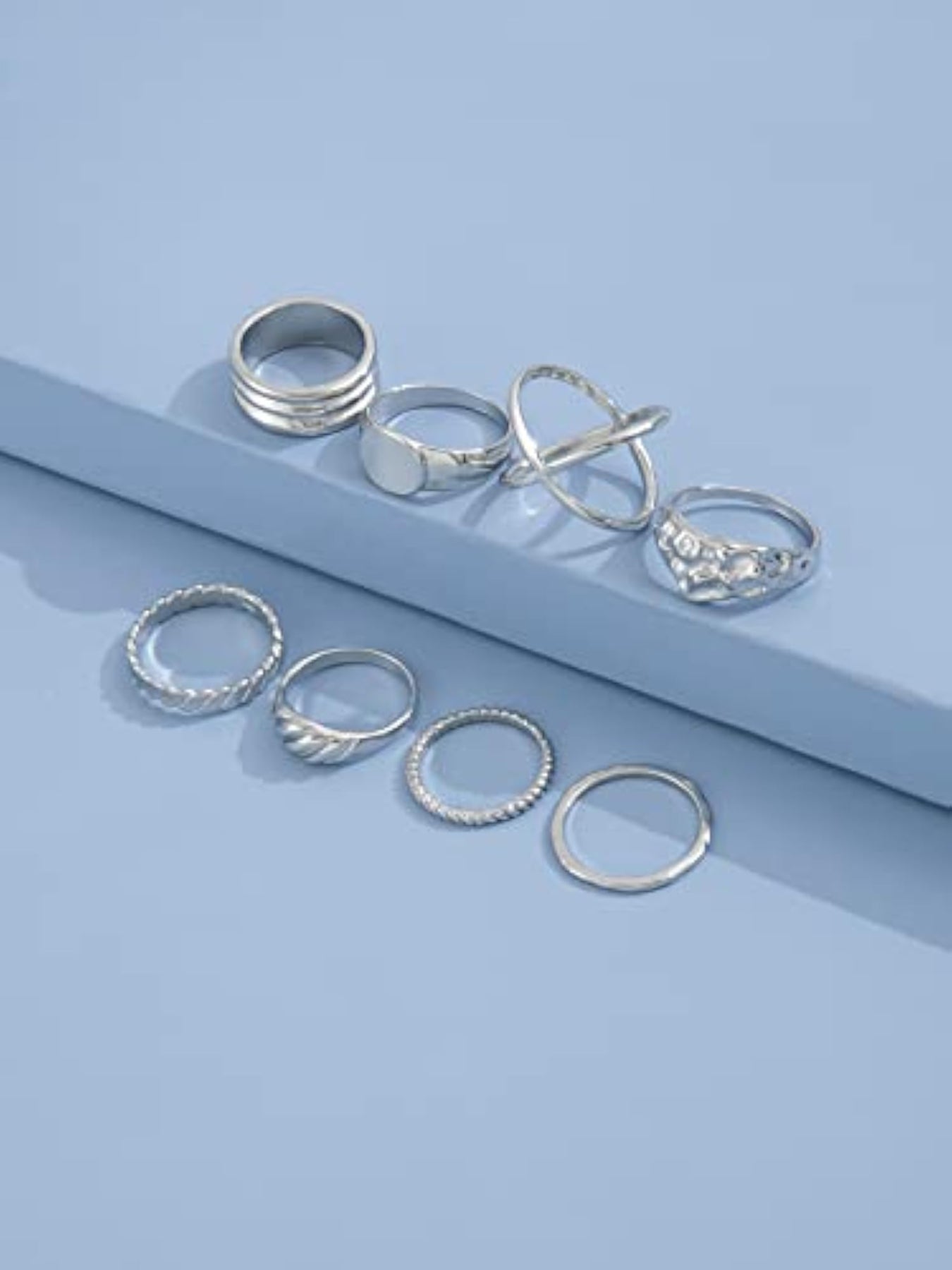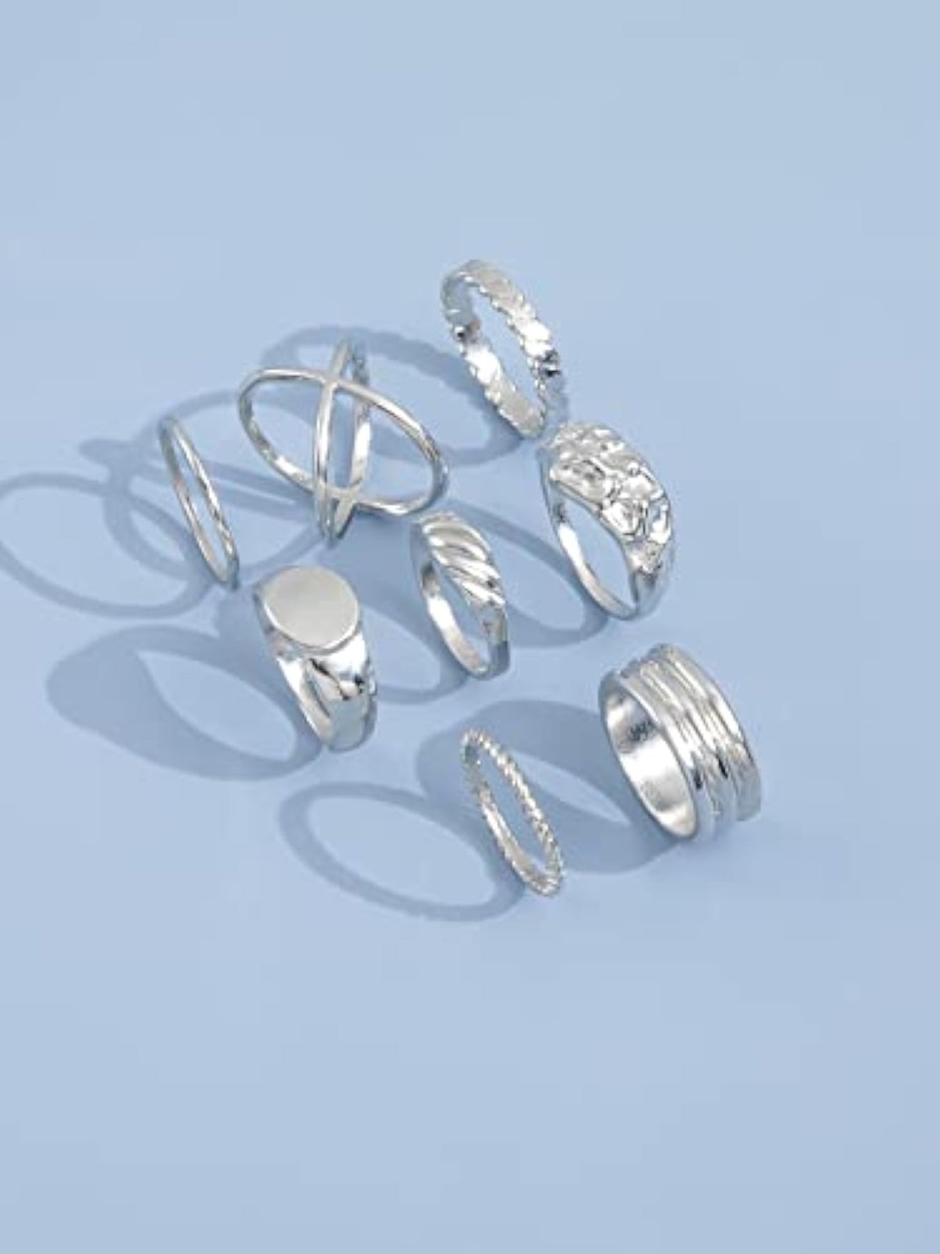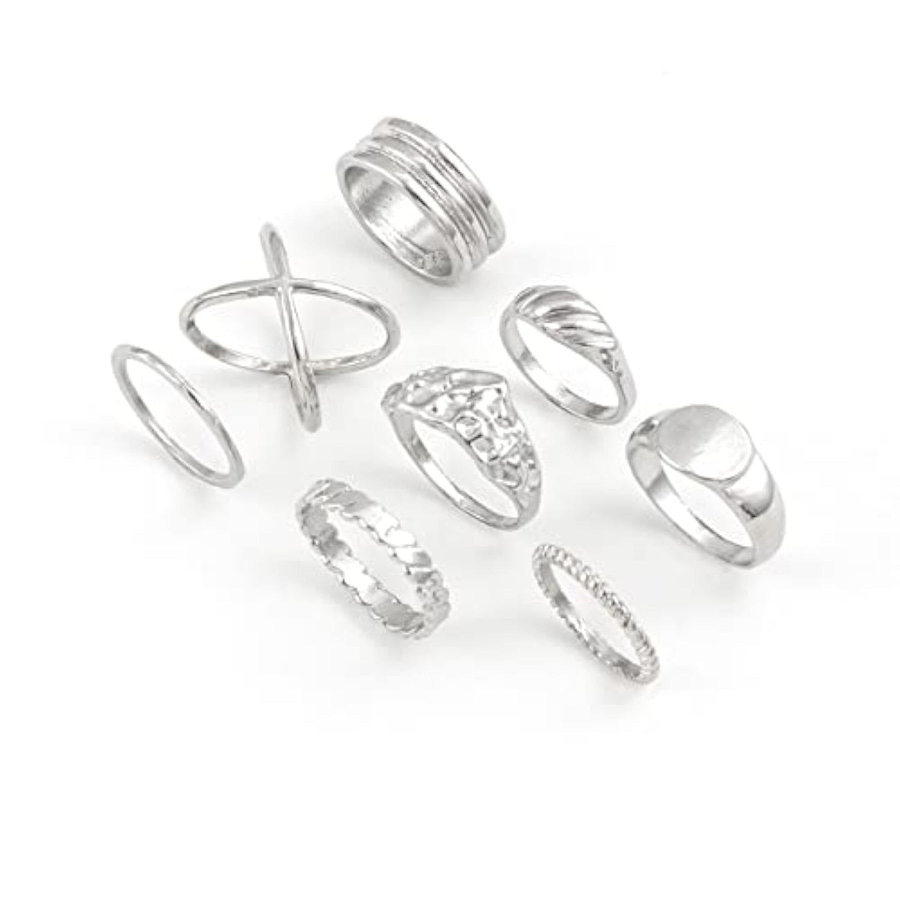 Add a touch of boho chic to your look with this set of 8 stylish metal midi finger rings. These rings are perfect for stacking or wearing on different fingers to create a unique and trendy look.