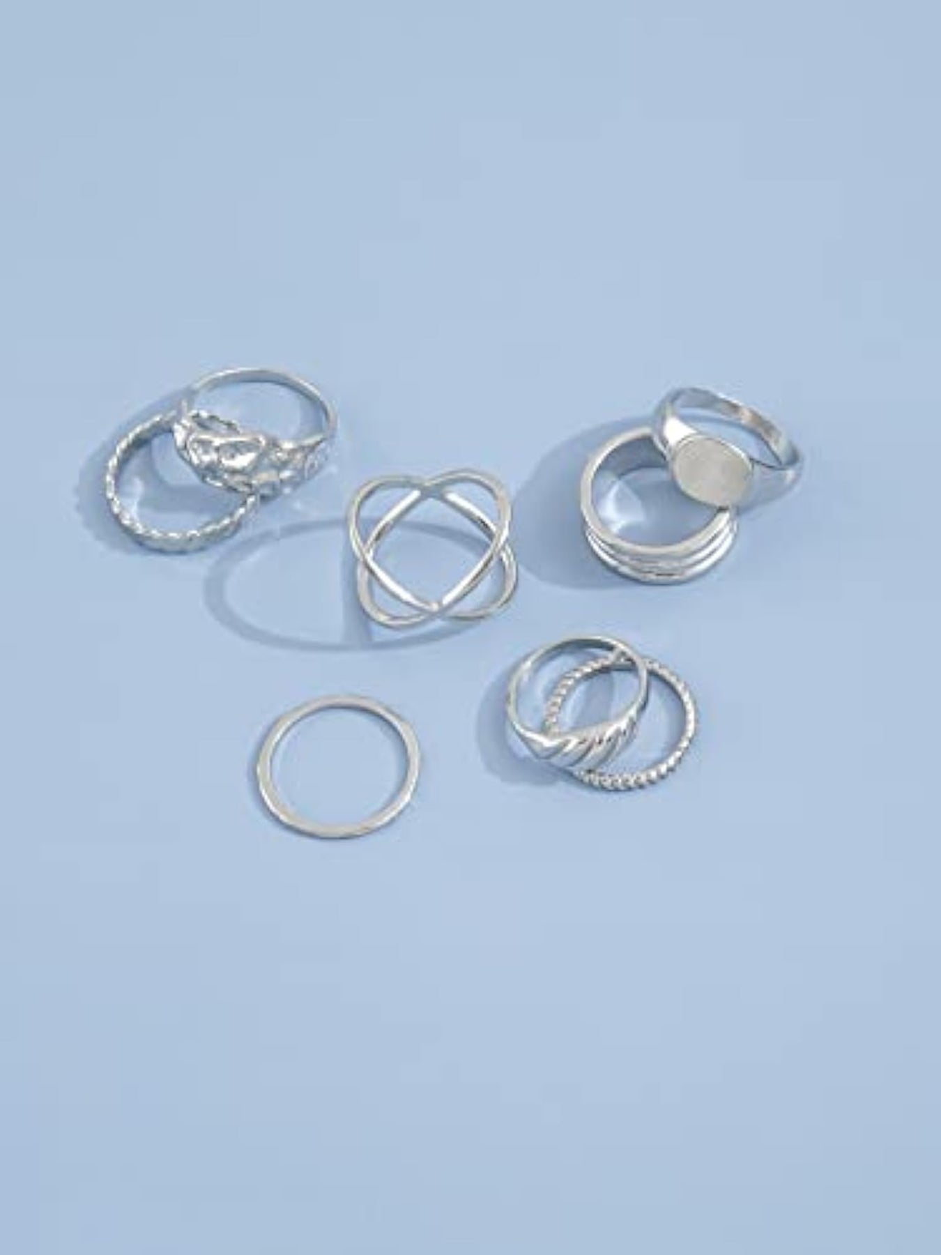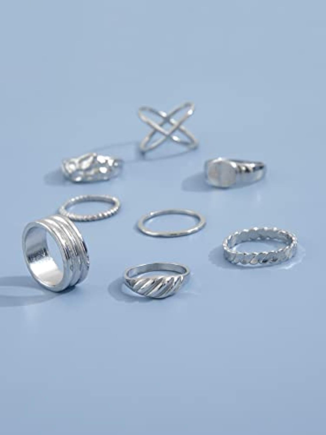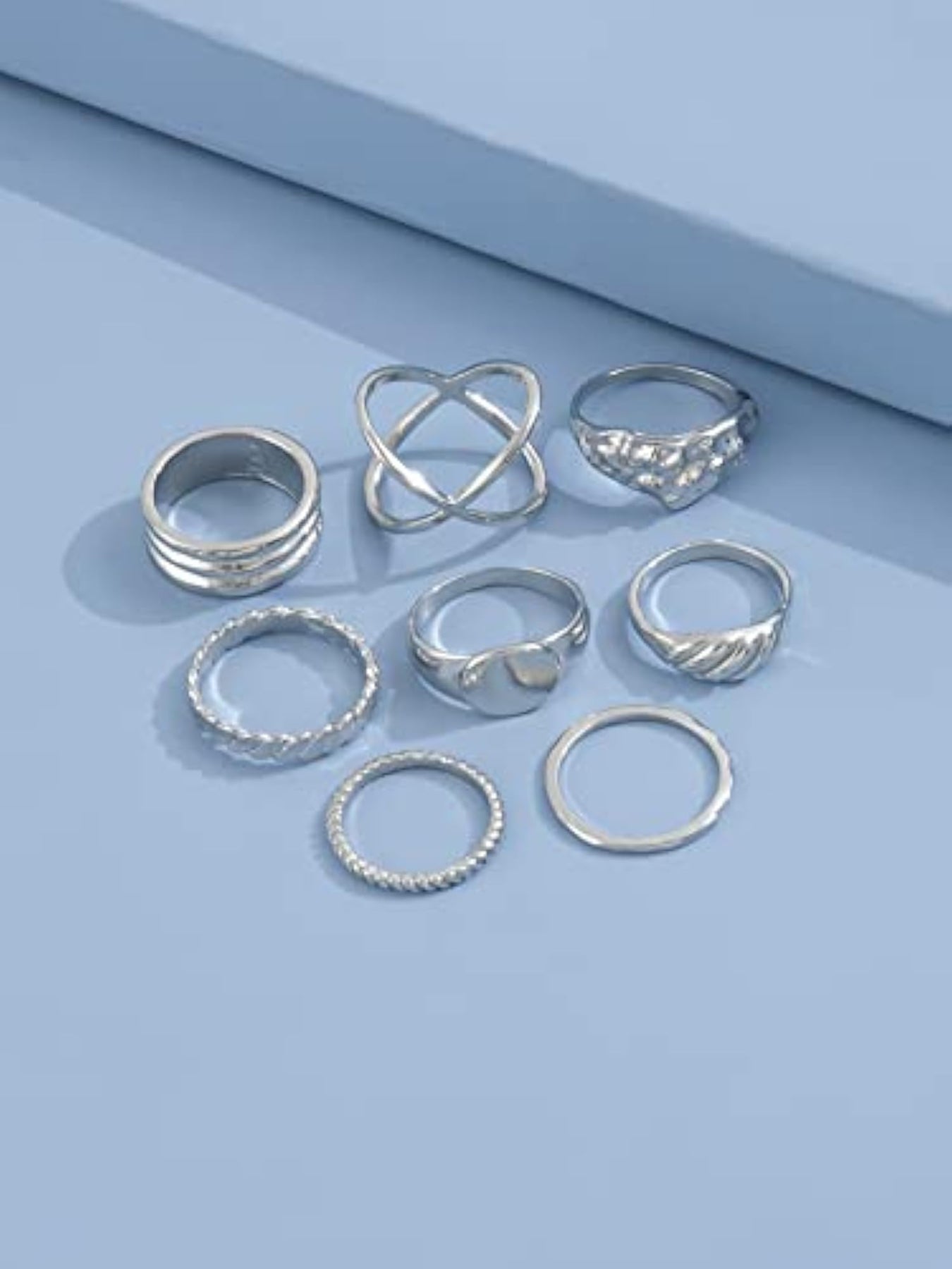 Add a touch of boho chic to your look with this set of 8 stylish metal midi finger rings. These rings are perfect for stacking or wearing on different fingers to create a unique and trendy look.