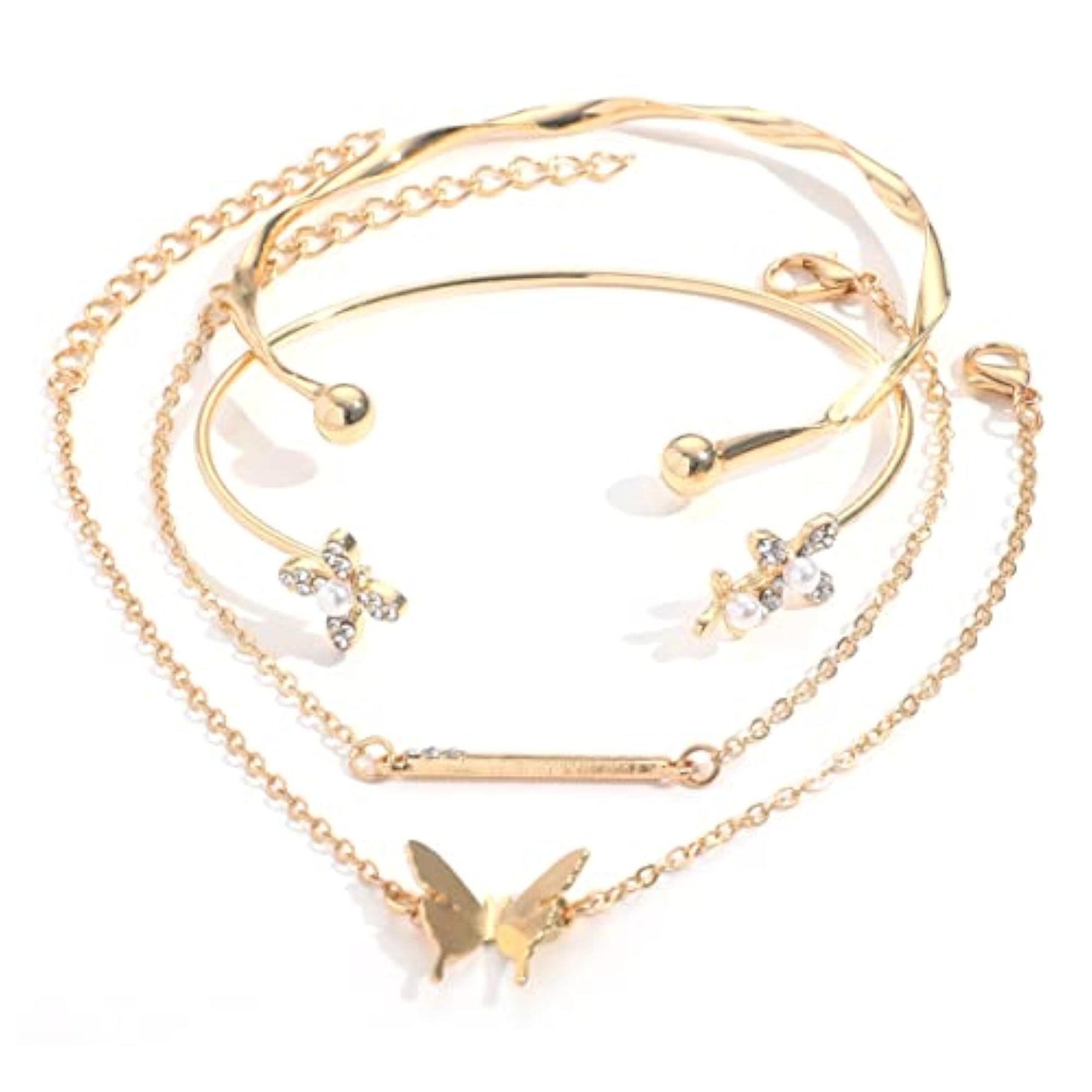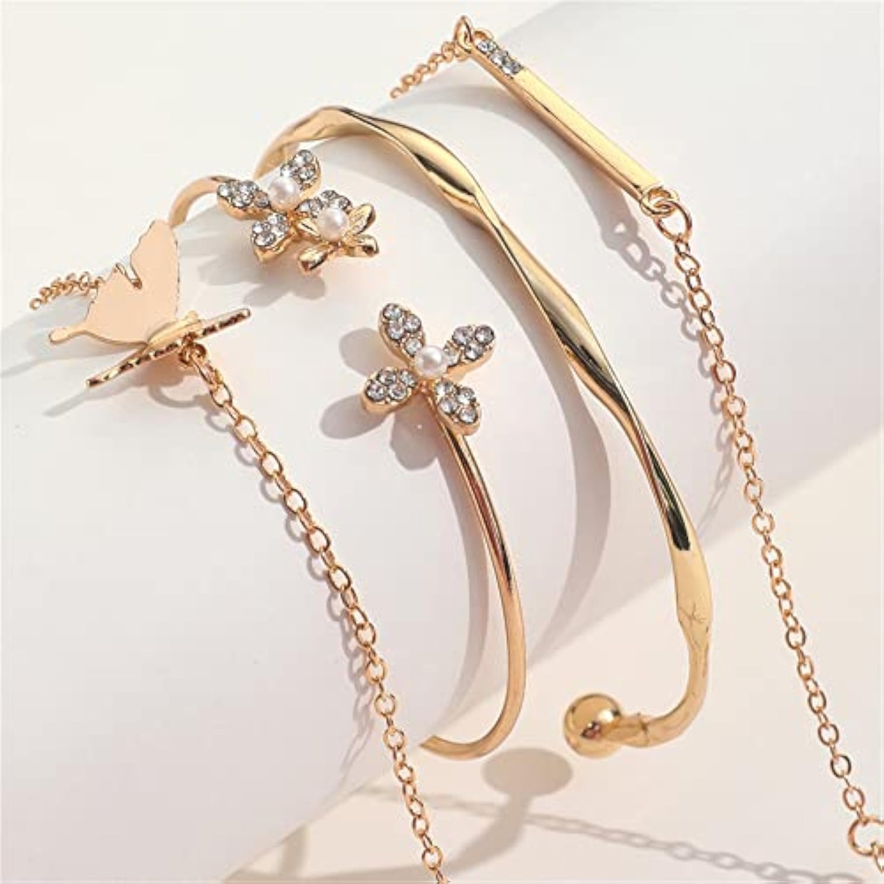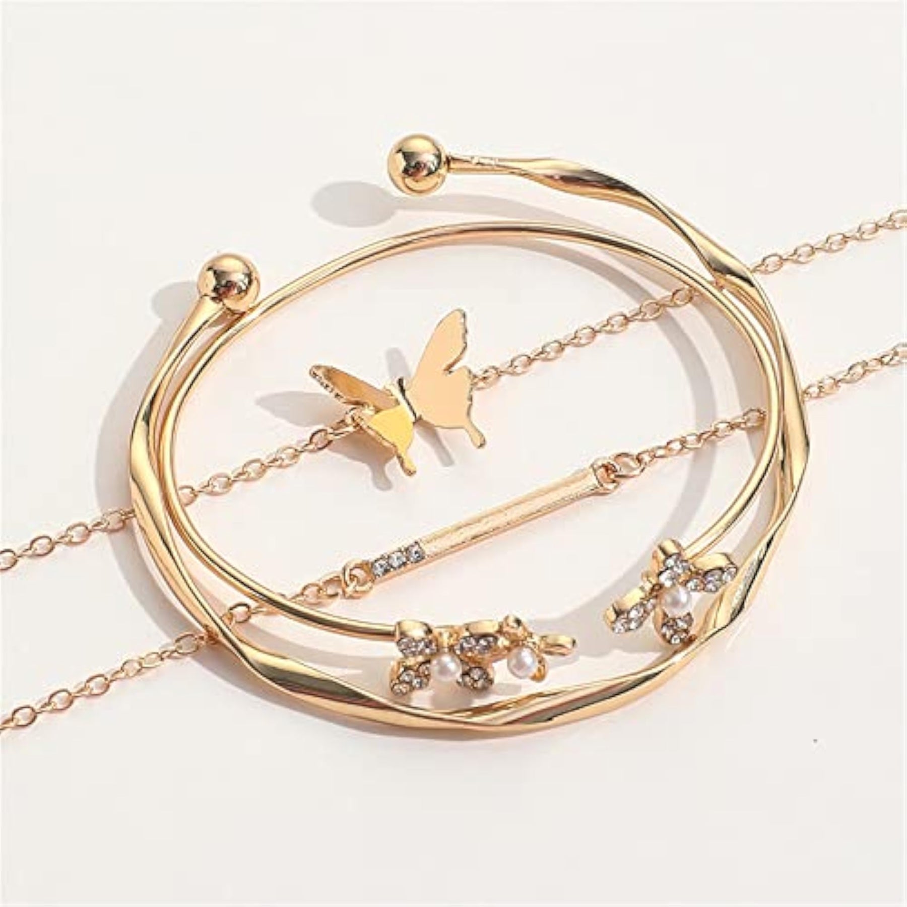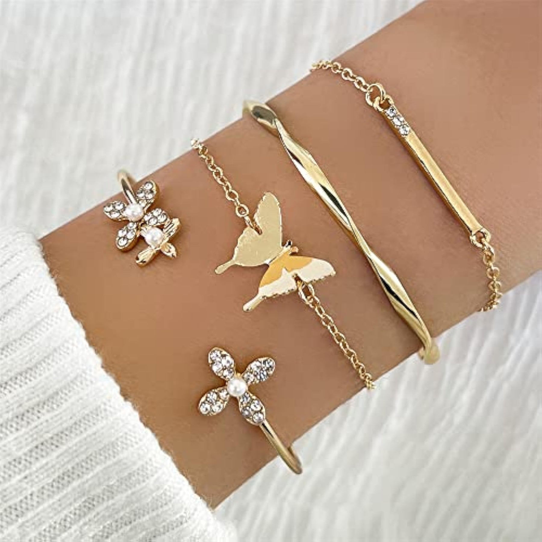 Elegant and trendy 4pcs bangle bracelet set featuring multilayer design with butterfly and flower charms. Perfect accessory for adding a touch of sophistication to any outfit.