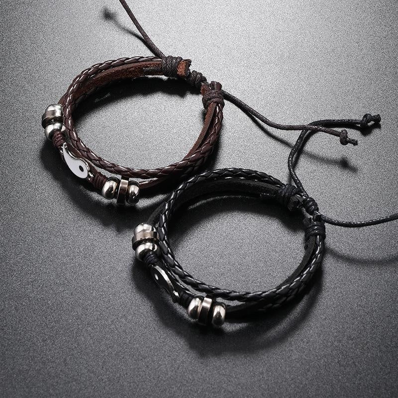 Enhance your style with this 2pcs set of Tai Chi Yin Yang vintage bracelets made of PU leather and braided rope. Perfect as a gift for couples.