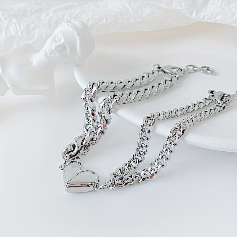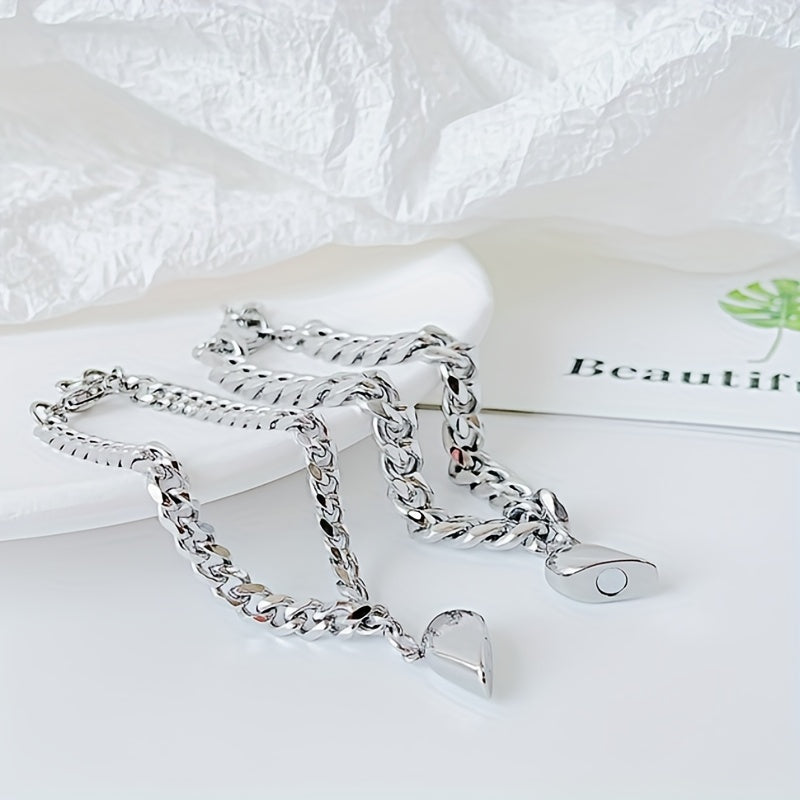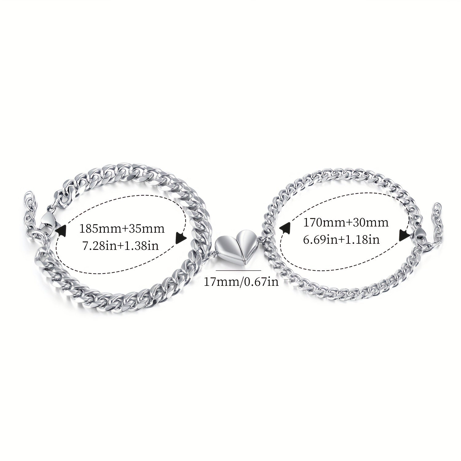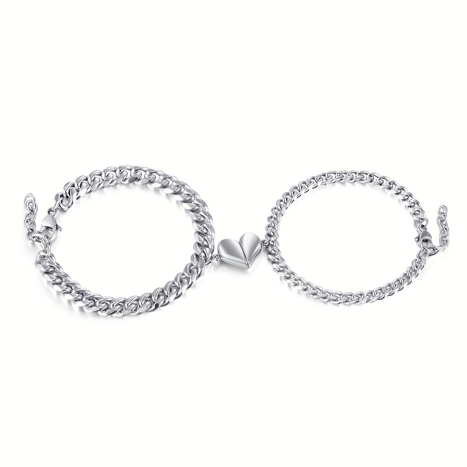 This set includes 2pcs of matching titanium steel bracelets with heart-shaped pendants and magnets. Perfect for couples looking to showcase their love and connection.