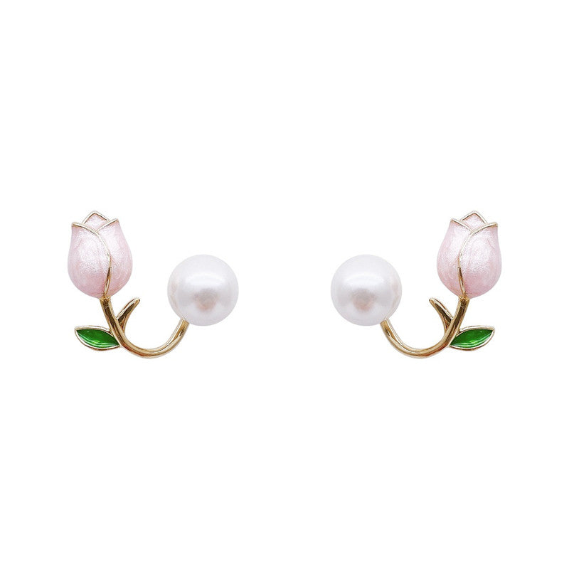Elegant and delicate tulip flower earrings featuring faux pearl details, perfect for women who love floral accessories.