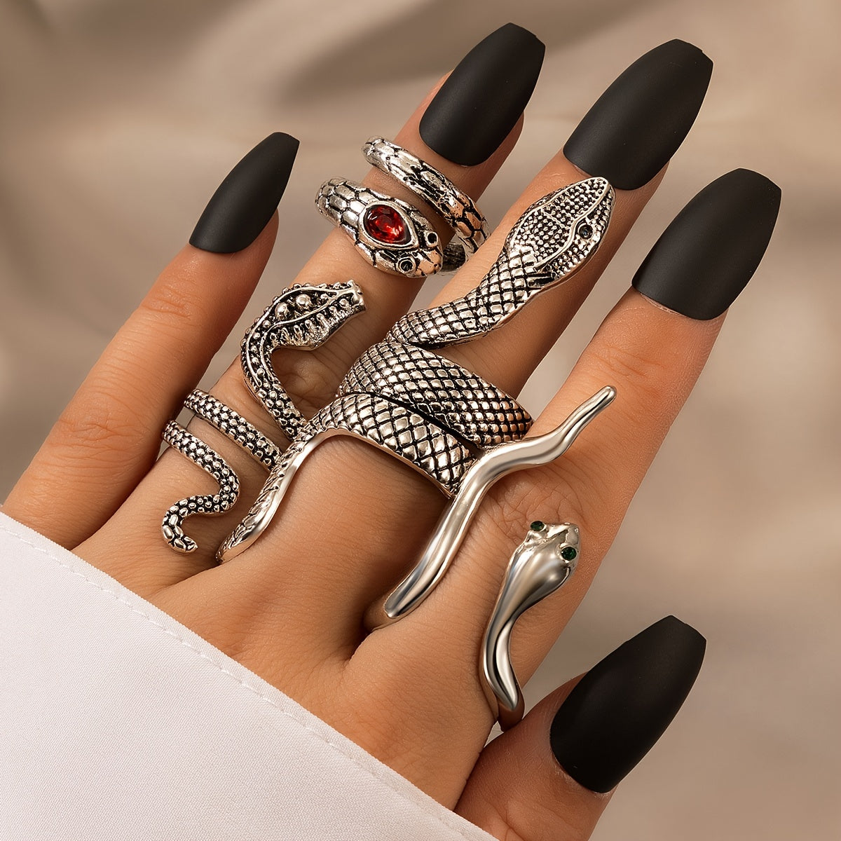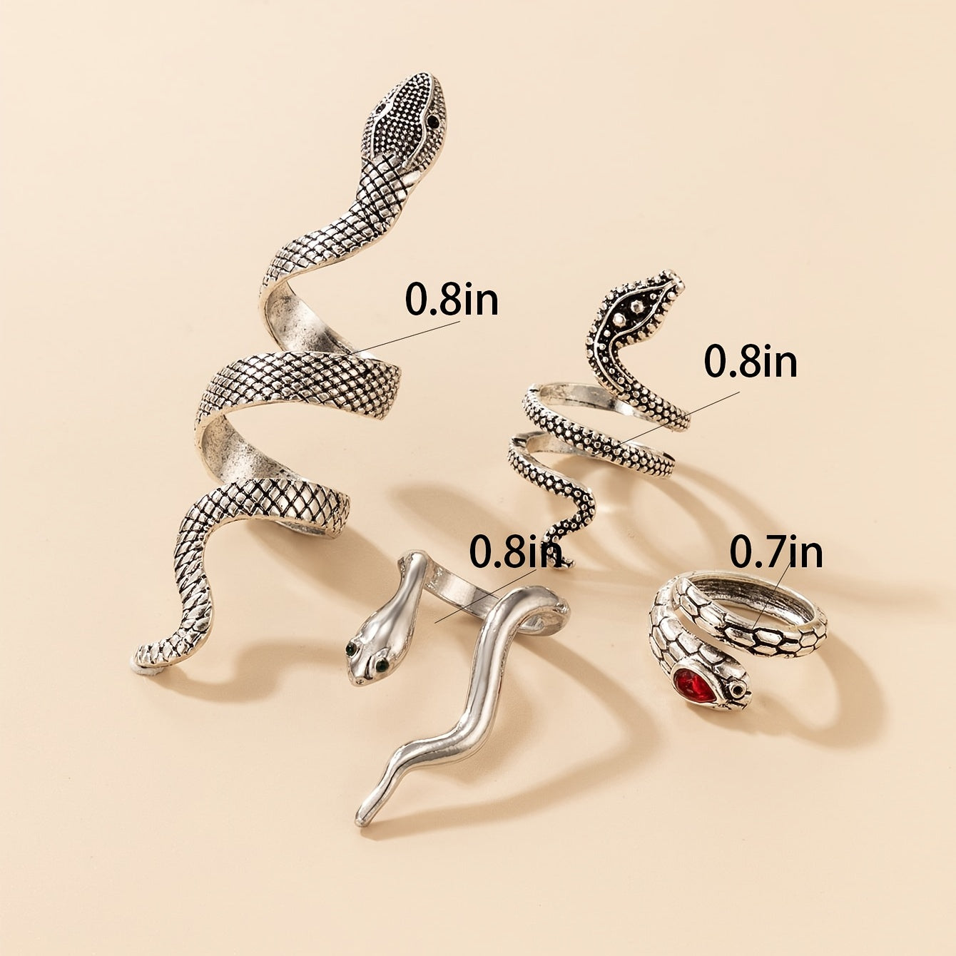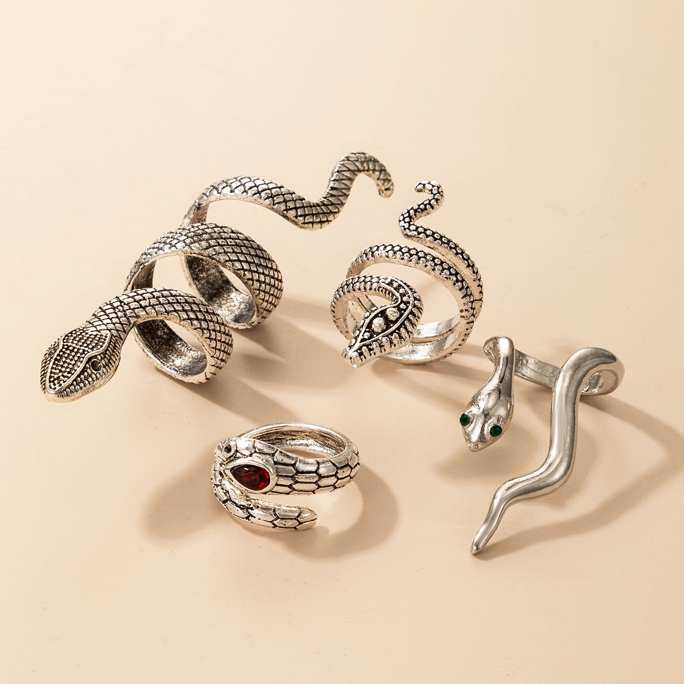 Elevate your style with this set of 4 unique snake rings, perfect for parties, holidays, and gifting. Show off your personality with this eye-catching jewelry piece.