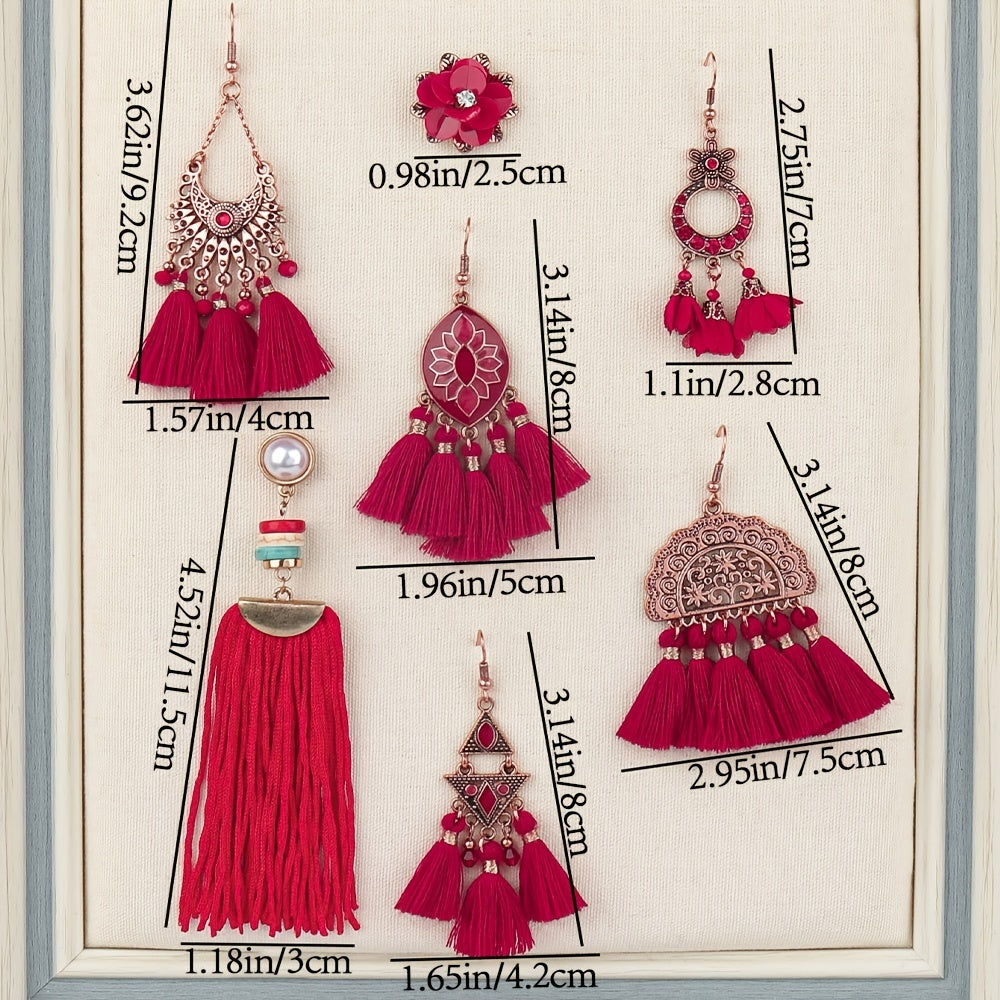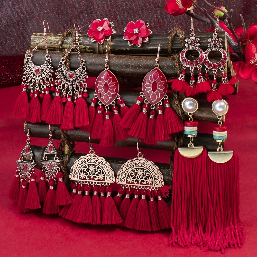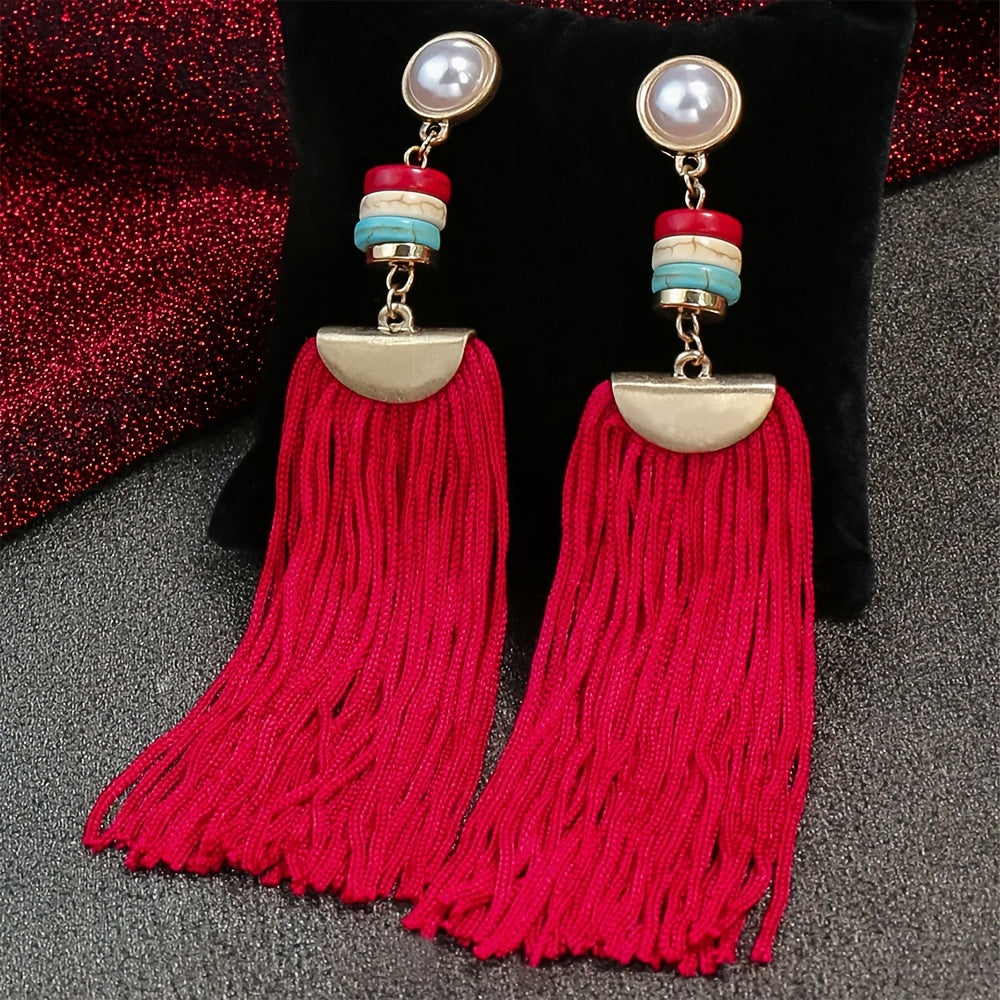 Make a statement with these vintage boho style drop earrings featuring long red tassel pendants. Perfect for weddings or adding a pop of color to your outfit.