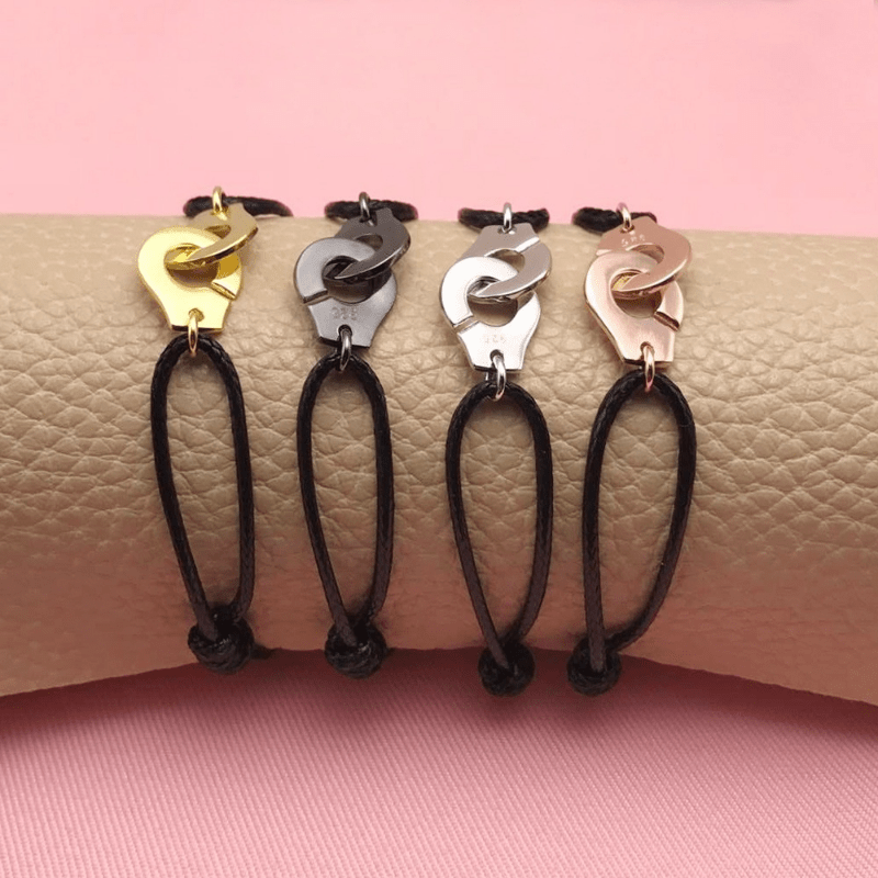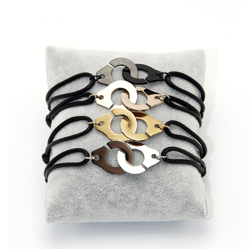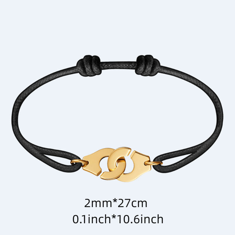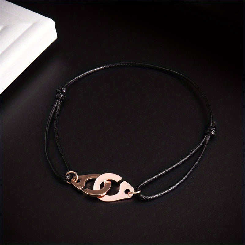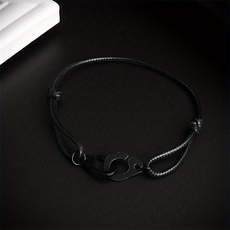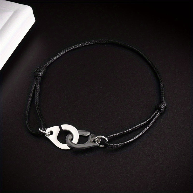 This bracelet features a vintage style with braided leather rope and a stainless steel handcuff design. It is perfect for couples or individuals looking for a unique accessory.
