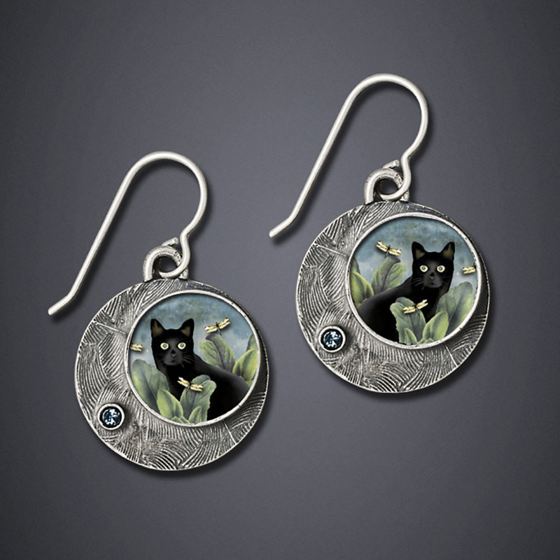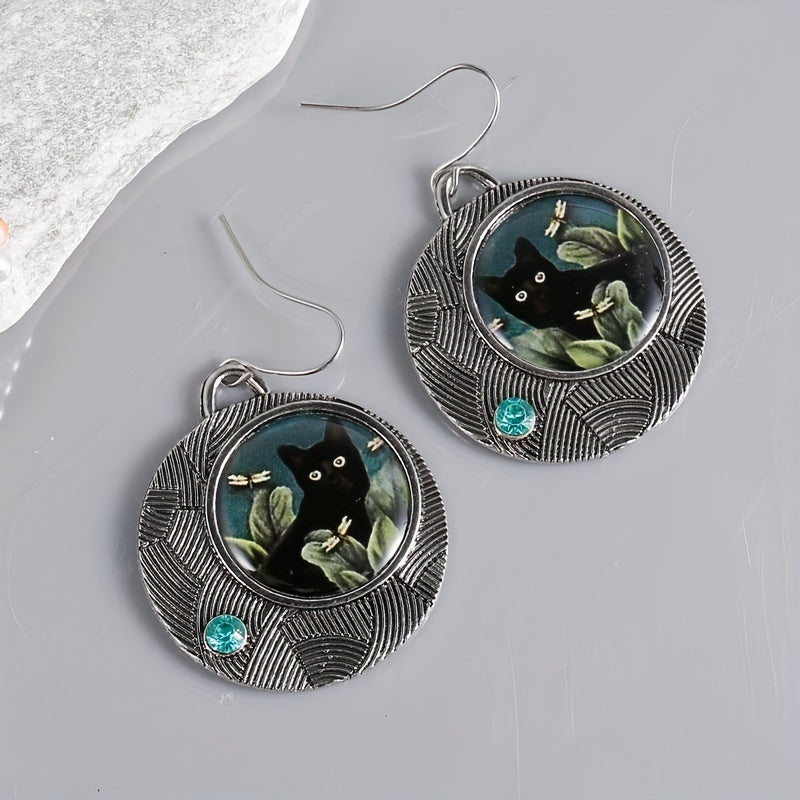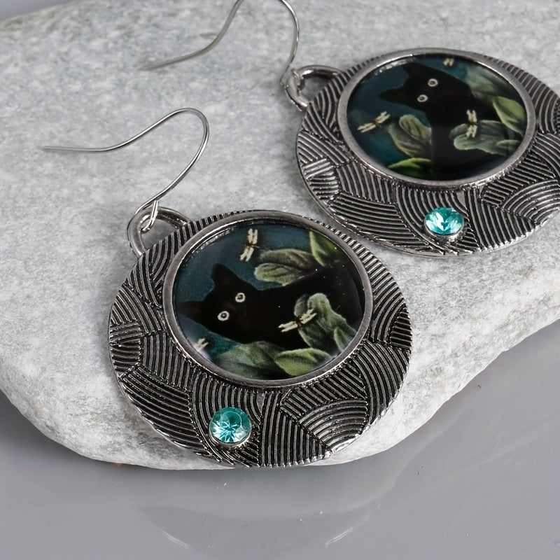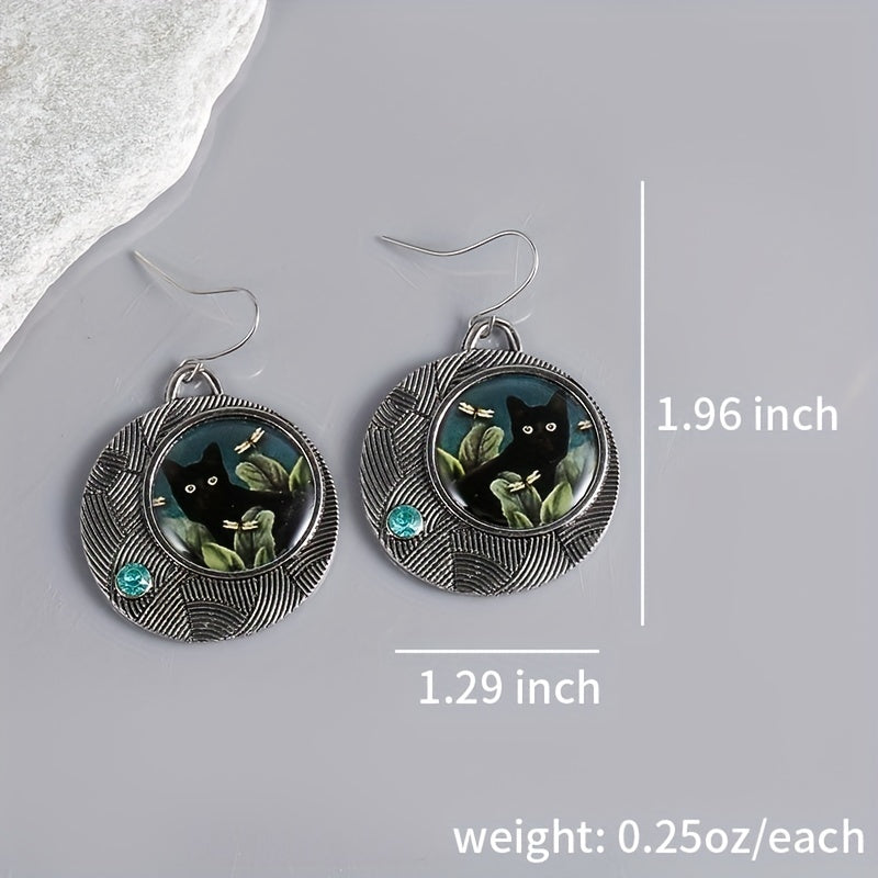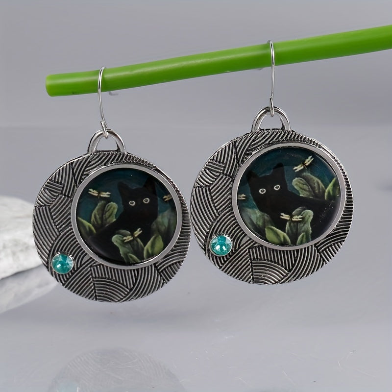 These vintage geometric round earrings feature a unique cat pattern design with faux emerald stone inlay. Perfect for animal lovers and those who appreciate distinctive jewelry pieces.