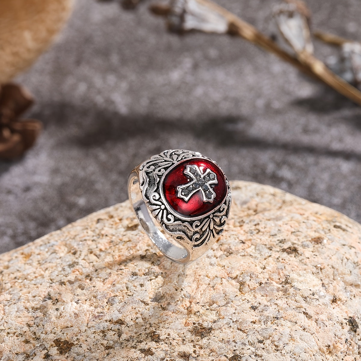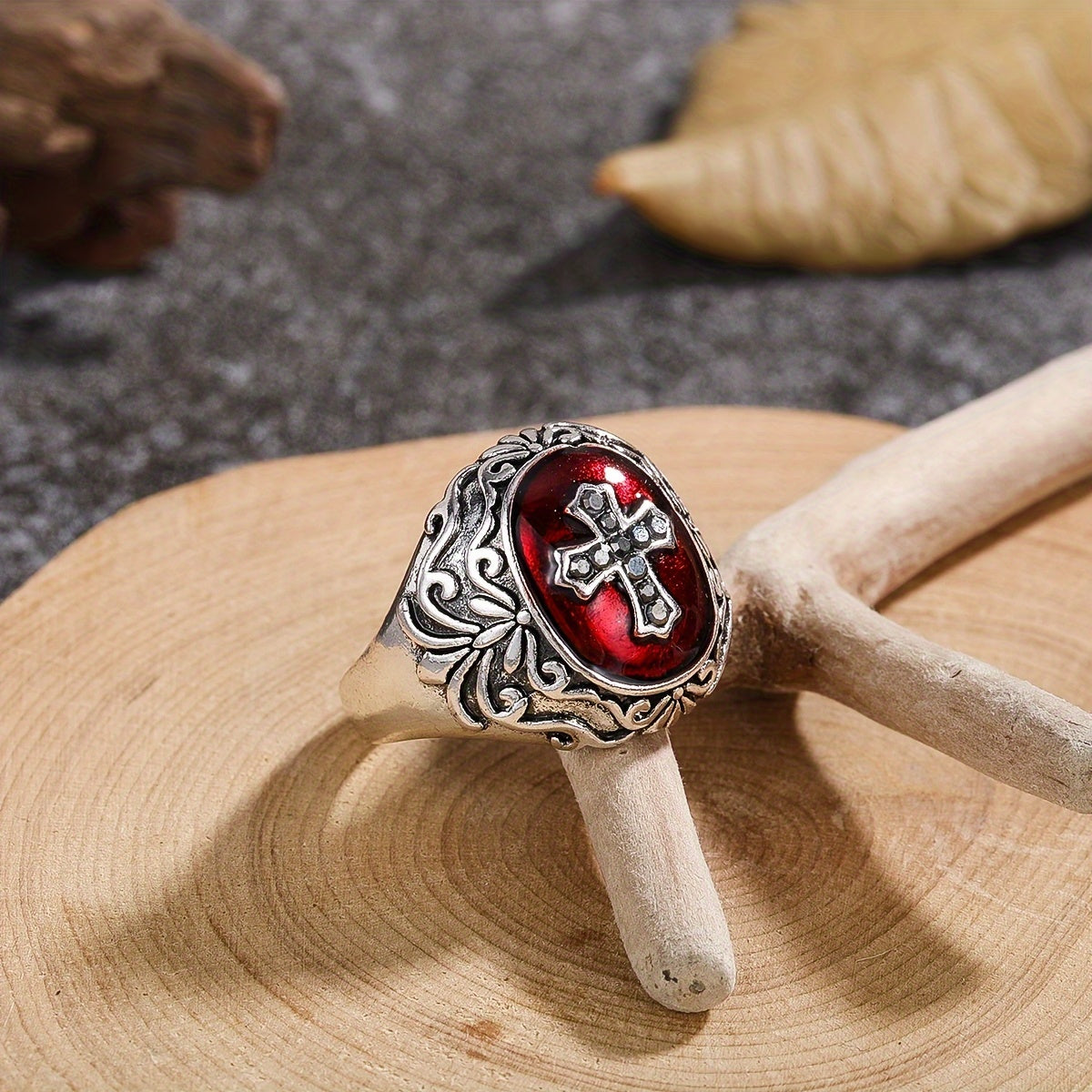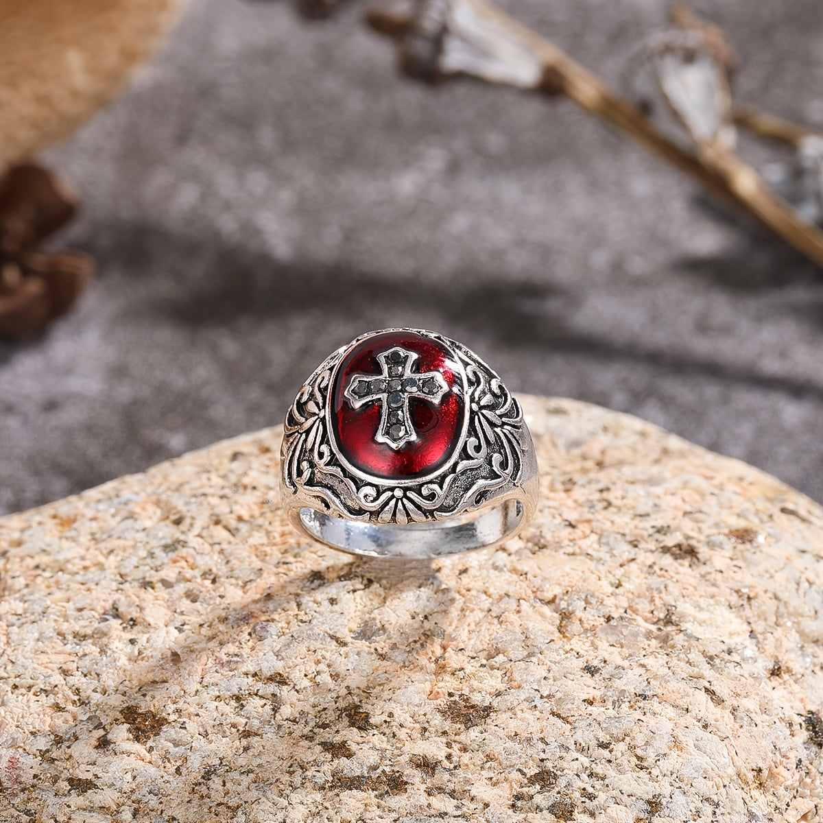 This vintage men's ring features a cross design with red zircon inlay, exuding a retro charm.