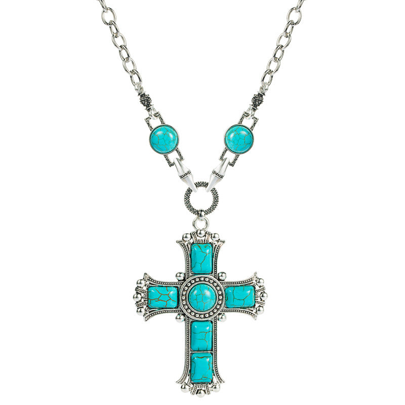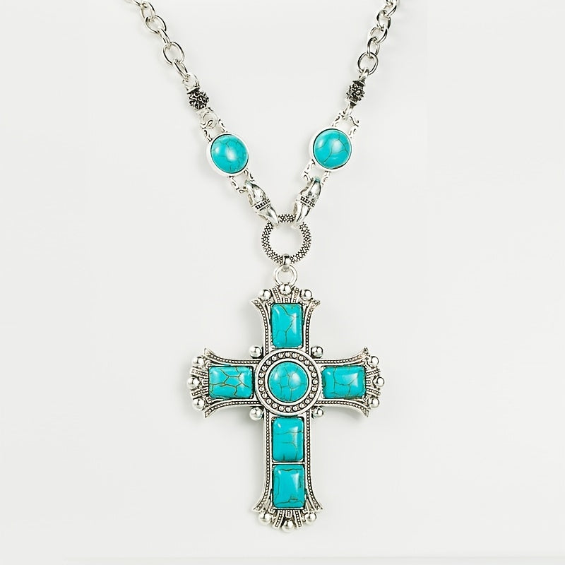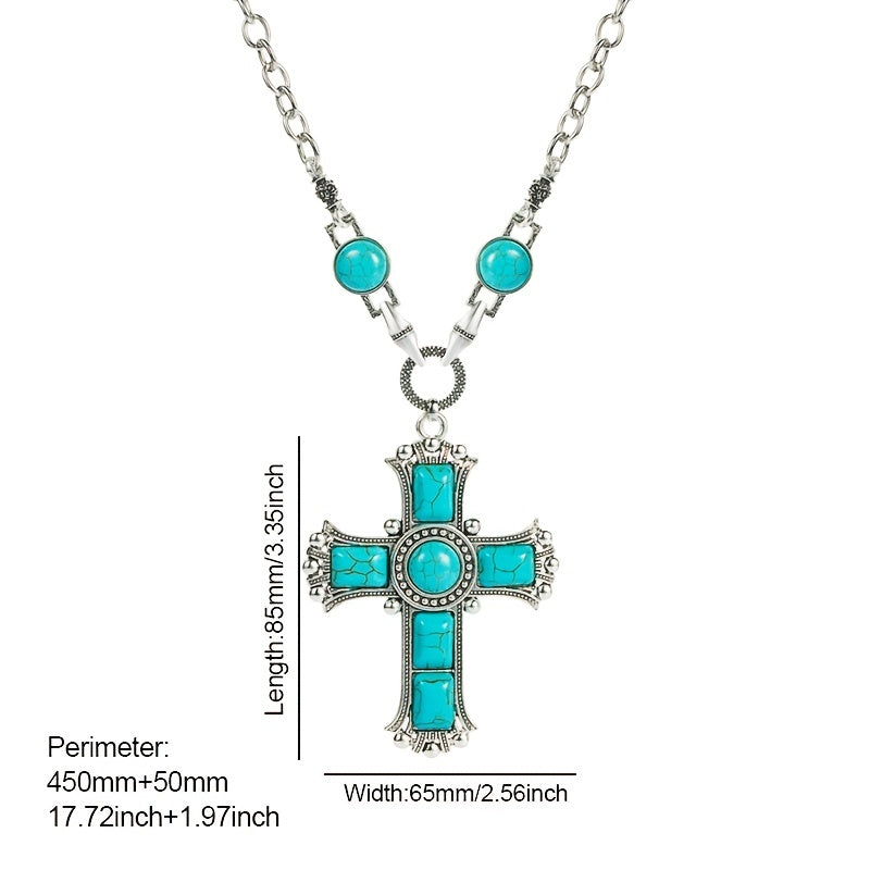 Add a touch of vintage charm to your style with this exaggerated cross shape necklace featuring a turquoise pendant. Perfect for adding personality to your outfits.