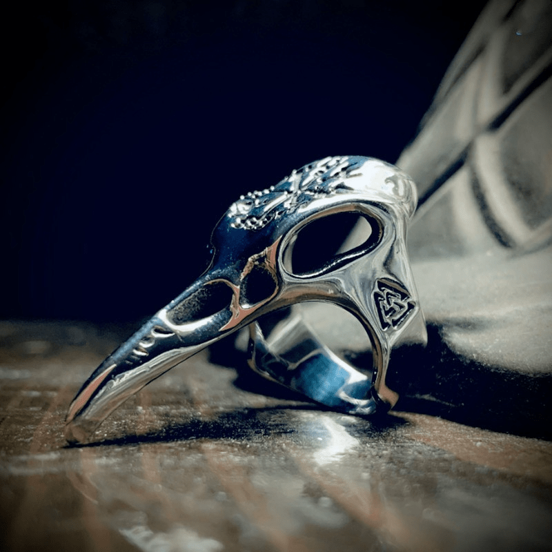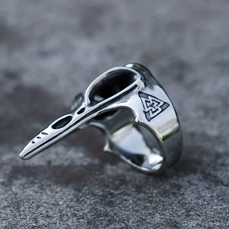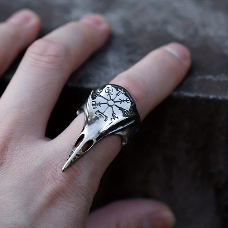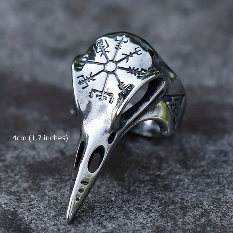 This unique men's ring features a crow skull design with Vedvisir and Valknut symbols, perfect for fans of punk or Viking style. The amulet jewelry is crafted with attention to detail and quality materials.