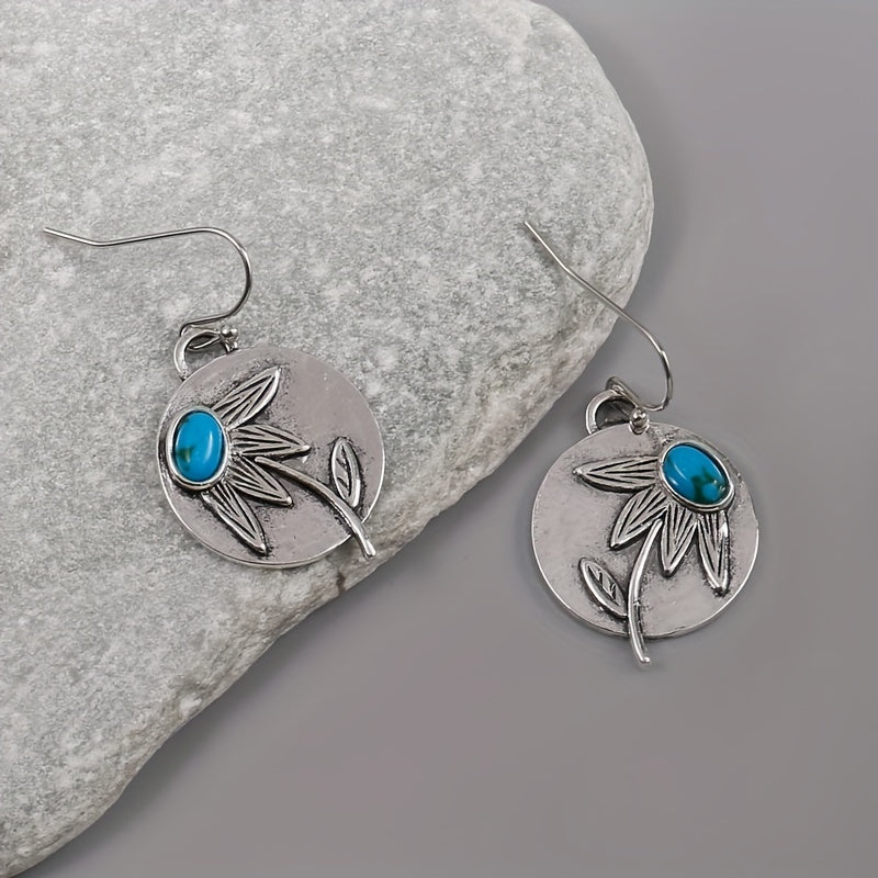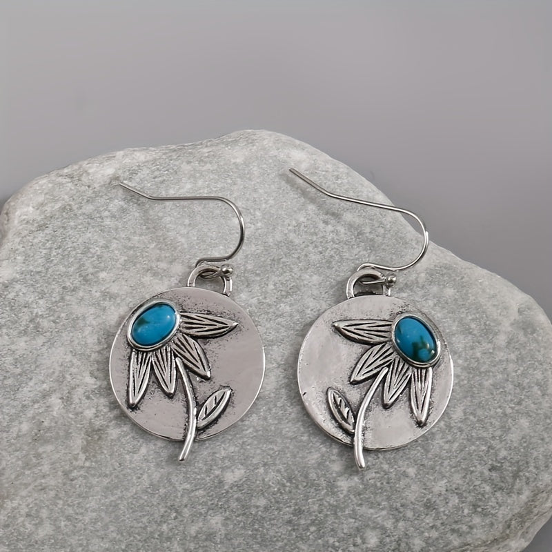 Vintage Disc Turquoise Drop Earrings 925 Silver Plated Ethnic Style Ear Jewelry