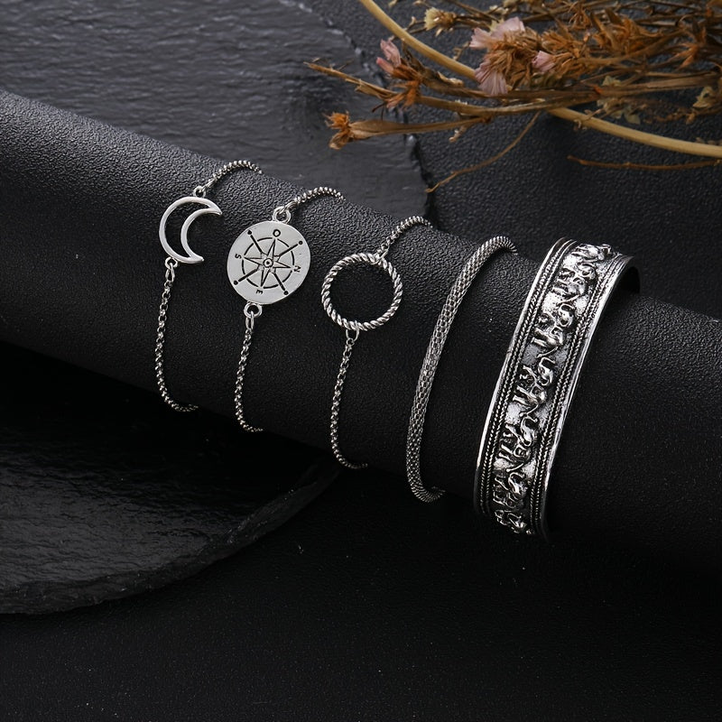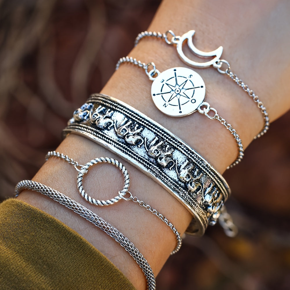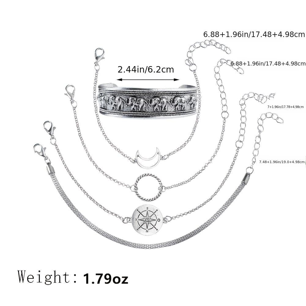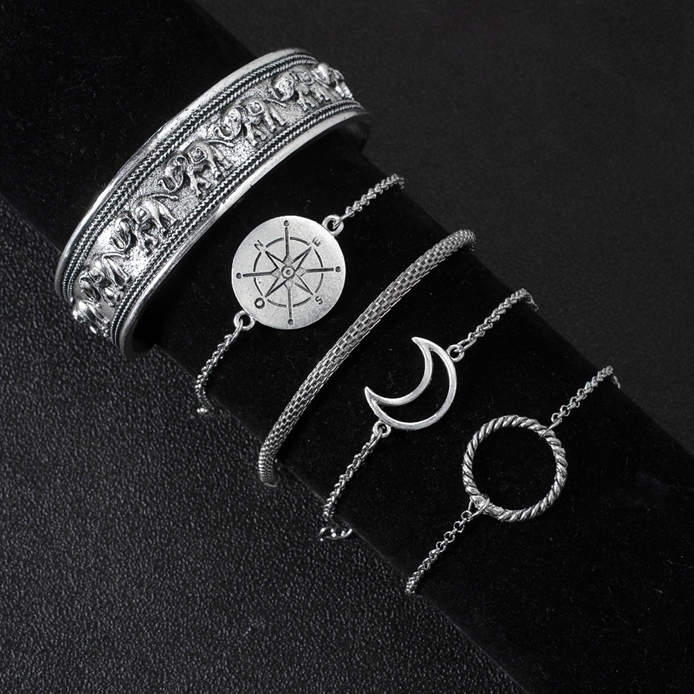 This set includes 5 pieces of bracelets featuring elephant metal relief open cuff bangle, mixed hollow moon & round shapes, and more. Make a statement with this layered bangle set.