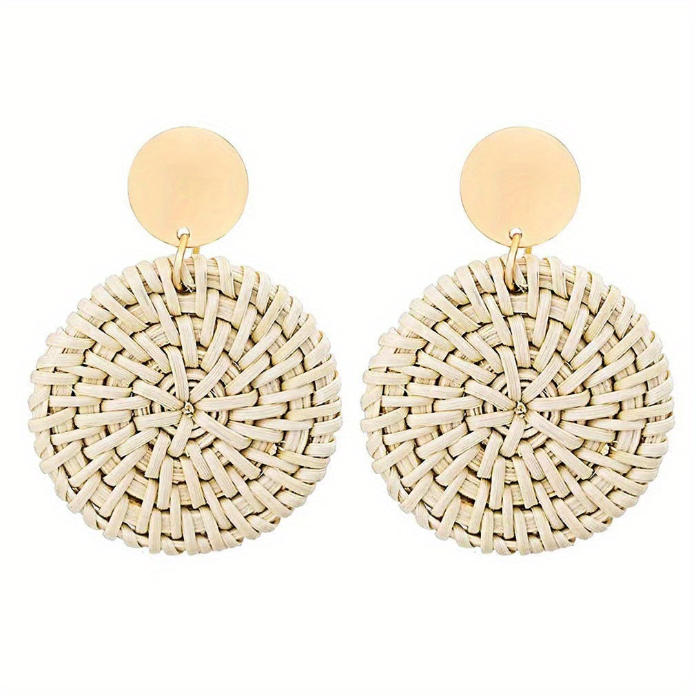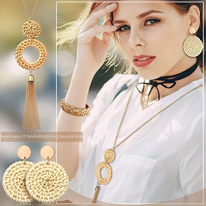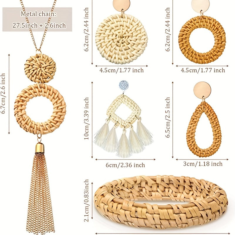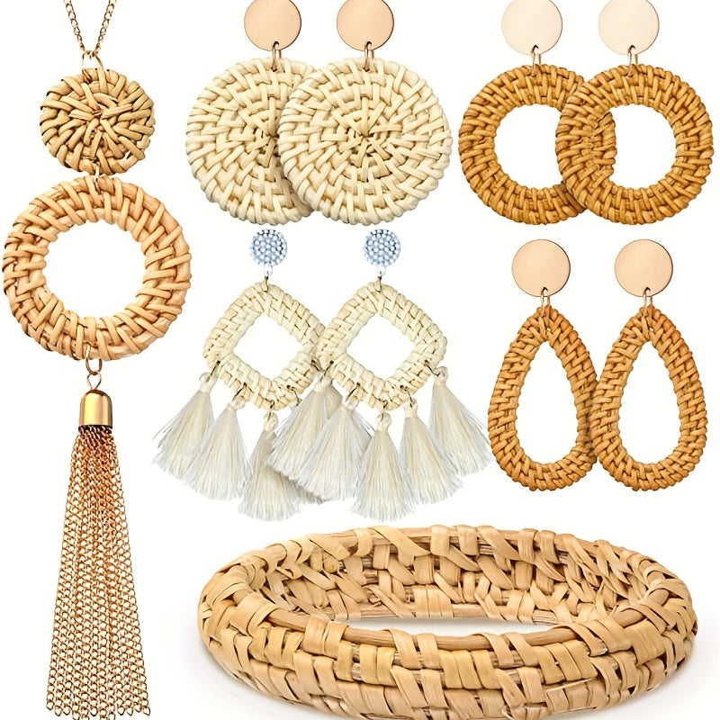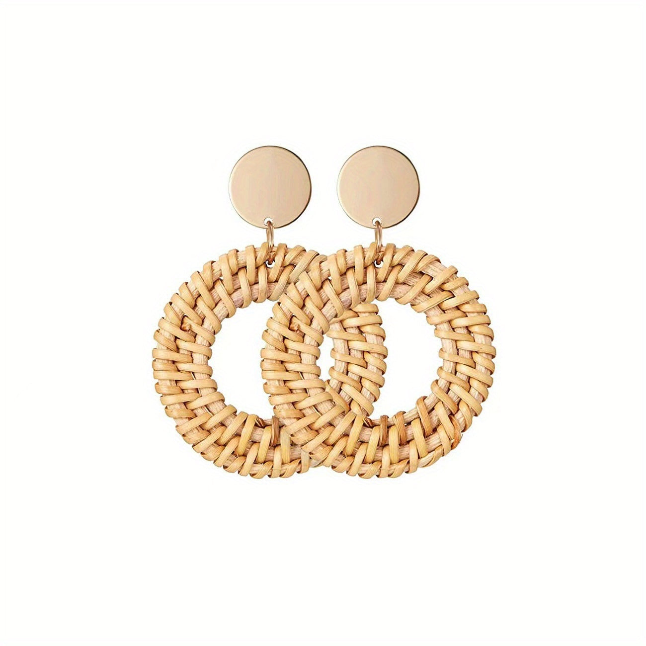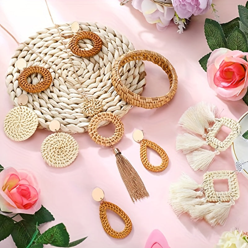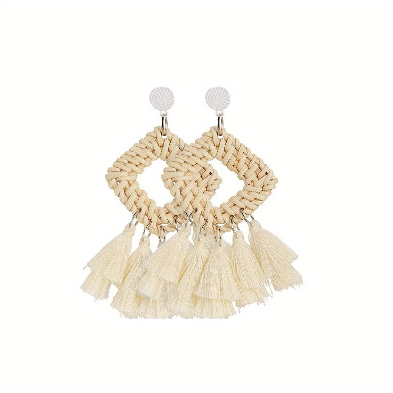Embrace a bohemian look with these vintage geometric vine braided earrings bangle. Perfect for a beach style, these lightweight earrings feature an exaggerated vine woven design with acrylic tassel for a summer vibe.