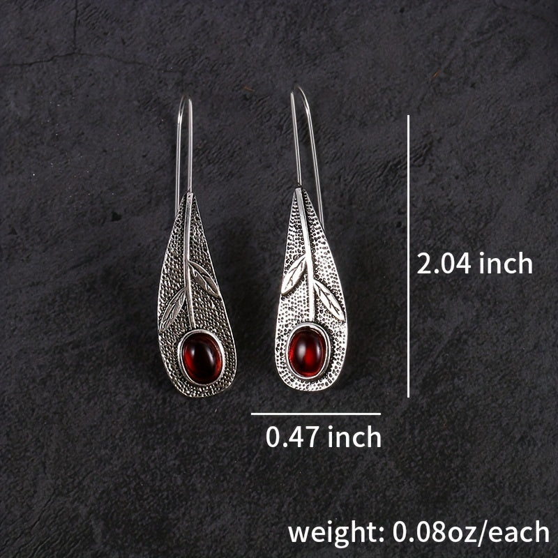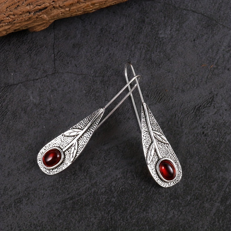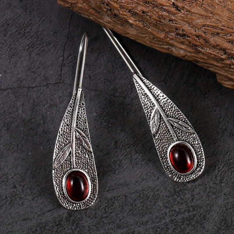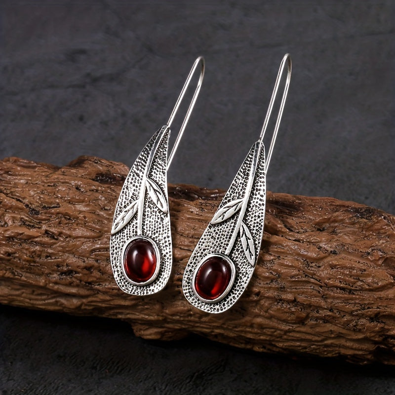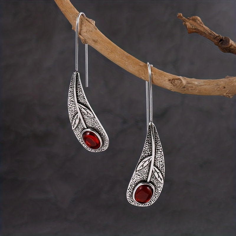 Elegant hand-carved leaf flower earrings with inlaid red crystal design. Perfect for women's jewelry collection.