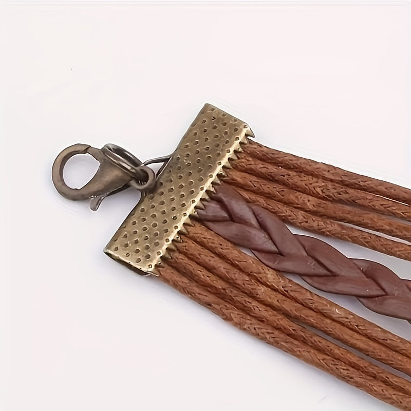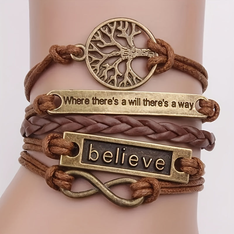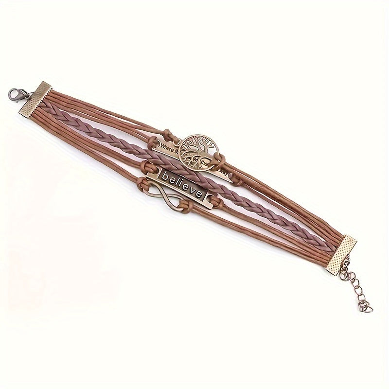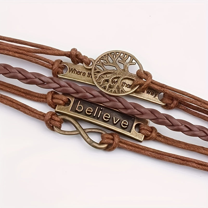 This vintage handwoven bronze bracelet features a leather rope with a tree pattern and the word BELIEVE. Perfect for men's casual or formal wear.