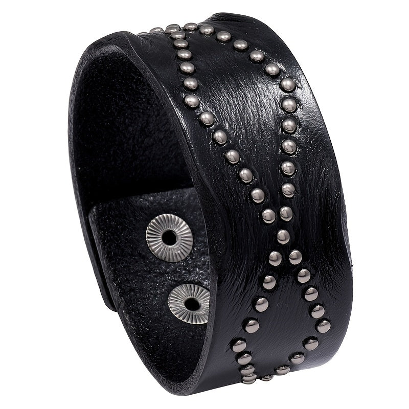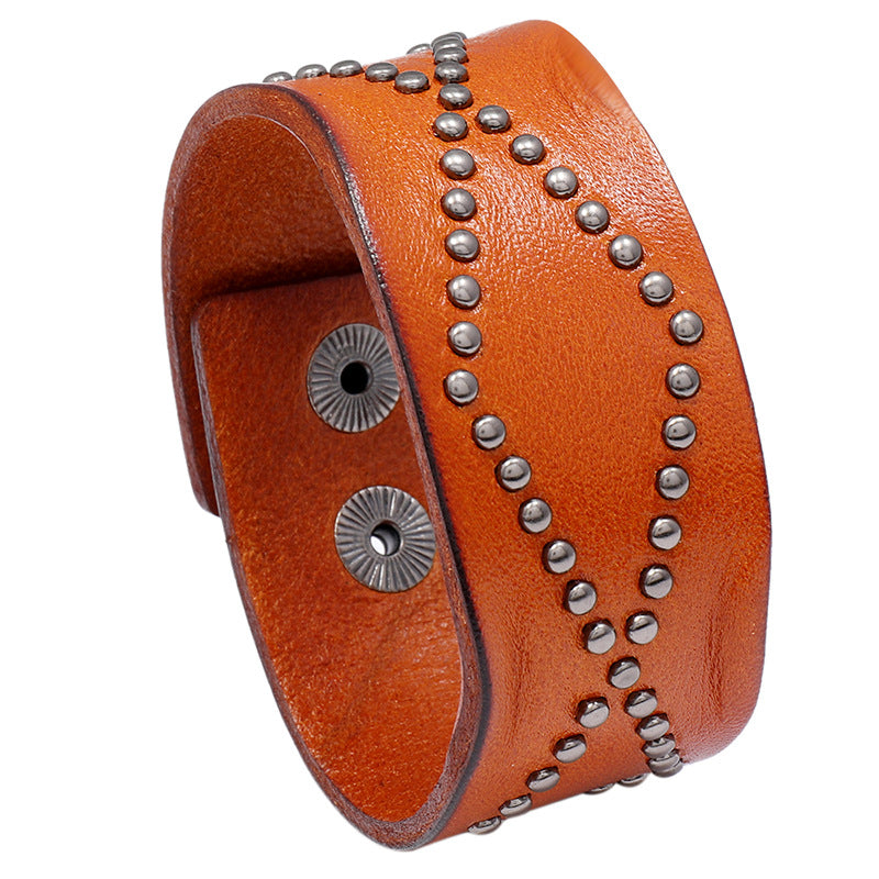 This vintage leather bracelet features metal rivets for a stylish look. It is designed for men and the wide leather wristband adds a touch of rugged charm.
