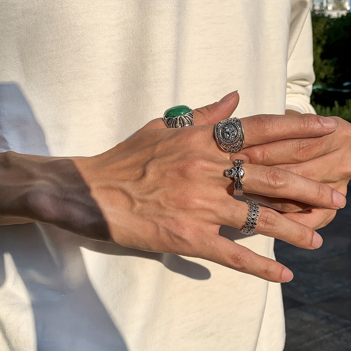 Elevate your style with this 4-piece vintage Malachite ring set featuring a striking skull design and unique detailing.