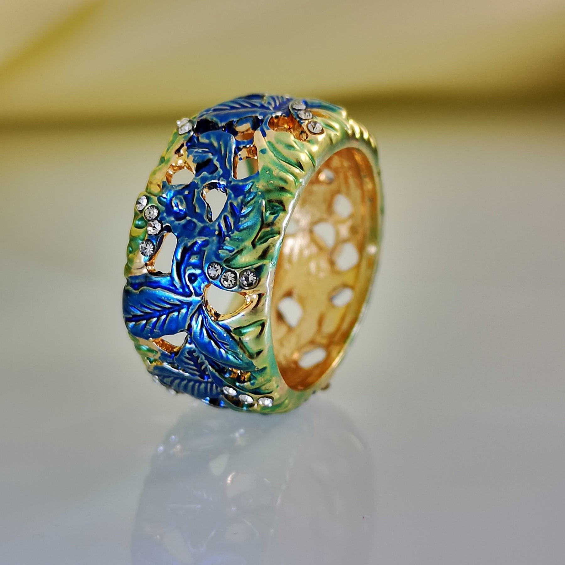 This vintage ring features a unique design with painted flower and leaf details. The enamel adds a pop of color to the piece.