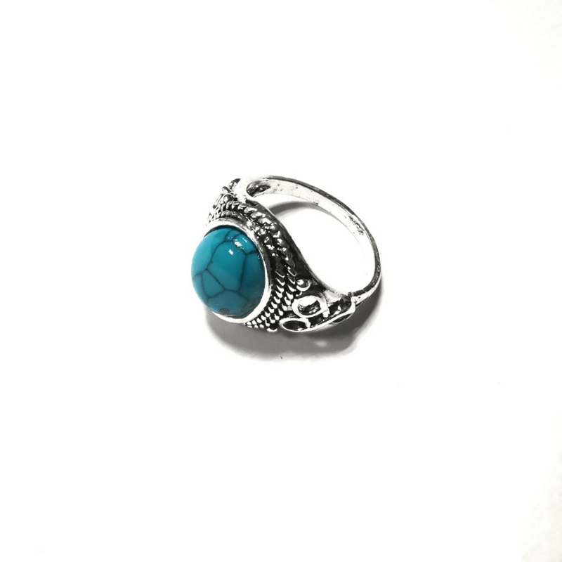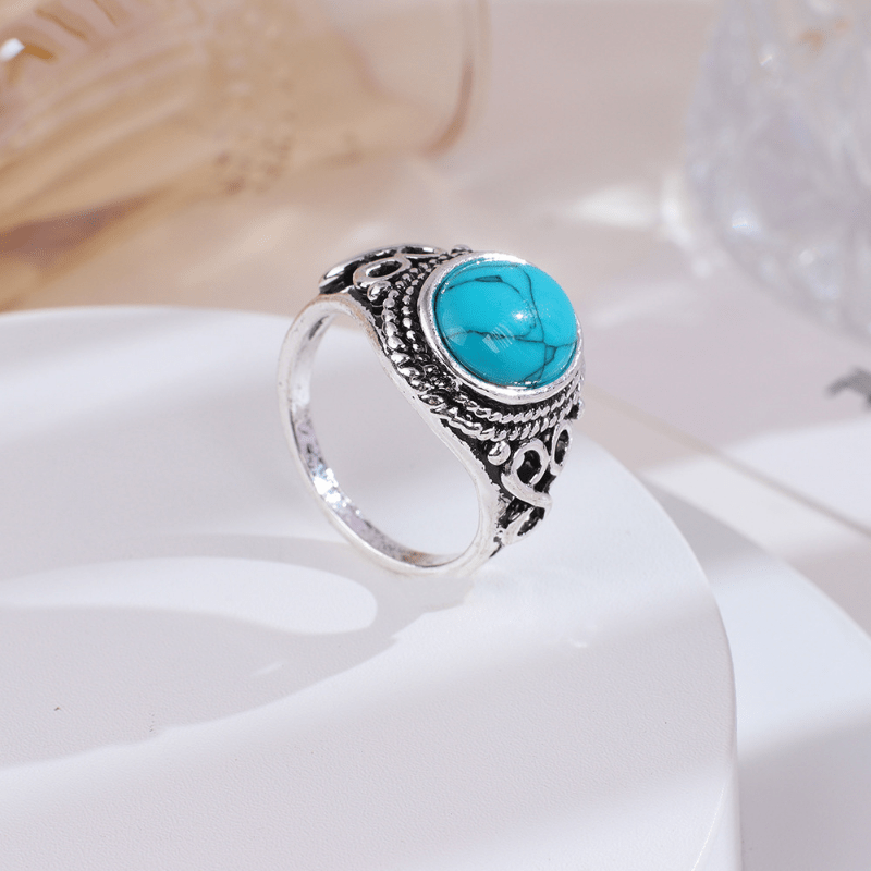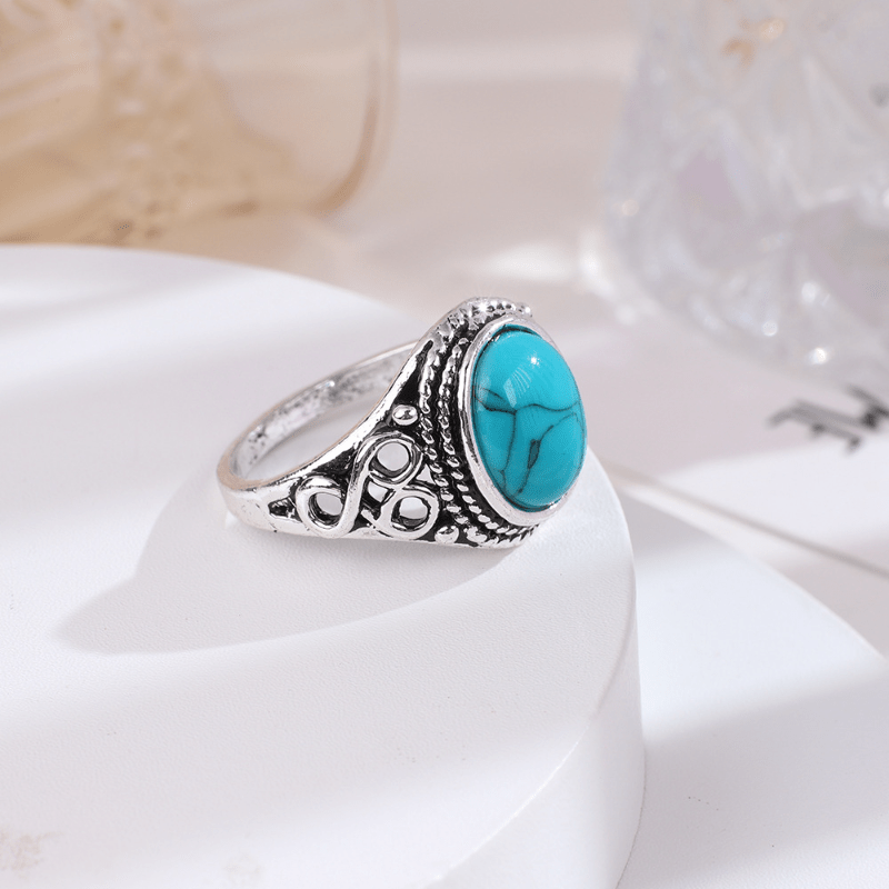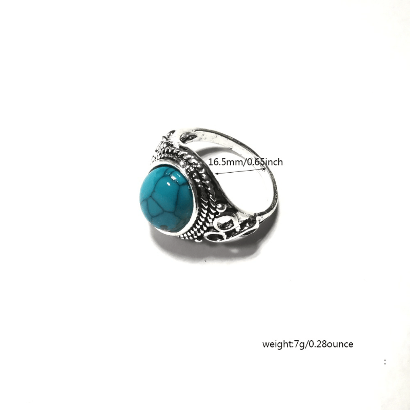 This vintage-style ring features a natural turquoise gemstone set in a metal alloy band, suitable for both men and women.