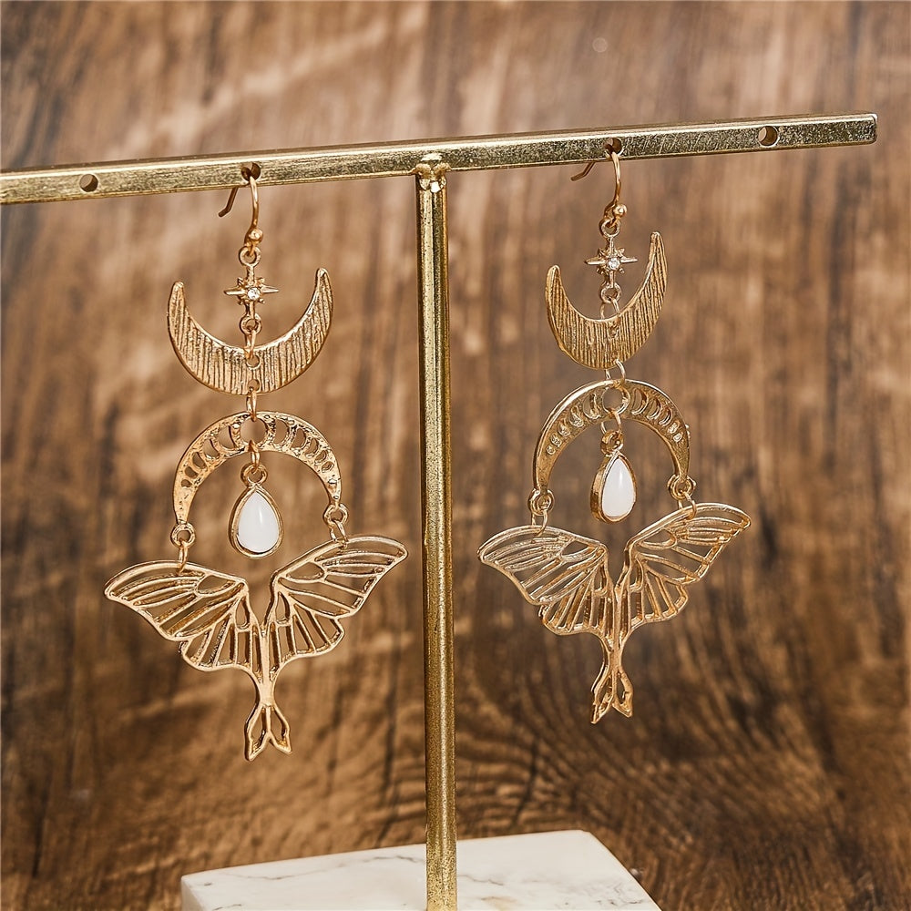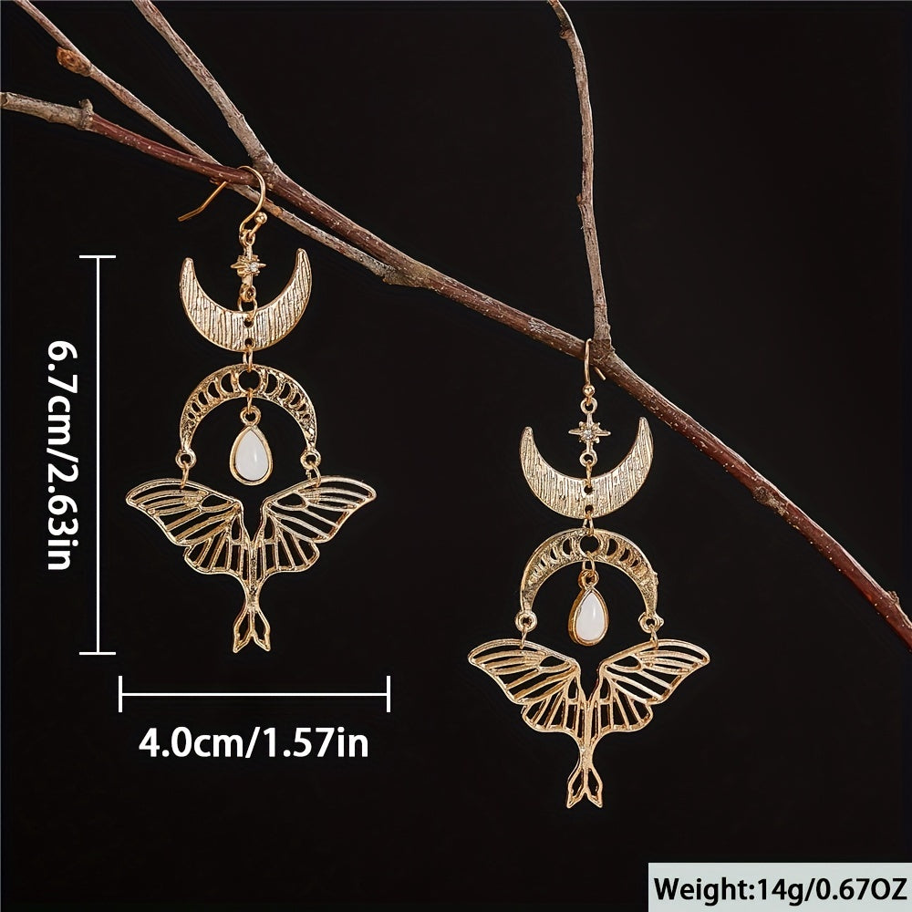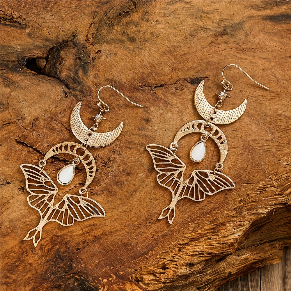These vintage-inspired earrings feature a moon and moth design with natural stone dangles. Great for adding a boho touch to your look.