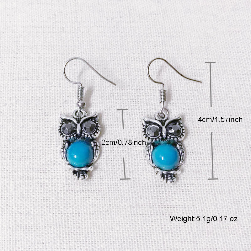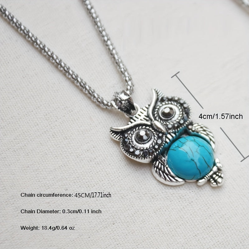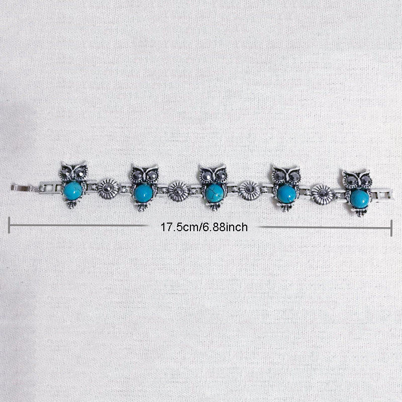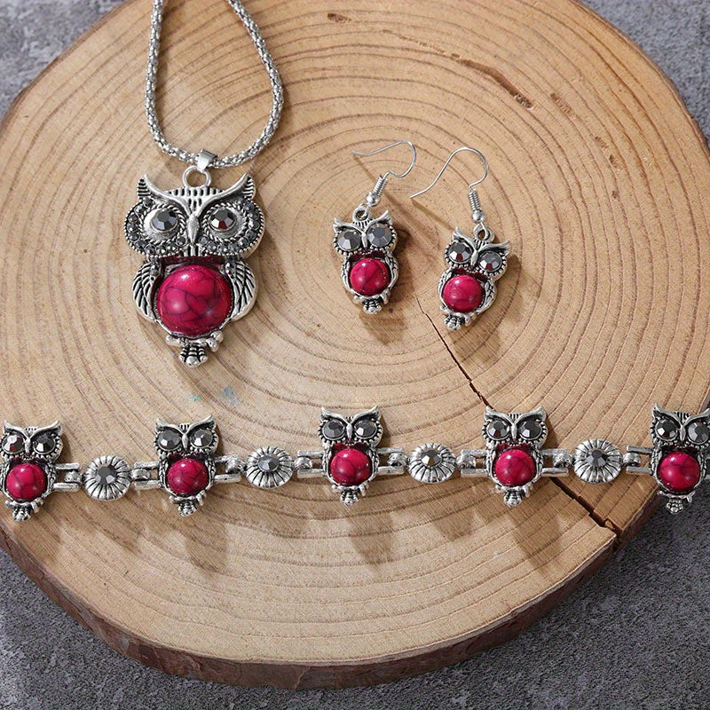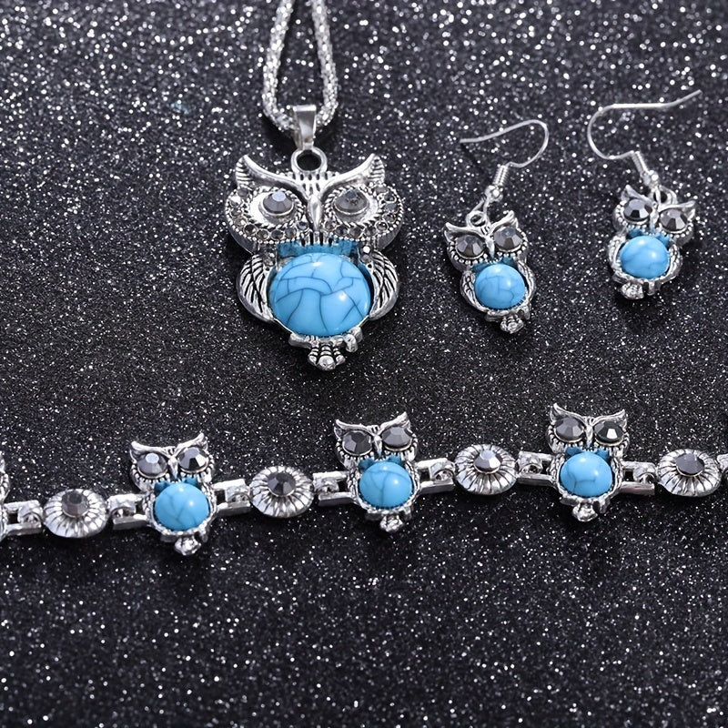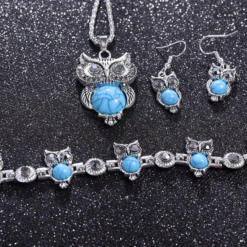 This vintage owl jewelry set includes a pendant necklace, chain bracelet, and drop earrings with inlaid turquoise, making it the perfect accessory for weddings and special occasions.