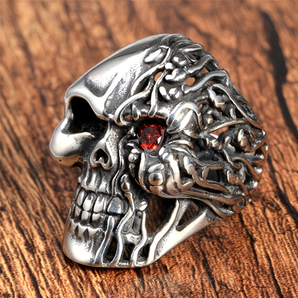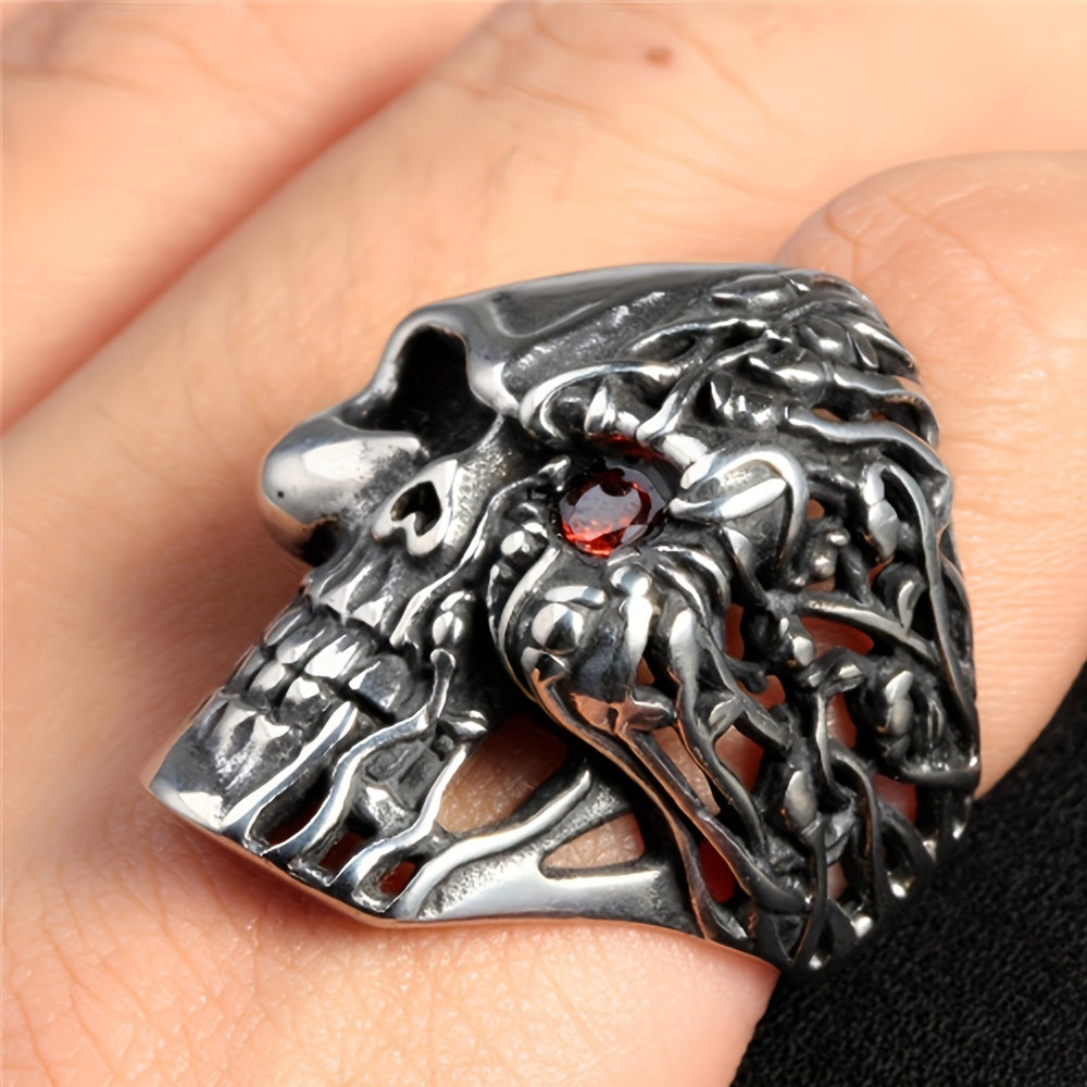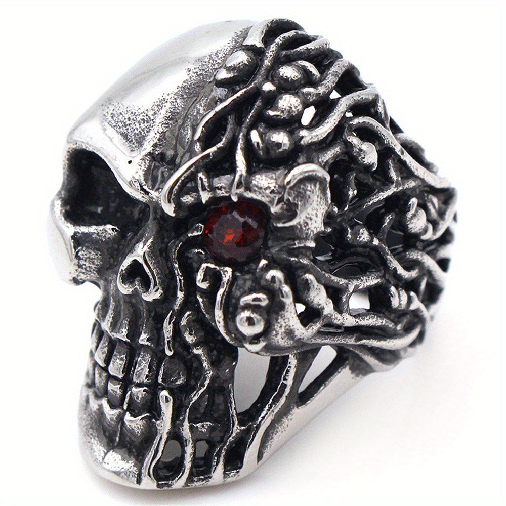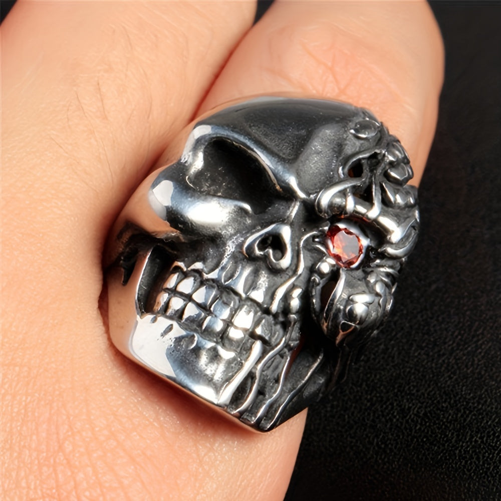 This vintage ring features a red cubic zirconia double-faced cyclopia skull design. Perfect for Gothic style enthusiasts.