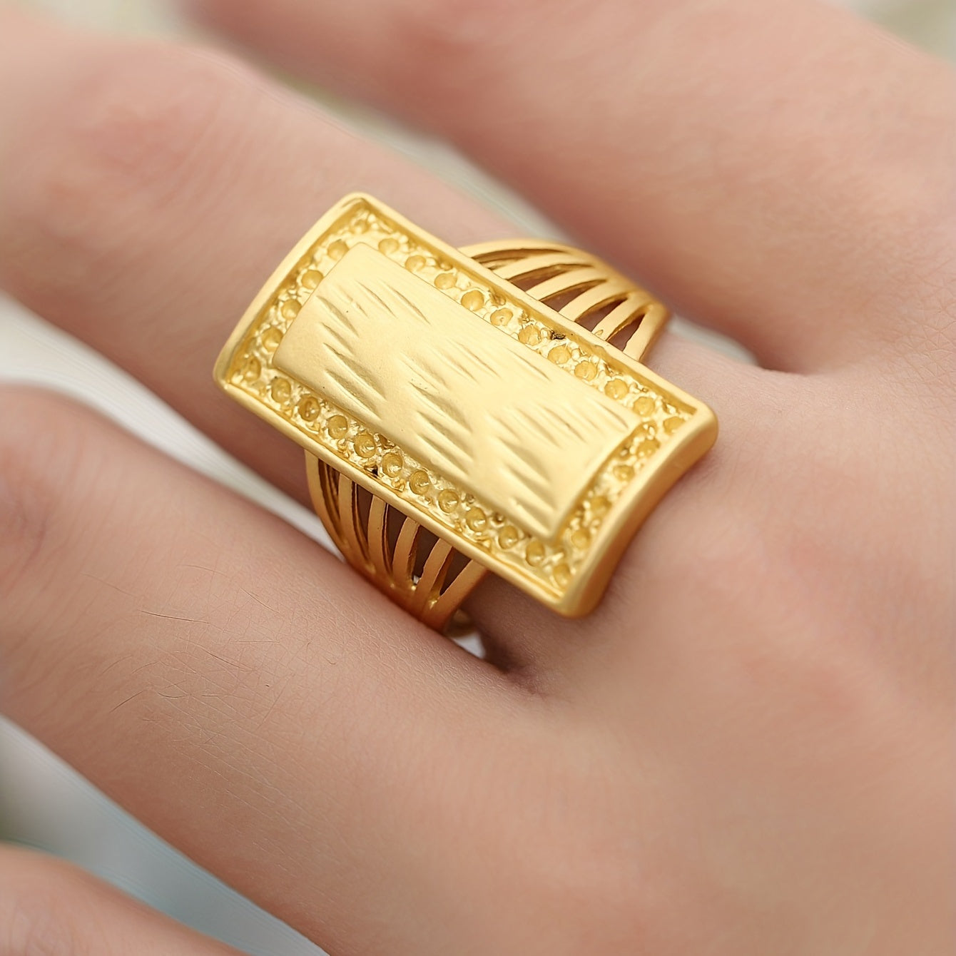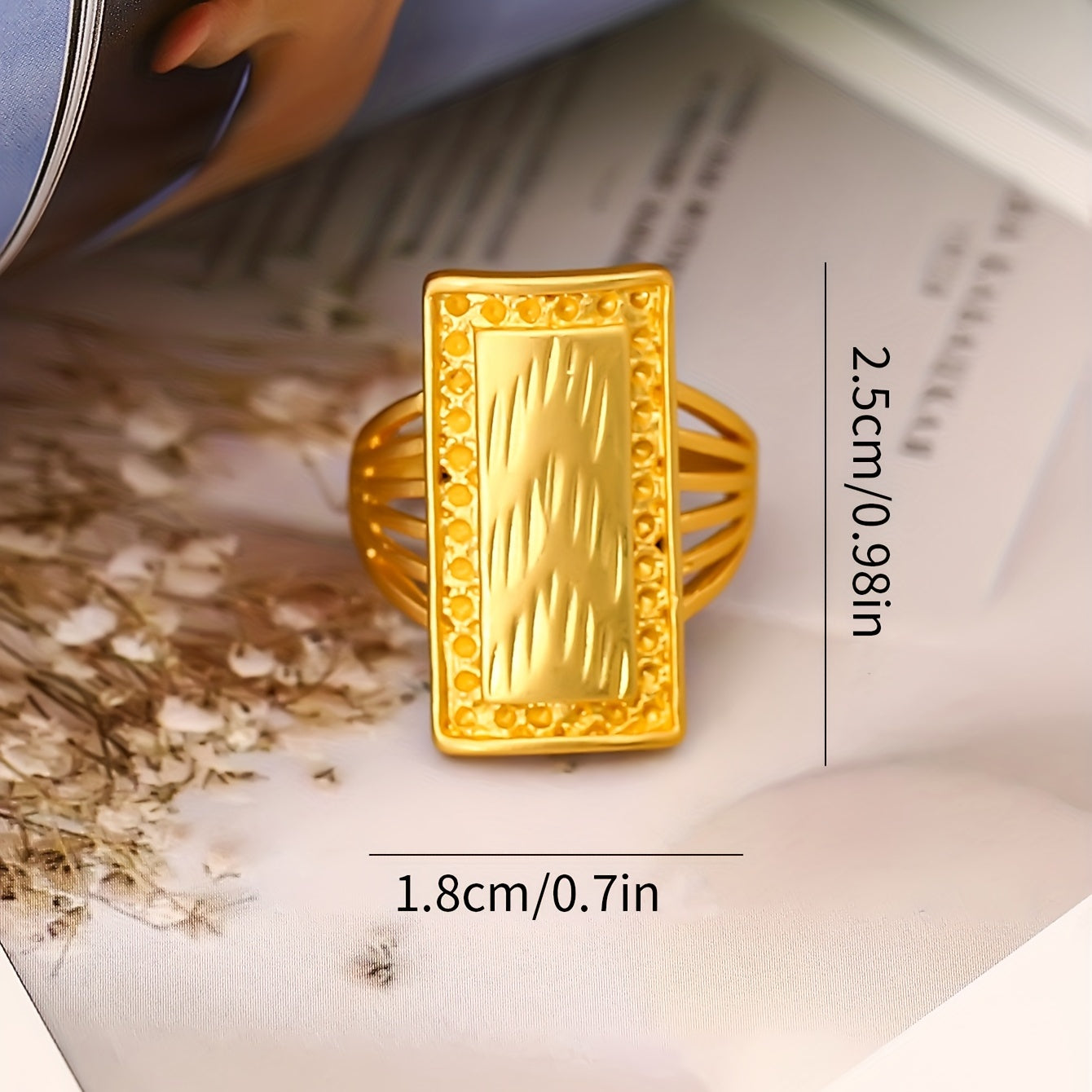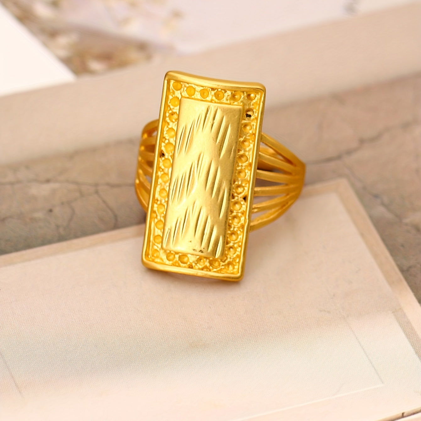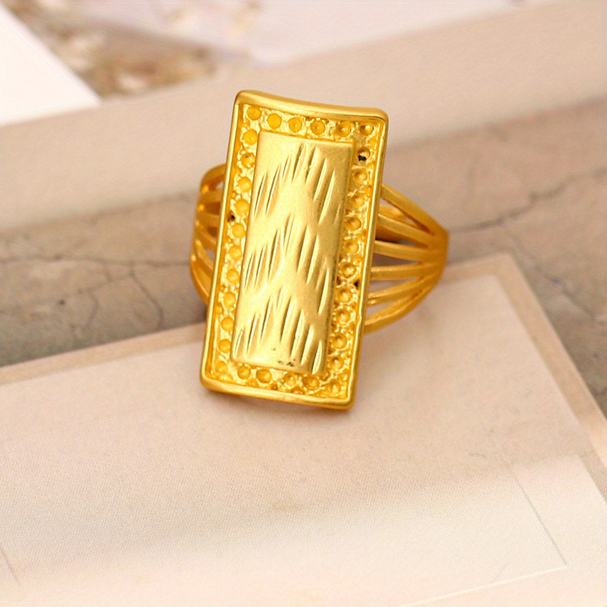 Elegant vintage royal ring with 18k gold plating, rectangular shape, and cut surface. A perfect gift for anniversary, birthday, or Christmas decoration.