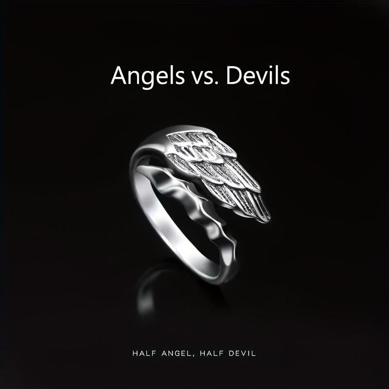 This stunning single ring features an angel and devil design in a vintage silver finish. Perfect for couples, this unique piece is sure to make a statement.