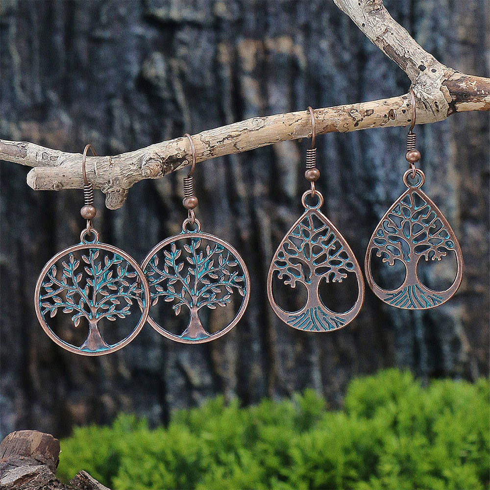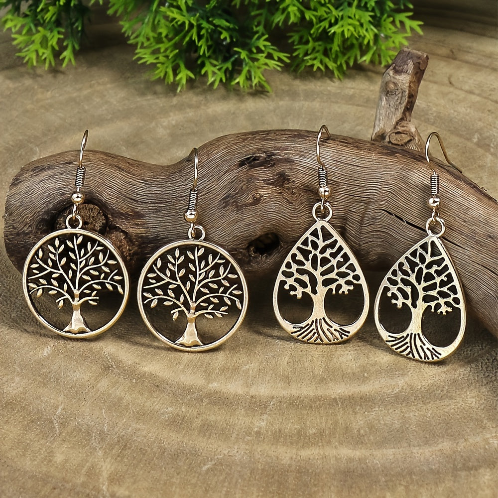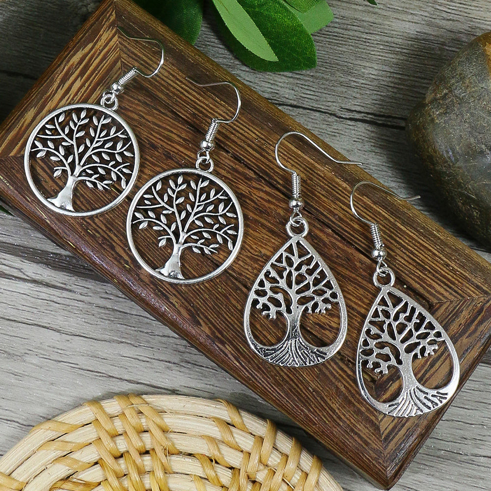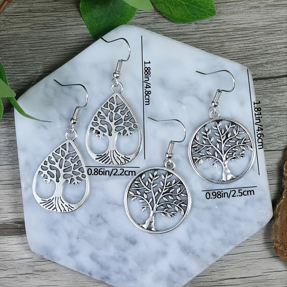 Embrace retro charm with these antique silver vintage style round drop shape earrings featuring a hollow tree of life design. This set includes 2 pairs of earrings perfect for adding a touch of elegance to your outfit.