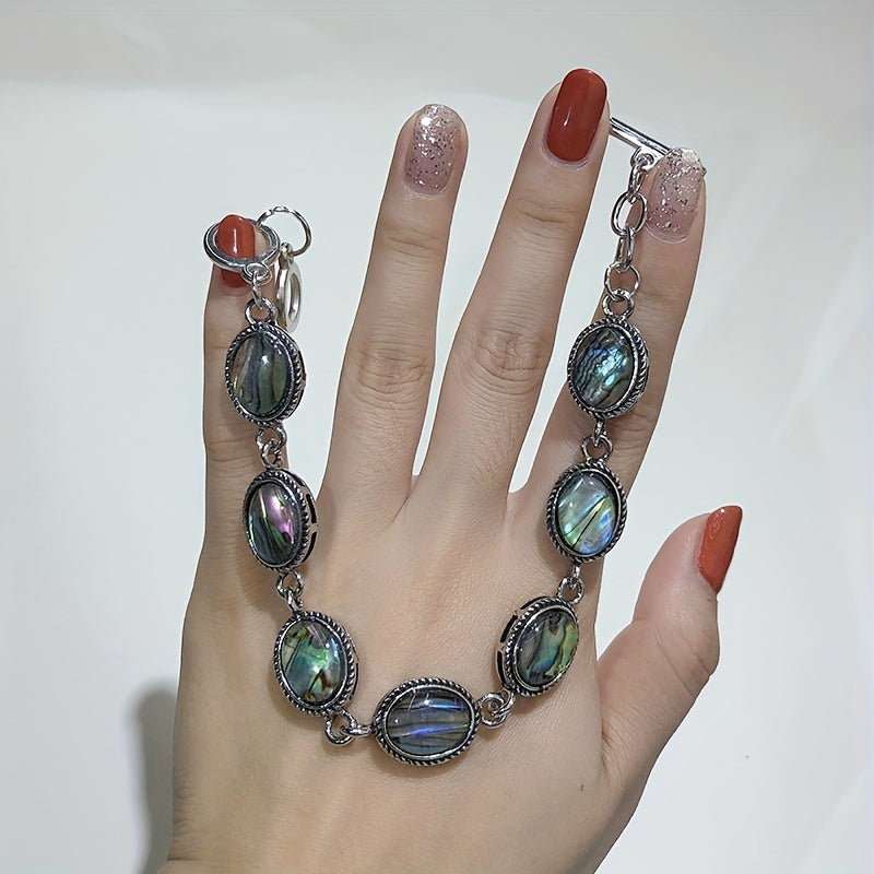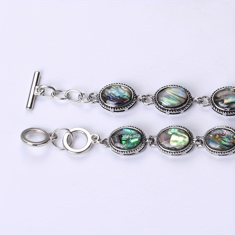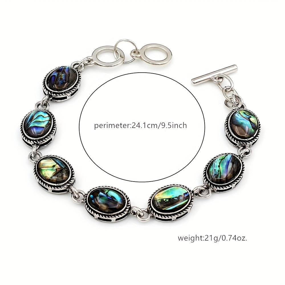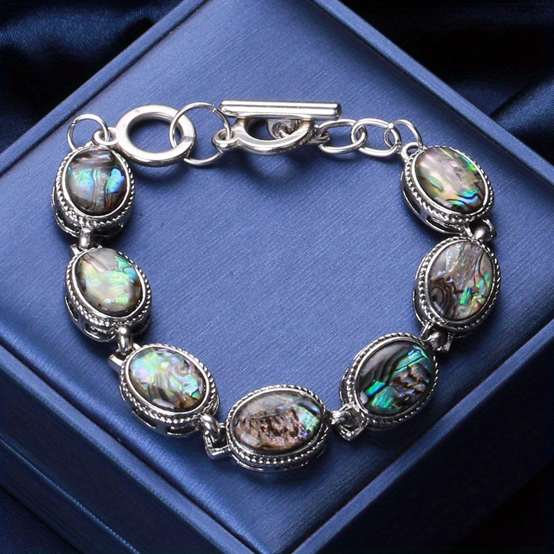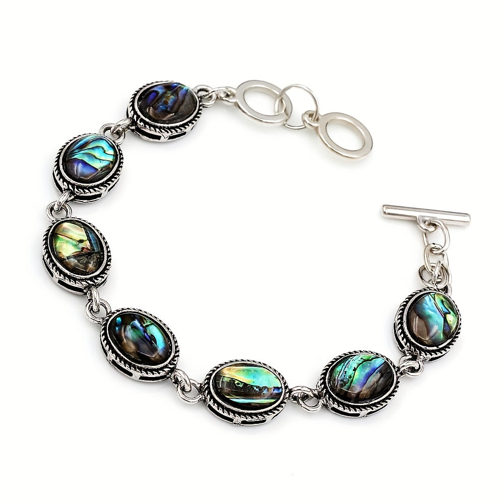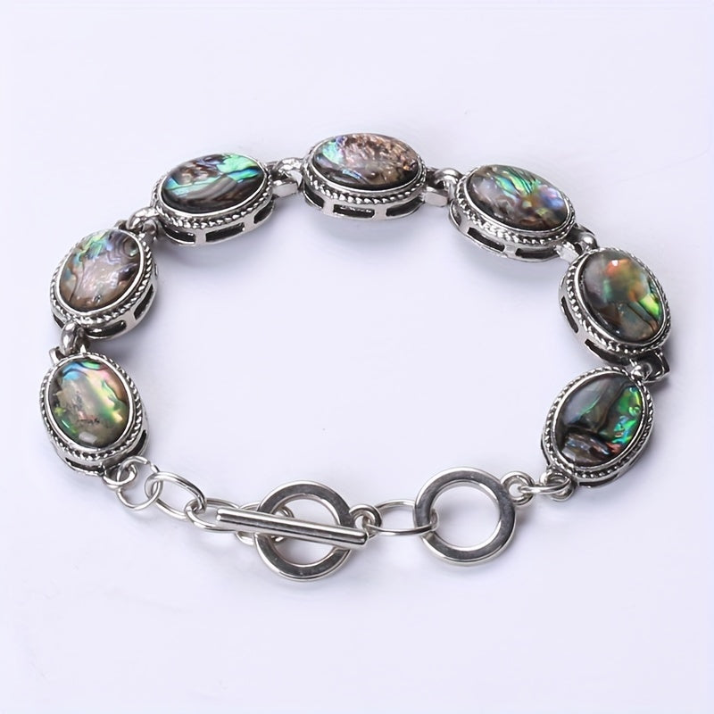 Add a touch of colorful vintage charm to your style with this beautiful oval abalone shell link charm bracelet. A perfect gift for women who appreciate unique jewelry pieces.