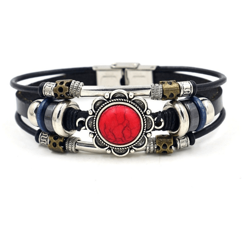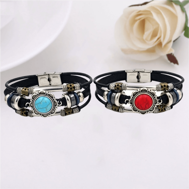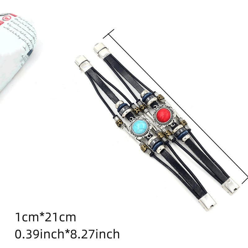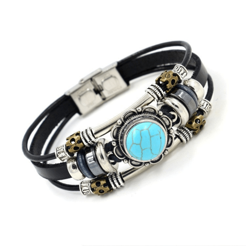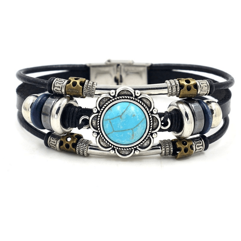 This multilayer bracelet features turquoise beads and a stainless steel buckle. It adds a touch of vintage charm to any outfit.
