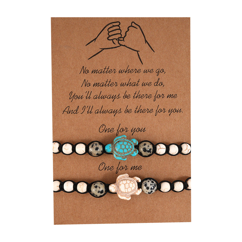 Hand braided couple bracelet with turquoise turtle beads for a unique and charming look.