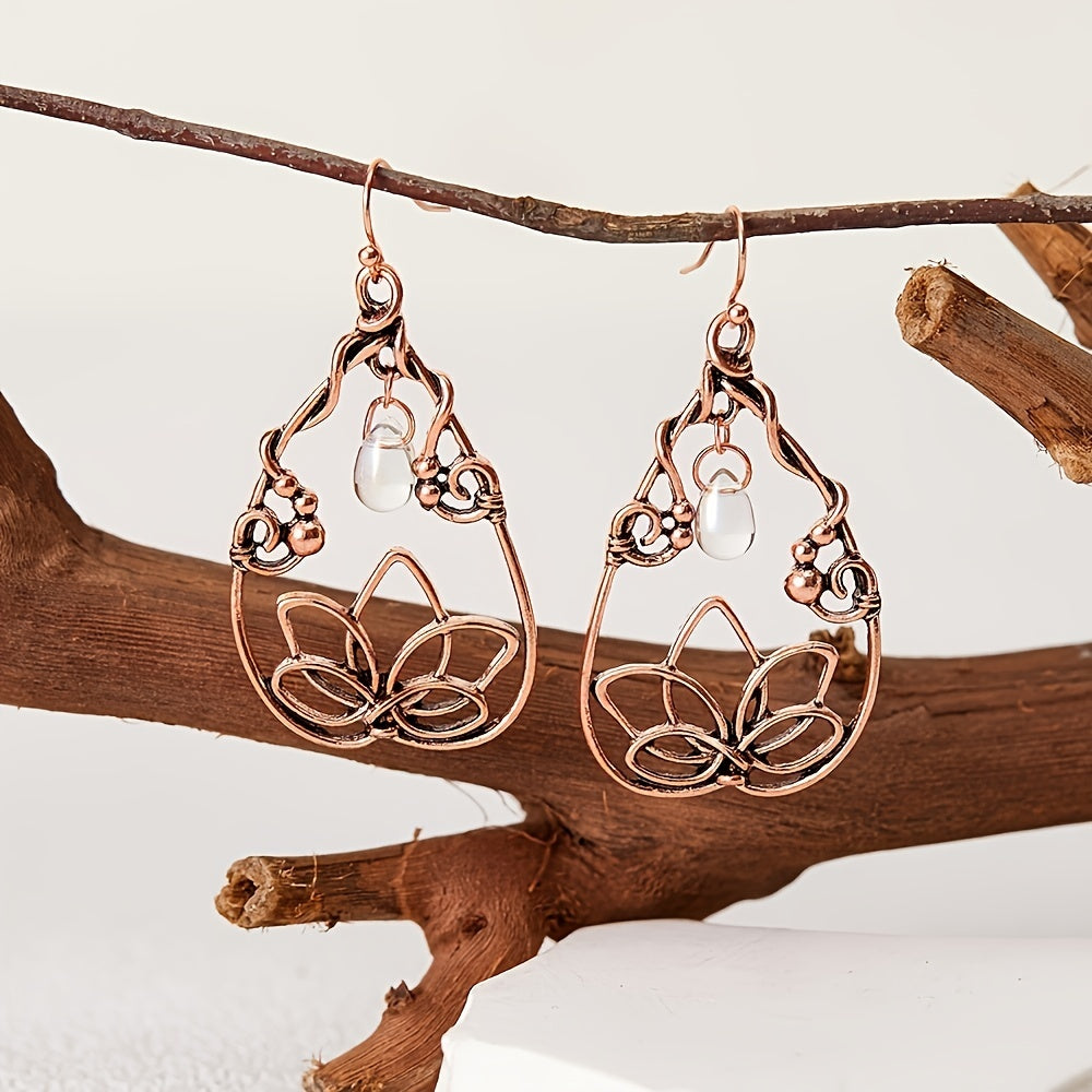 These boho style earrings feature a golden vintage water drop lotus pendant with moonstone dangle accents. Perfect for parties or as a gift.