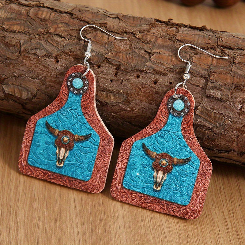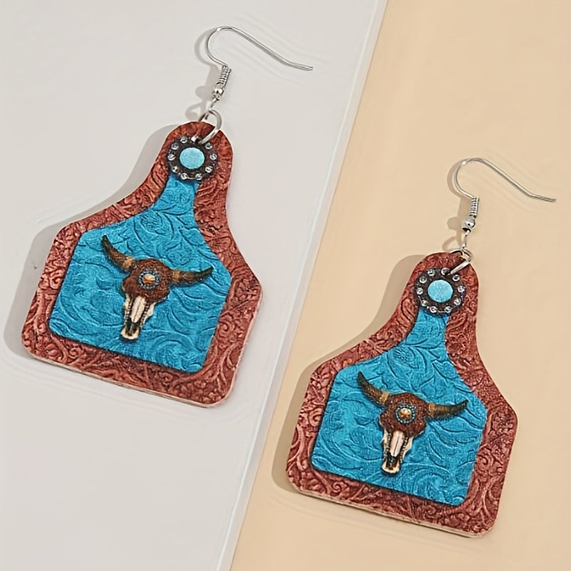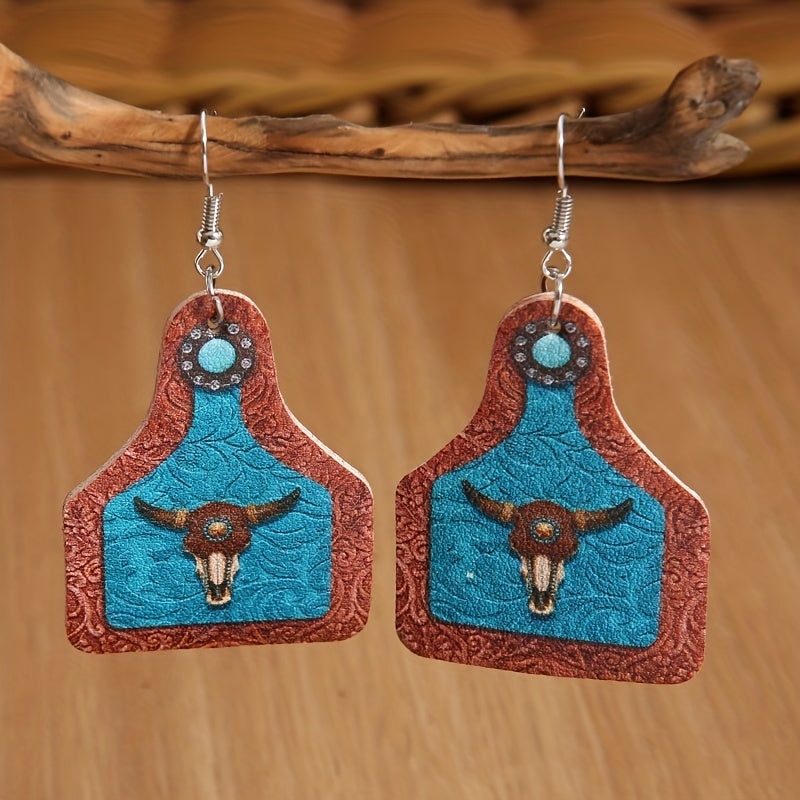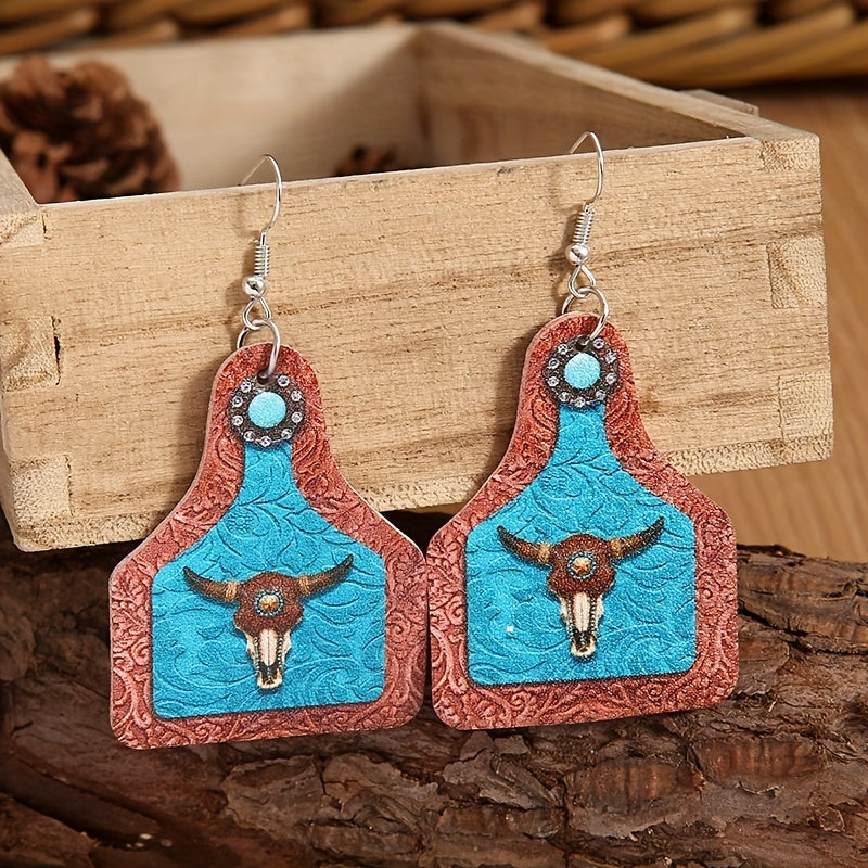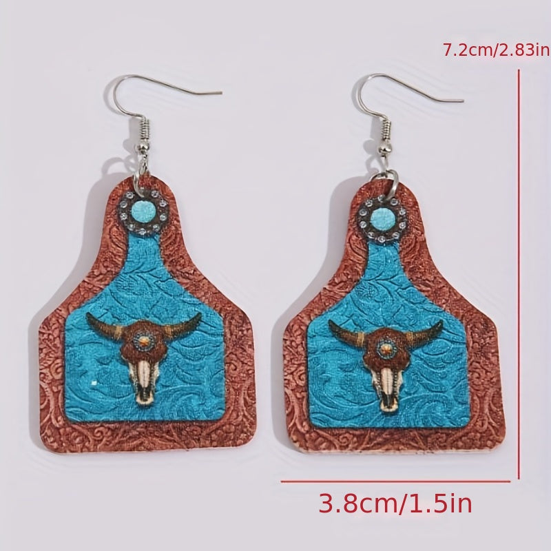 Unique and creative dangle earrings featuring a bull head print on a vintage wine bottle shape. Great as a gift or souvenir for women who appreciate artistic and unconventional jewelry.