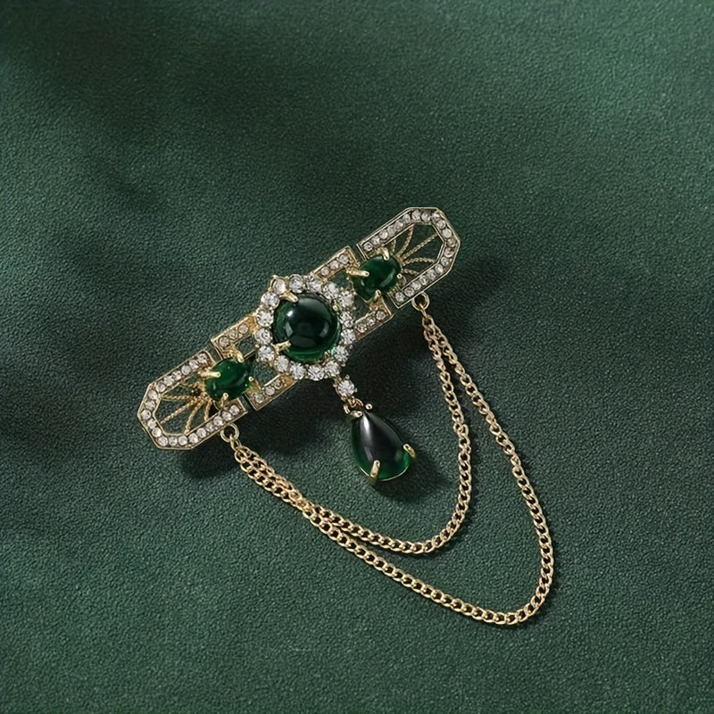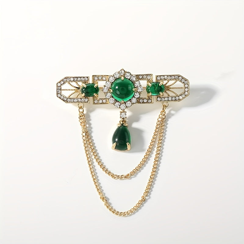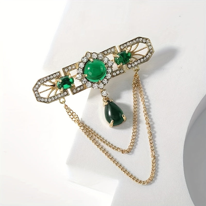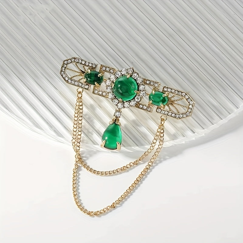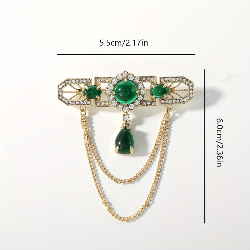 Elevate your look with this exquisite tassel brooch featuring zircon and green gemstones. Perfect for adding a touch of elegance to your suit or coat.