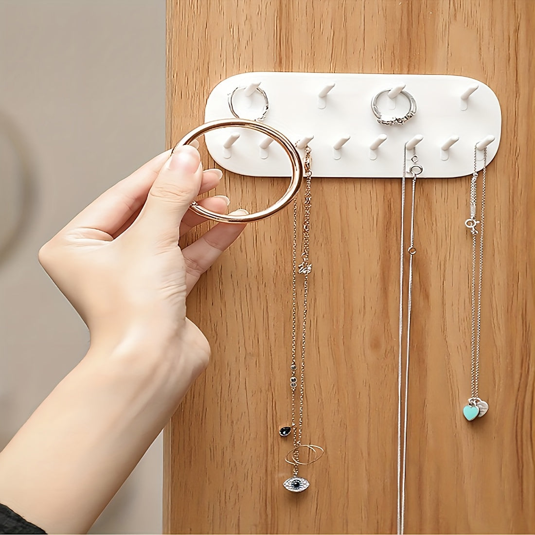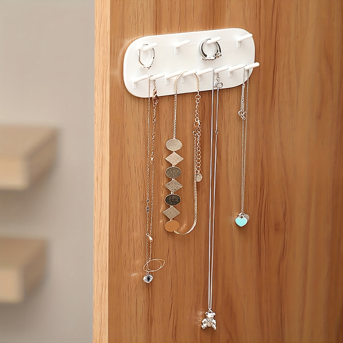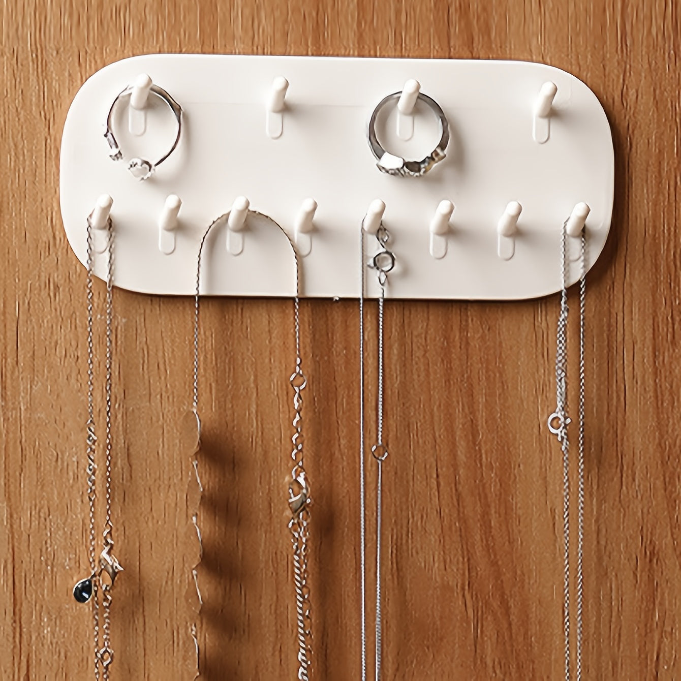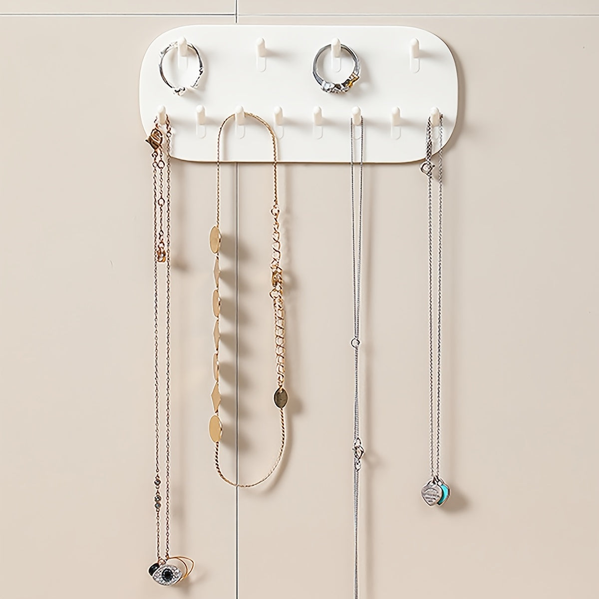 Keep your necklaces, bracelets, and accessories organized with this wall-mounted jewelry storage rack. The rack features 12 hooks for hanging your favorite pieces. It can be easily mounted on the door or wall for convenience.