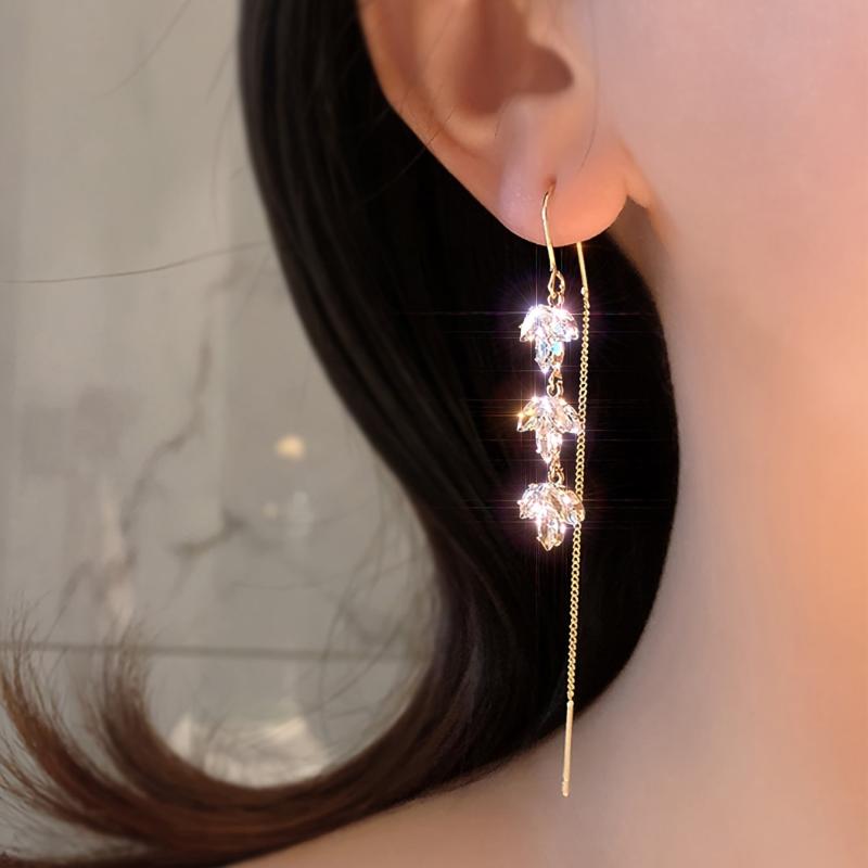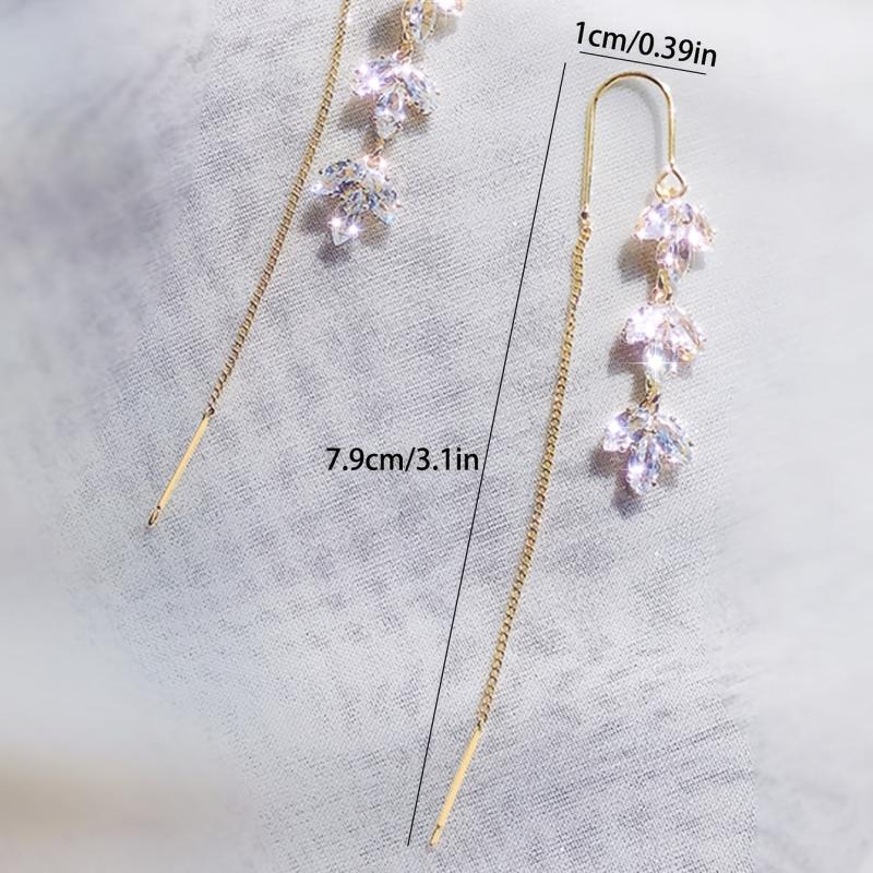 Add a touch of elegance and charm to your outfit with these zircon decorated threader earrings featuring a maple leaf design with long tassel accents. Perfect for parties or casual wear.