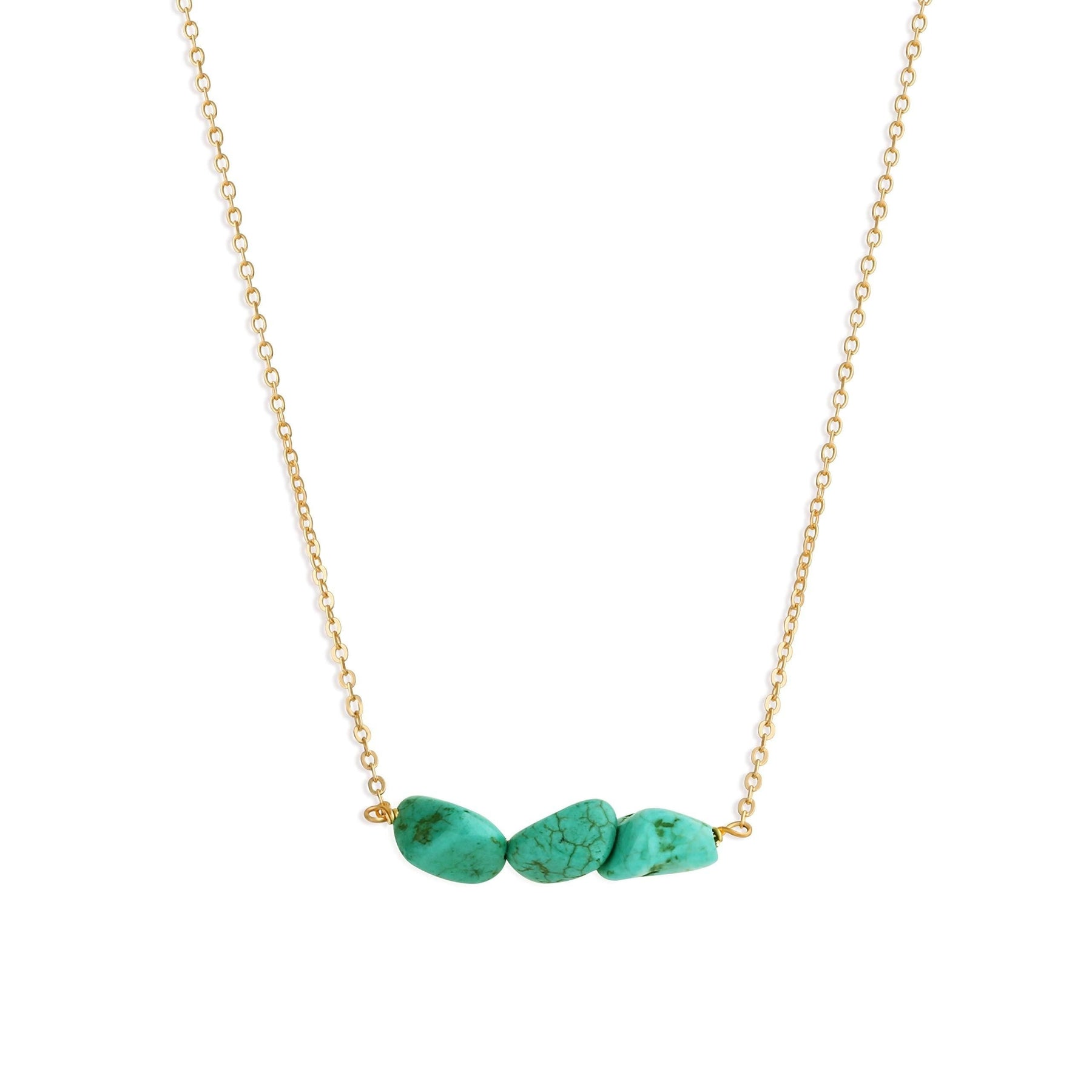 Elegant choker necklace featuring dainty turquoise beads on a bar pendant. This stylish piece is plated with 18K gold for a luxurious look. Perfect for women who love gemstone jewelry.