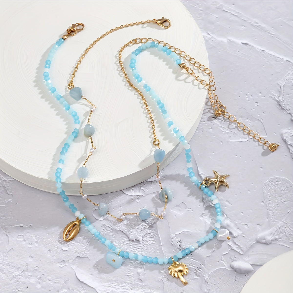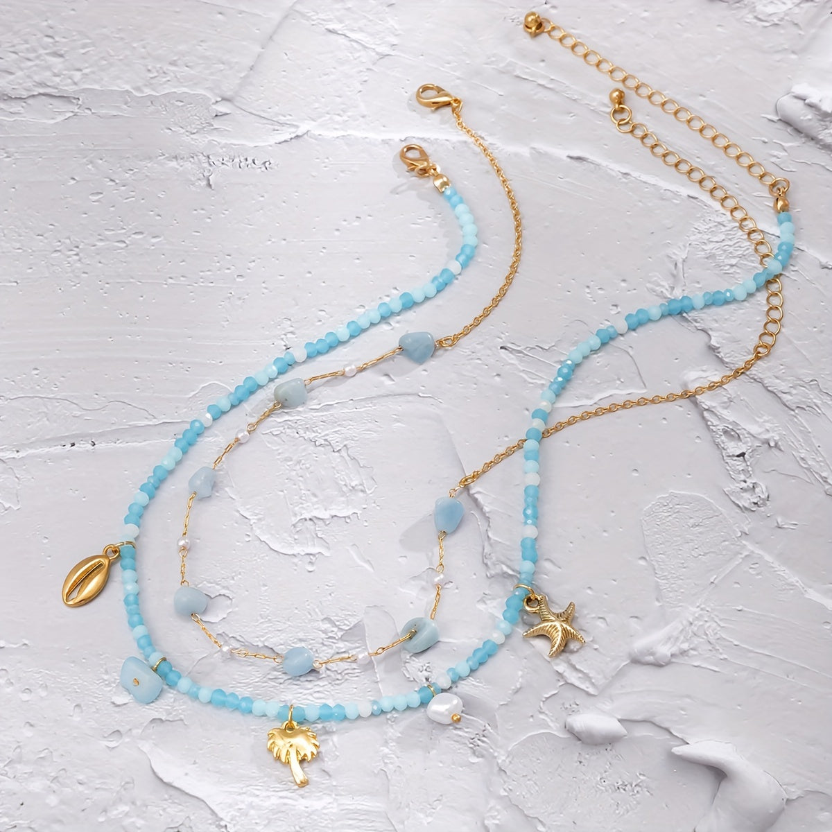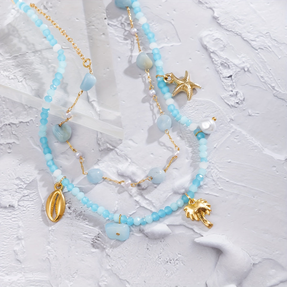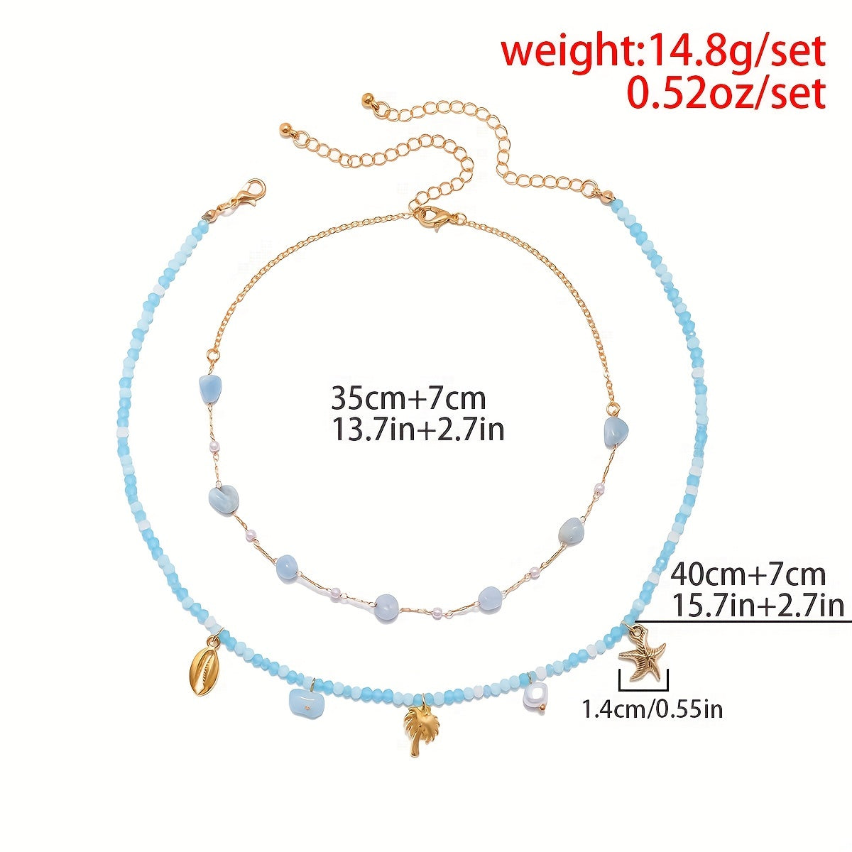 2pcs Crystal Beaded Crushed Stone Faux Pearl Shell Seaside Boho Necklace