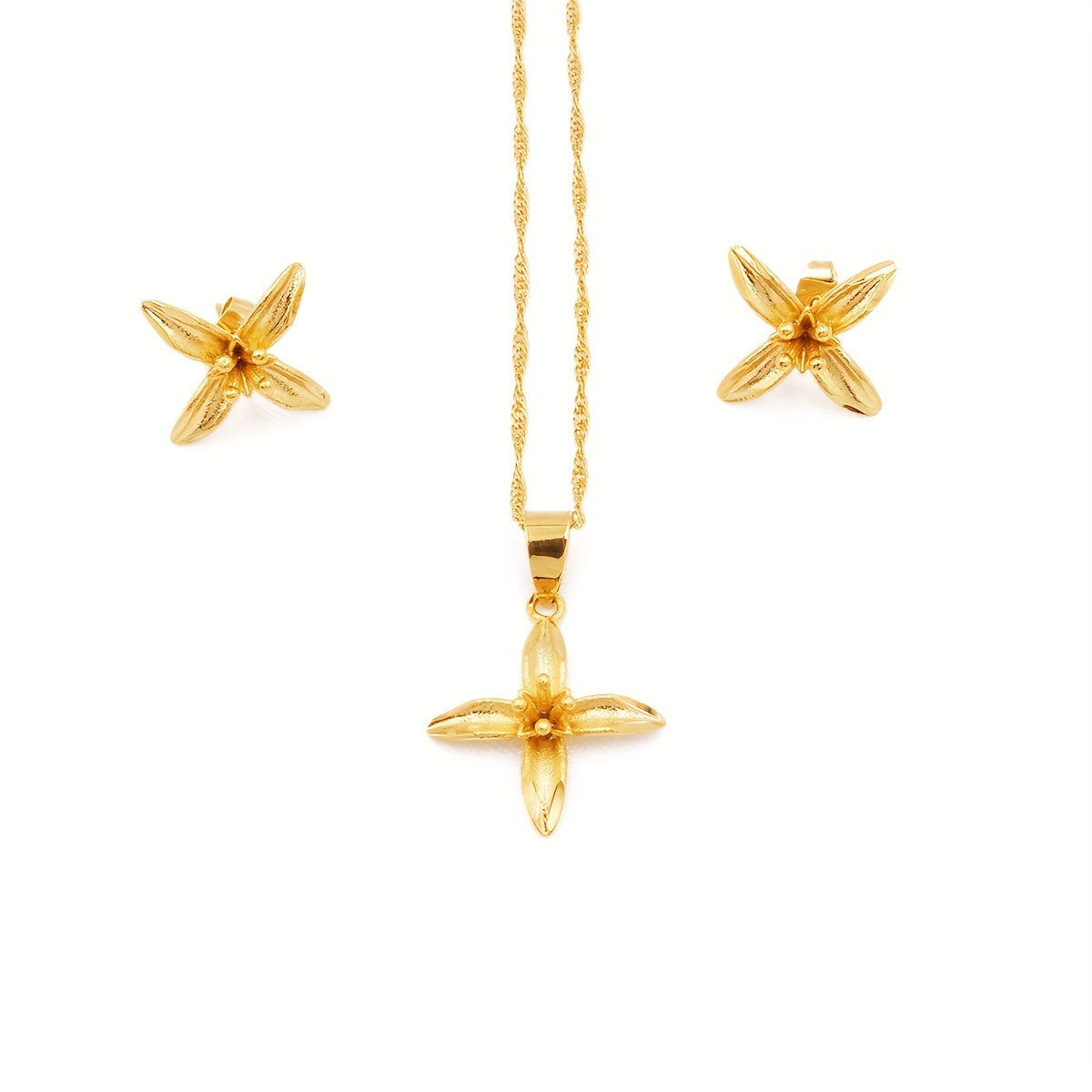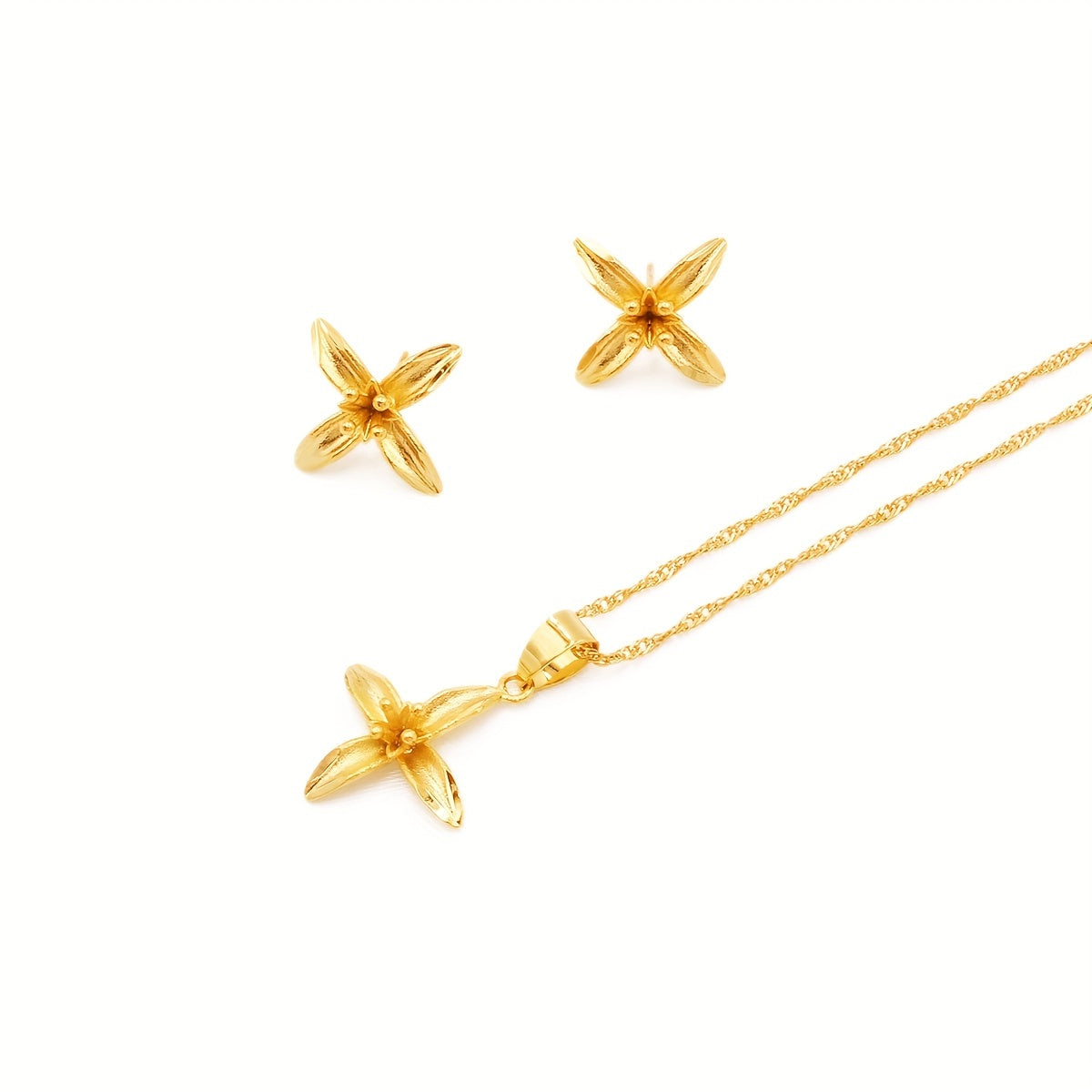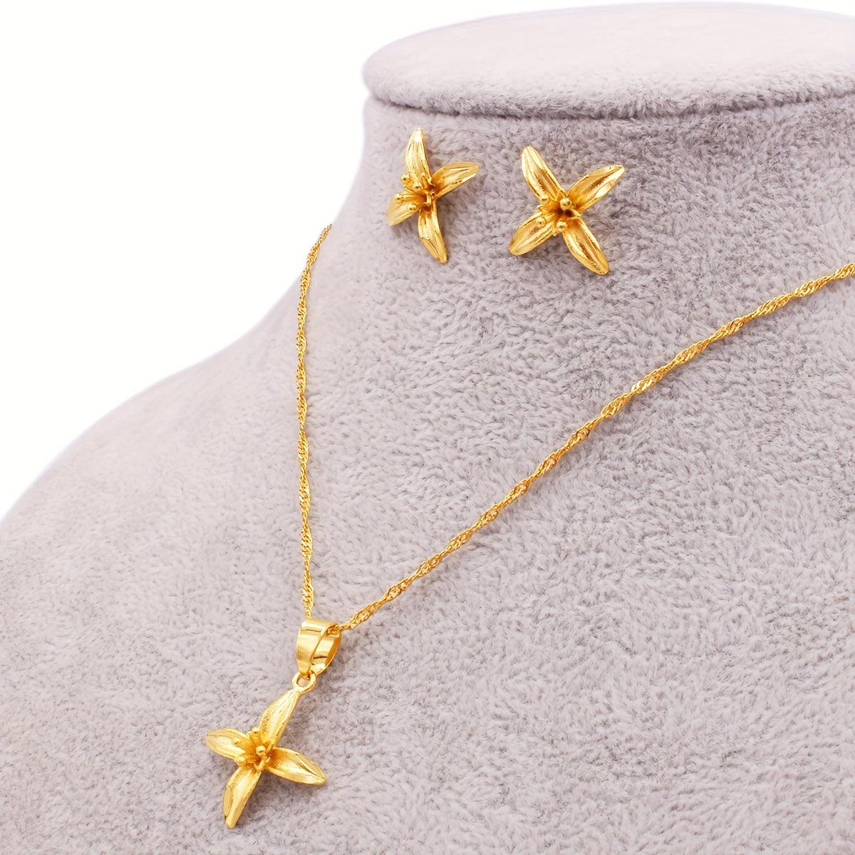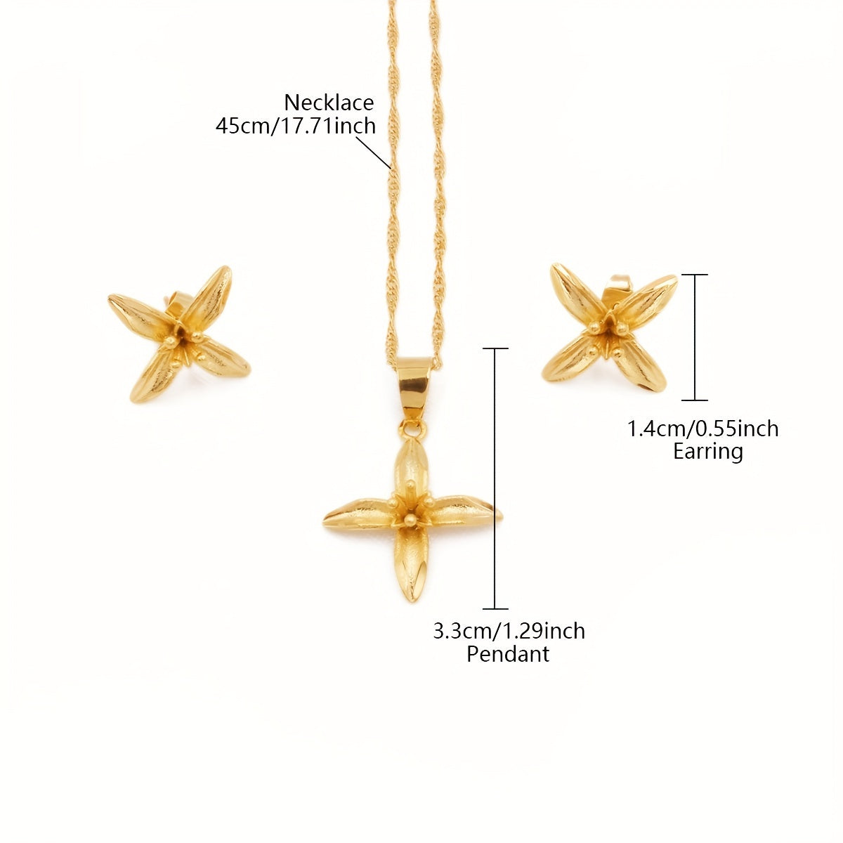 Add a touch of elegance to your daily outfits with this 3-piece jewelry set featuring a flower design. Made with 18k gold plating, this set is perfect for gifting during Christmas or any other special occasion.