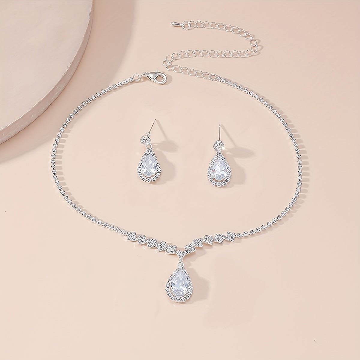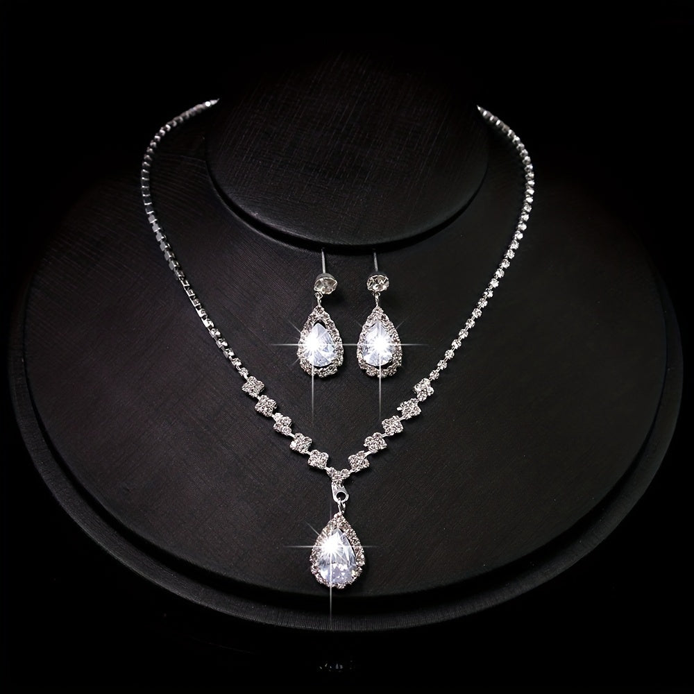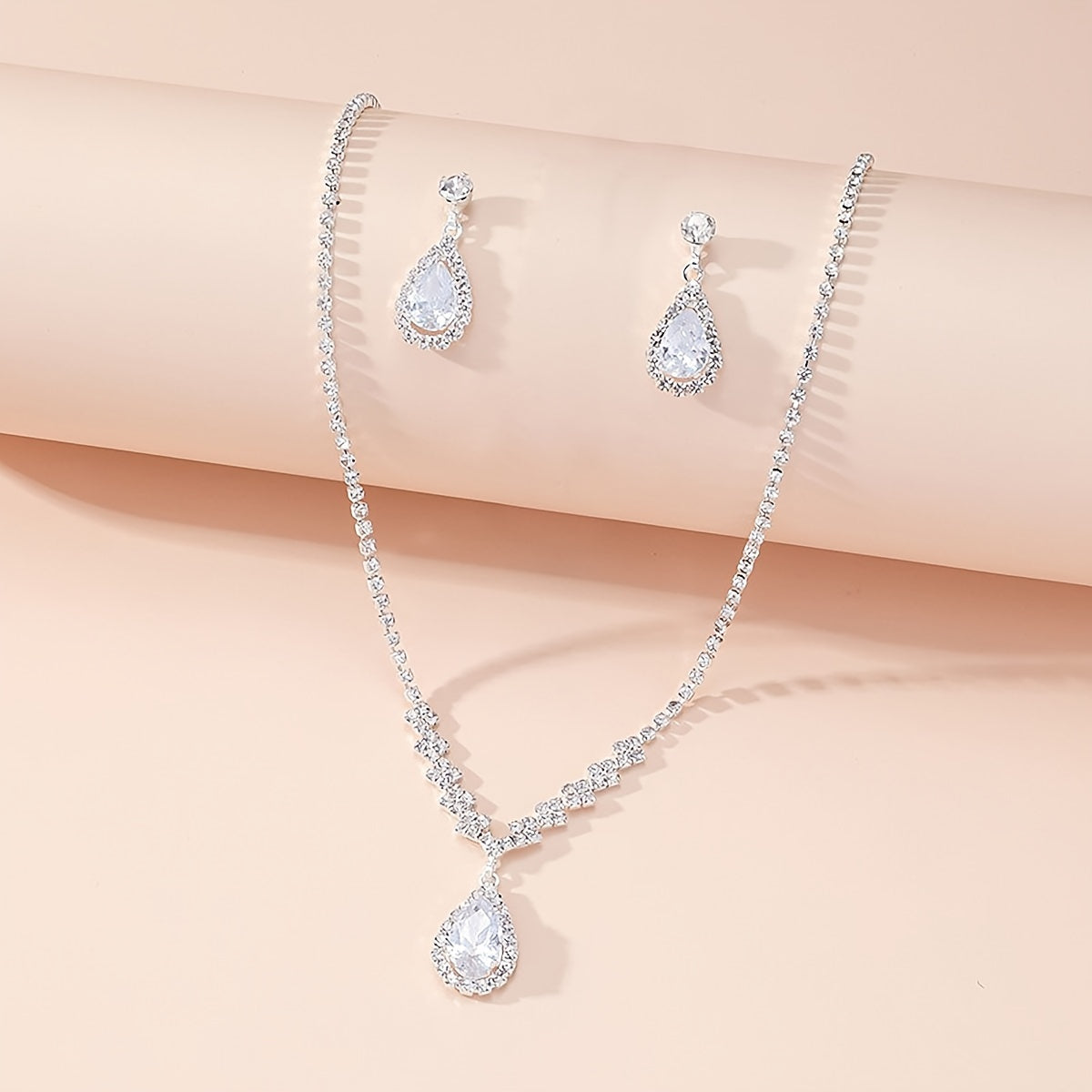Complete your evening party look with this dainty jewelry set. The set includes a pair of earrings and a necklace, all silver plated and adorned with sparkling rhinestones. Makes a perfect birthday gift for her.